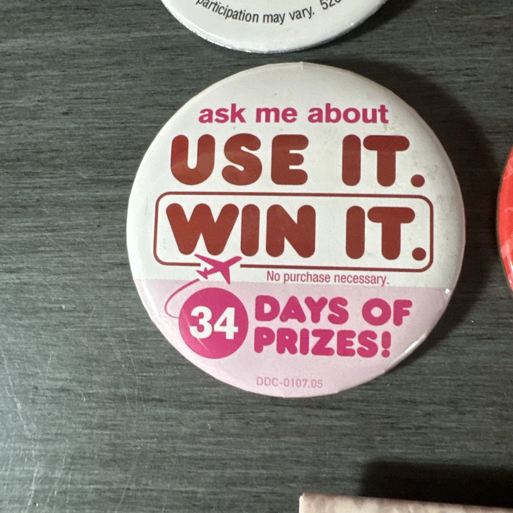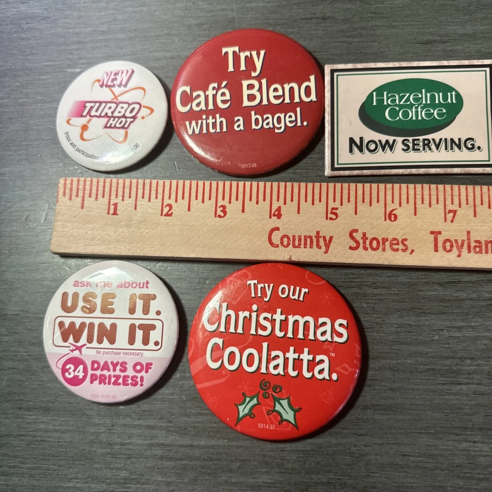 This set of 5 vintage Dunkin Donuts employee pins is a must-have for any coffee and tea enthusiast out there! The colorful multi-color design is perfect for adding a touch of nostalgia to your collection. These original pins were created in 2015 and are a rare find for any collector. The pins feature the iconic Dunkin' Donuts brand and are a great addition to any advertising or food and beverage memorabilia collection. These pins are perfect for displaying on a jacket or backpack and are sure to spark conversation. Don't miss out on this unique piece of coffee and tea history!