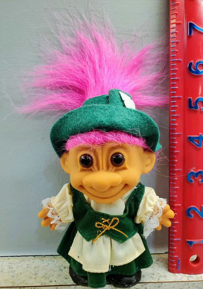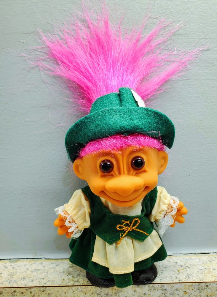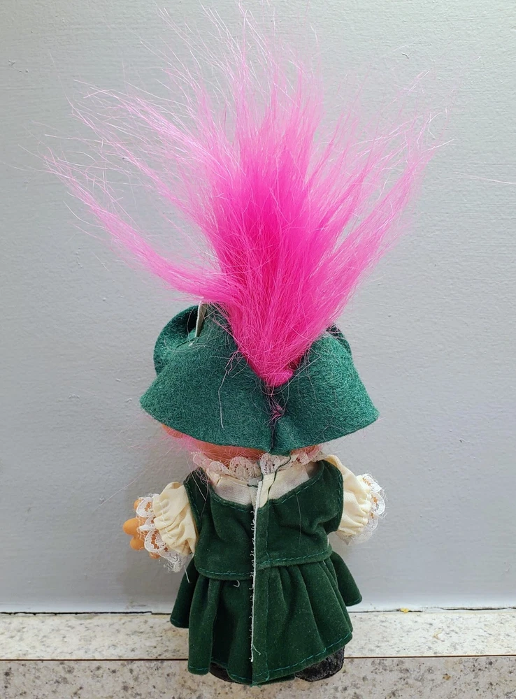 Discover a nostalgic treasure with the Vintage 5" Russ Troll Doll, from the Around the World Series, representing Germany, dressed in a green hat and dress with white shirt adorned with lace, with a back closure. This charming collector's piece, stands at an adorable 5 inches. This troll is a perfect addition for enthusiasts of all ages, from teens to adults, and part of the dolls Around the World Series for collectors. This doll is a delightful little troll that brings a touch of whimsy and a little fantasy into your world.