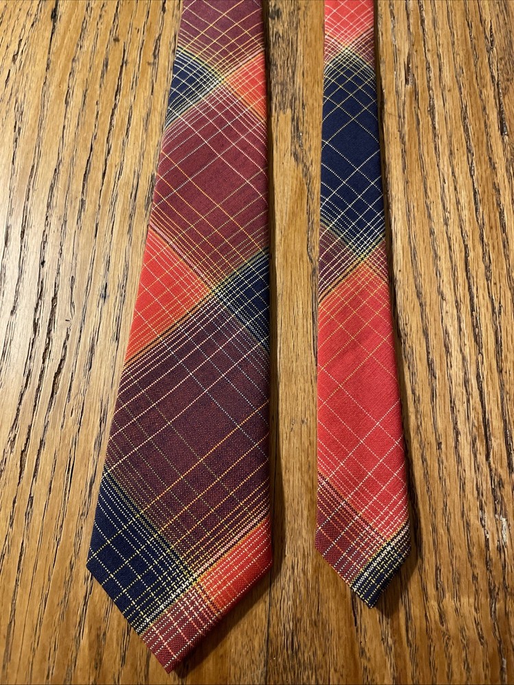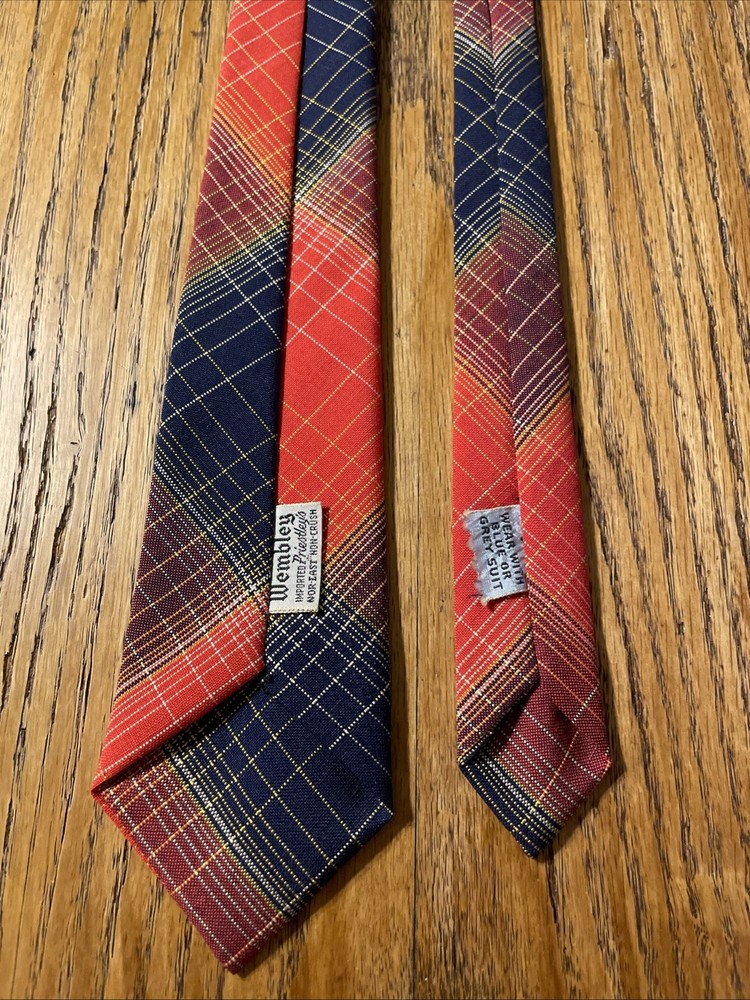This vintage 50s Wembley tie in a colorful shadow plaid design is a stylish addition to any retro or rockabilly-inspired outfit. Made from 100% wool with a non-crush fabric, this slim tie exudes a sense of American nostalgia and sophistication. Perfect for men looking to add a unique and classic touch to their ensemble, this tie is a true standout piece. BEAUTIFUL, minty fresh example of one of these old Priestley’s wool ties, if you’re familiar finding one of these this nice is very rare. If you see them at all they have such finely worsted wool that’s so rich they tend to always have moth damage, but This one is absolutely sharp and pristine.