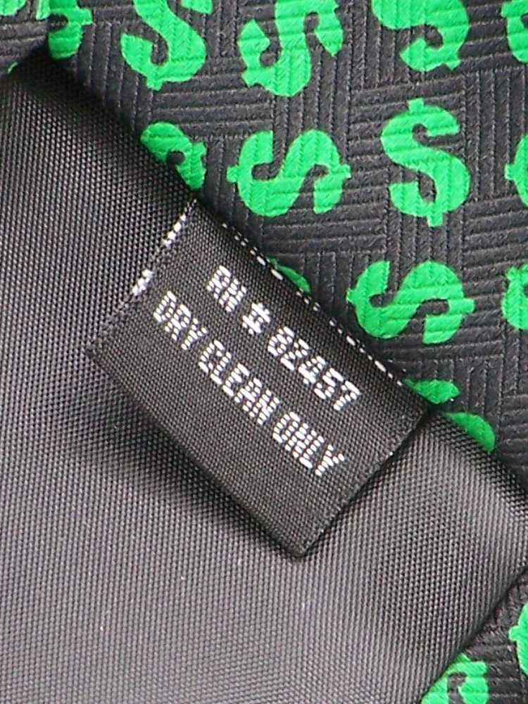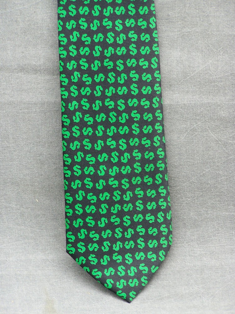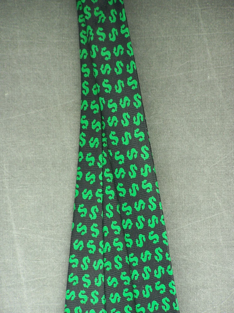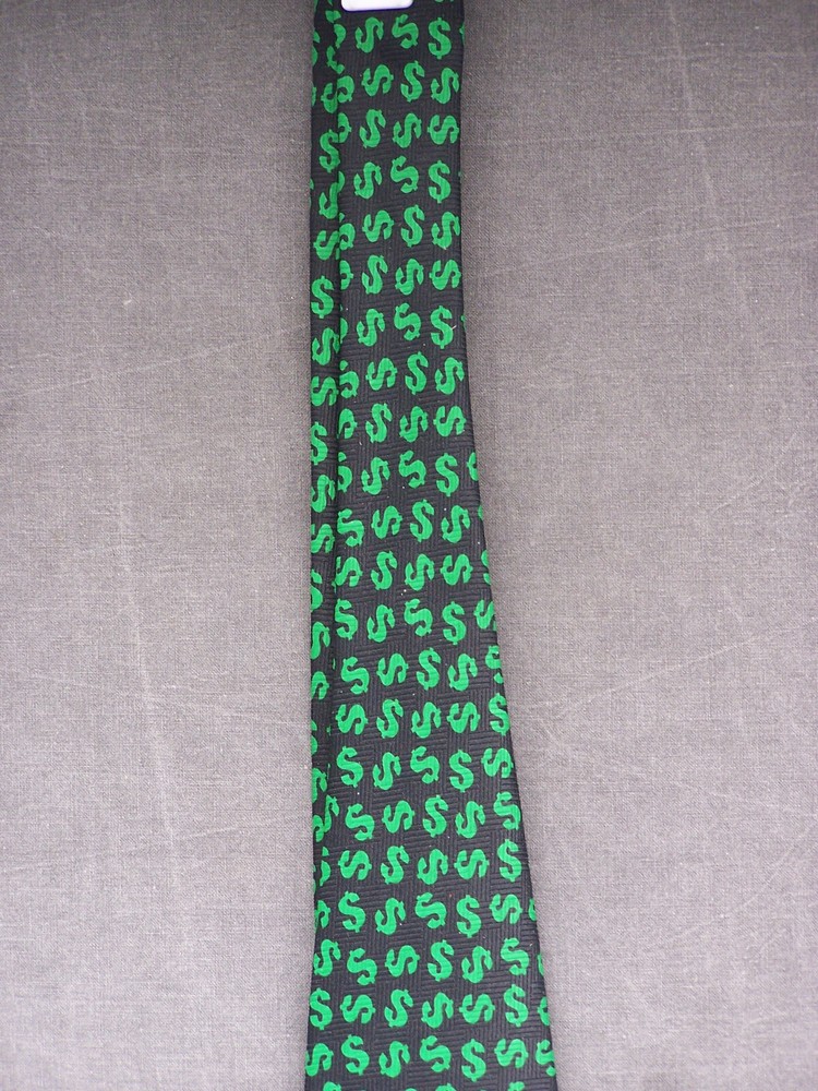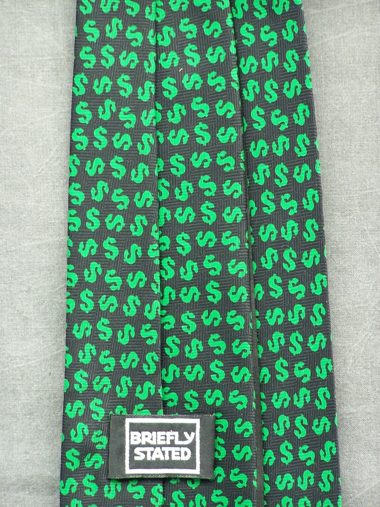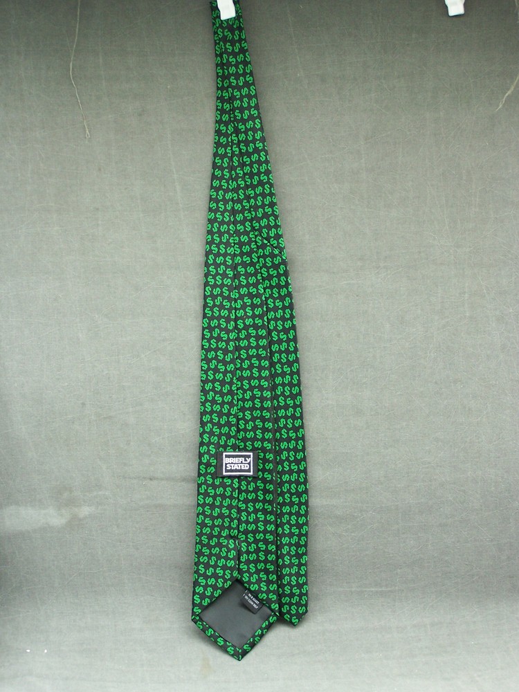 Seller Notes: “It is in very good condition showing no wear.” Color: Black Item Width: Wide Material: Polyester Handmade: No Item Length: Classic (57"-60") Brand: Briefly Stated Department: Men Vintage: Yes Country/Region of Manufacture: Korea, Republic of Type: Tie Character: Dollar Sign