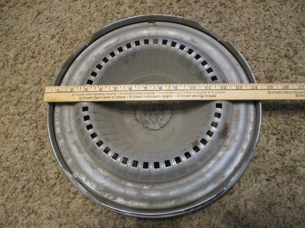 Used wheel covers. There are a few small dents. Paint is worn on black area. Some discoloration on center area. Please look at detailed pictures for condition. If you need more pictures please ask. See pictures for size.