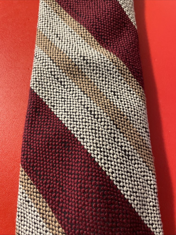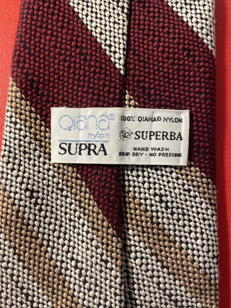 Elevate your wardrobe with the Superba vintage tie, a timeless piece that captures the essence of the Mod, Disco, and Retro themes. Crafted from durable Qiana Nylon, this tie is woven with a classic striped pattern in vibrant, multicolor hues that stand out with impeccable style. The wide width of the tie adds a touch of sophistication to the piece, making it an ideal choice for the fashion-forward individual. Proudly made in the United States, this retro necktie is a testament to the quality and style of the 60s and 70s era. Perfect for adding a vintage touch to any outfit.