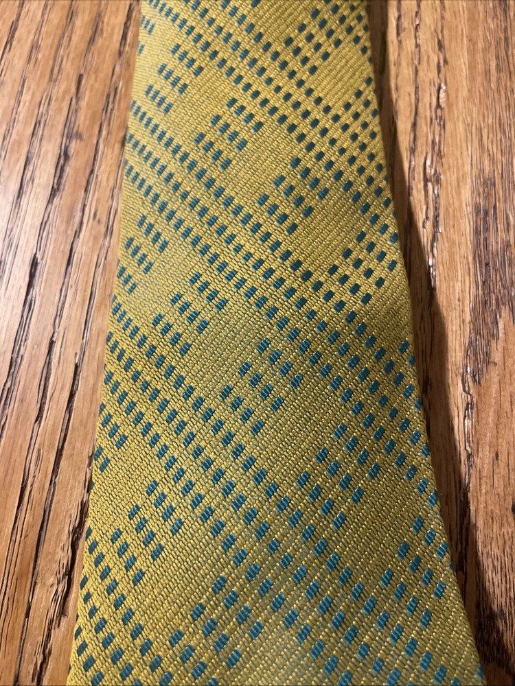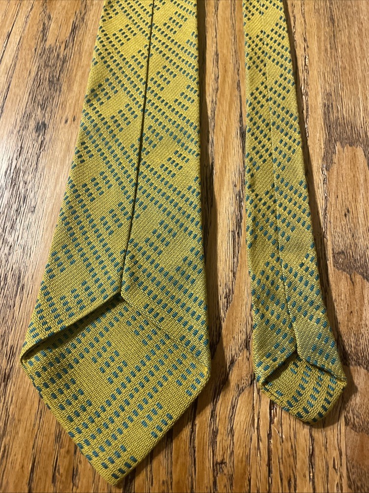 The product is a vintage 60s acetate wide tie with a geometric pattern in multicolor, perfect for those embracing a retro Mod or Disco style. Made in the United States, this woven tie adds a touch of nostalgia to any outfit. The wide width and textured material make it a standout accessory for men looking to channel their inner 60s fashion icon.