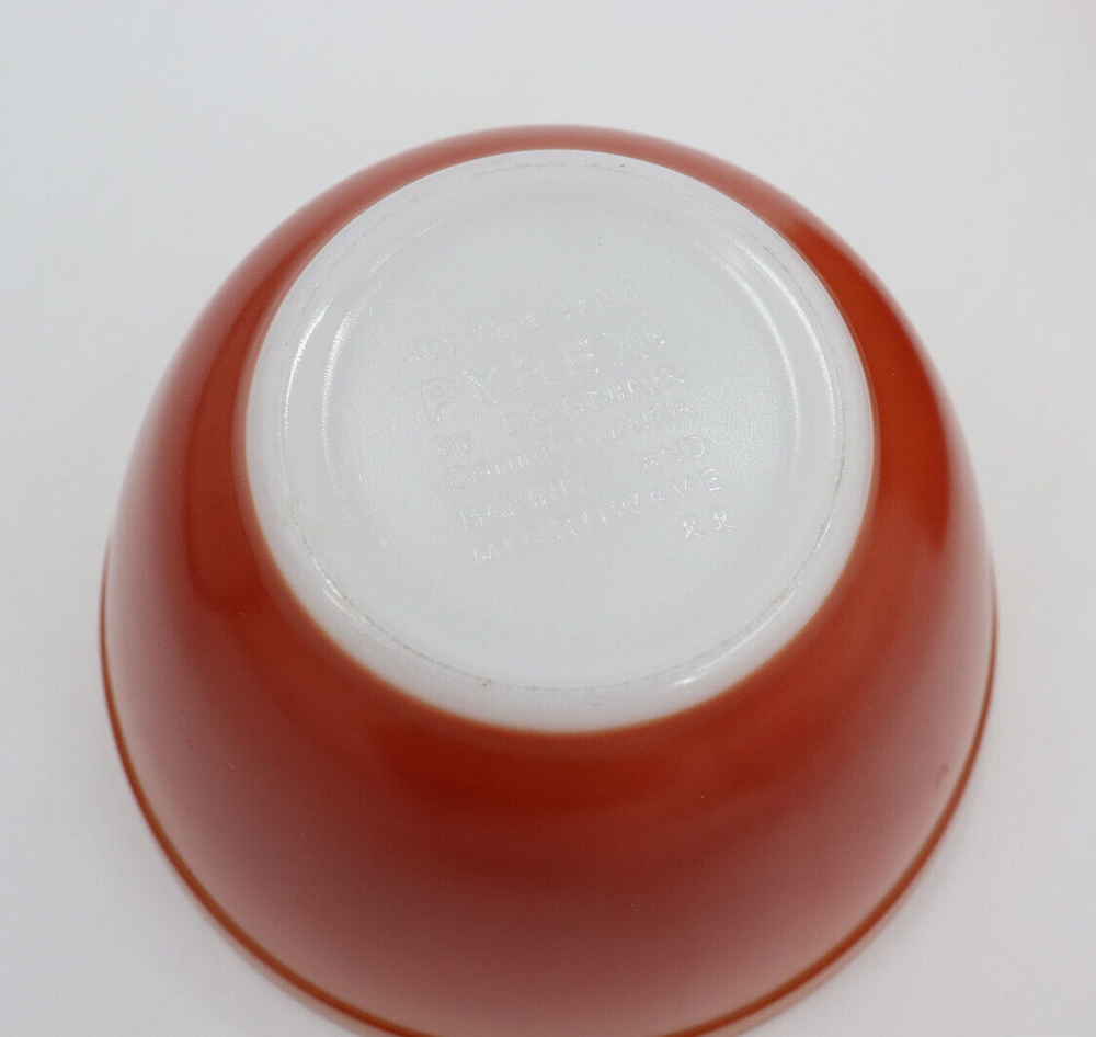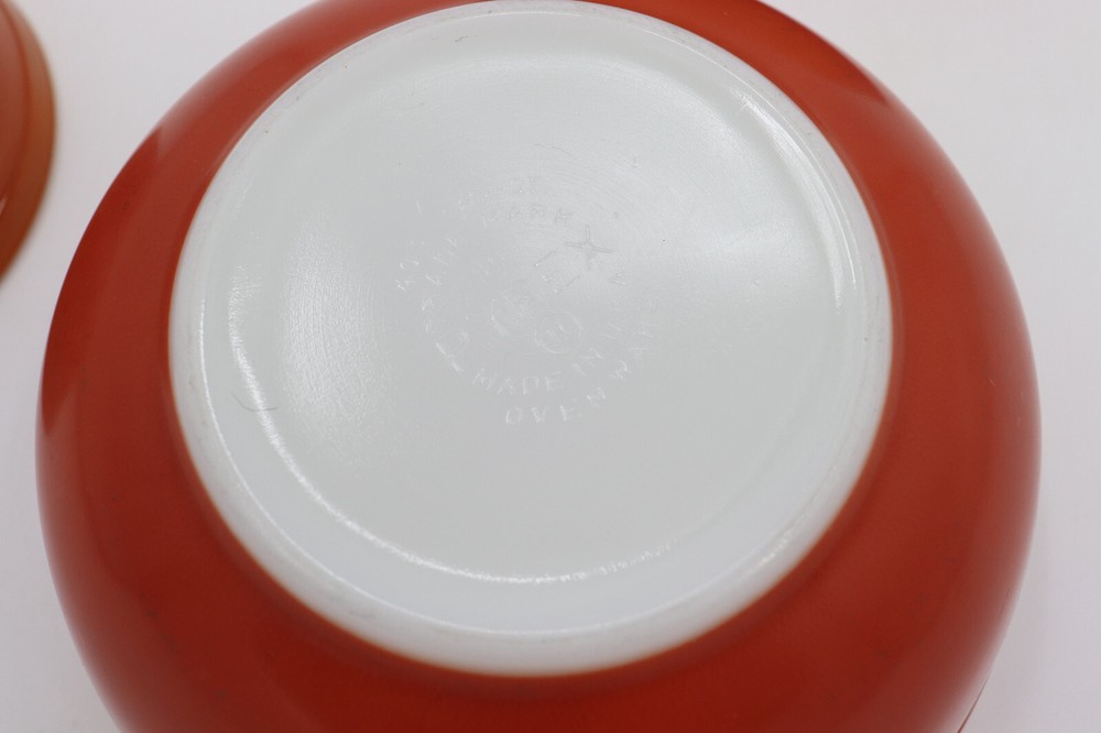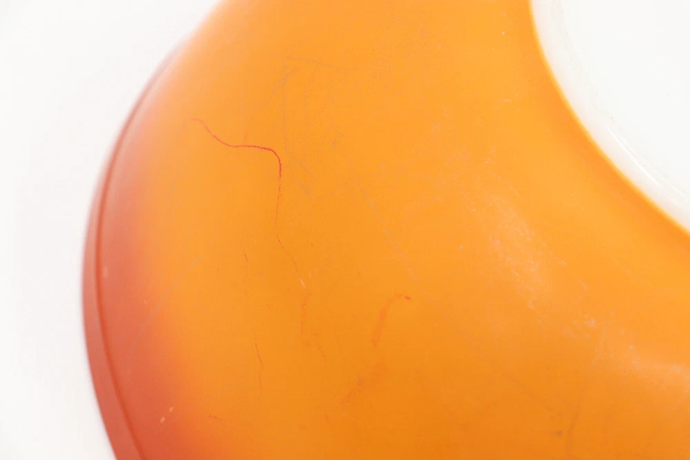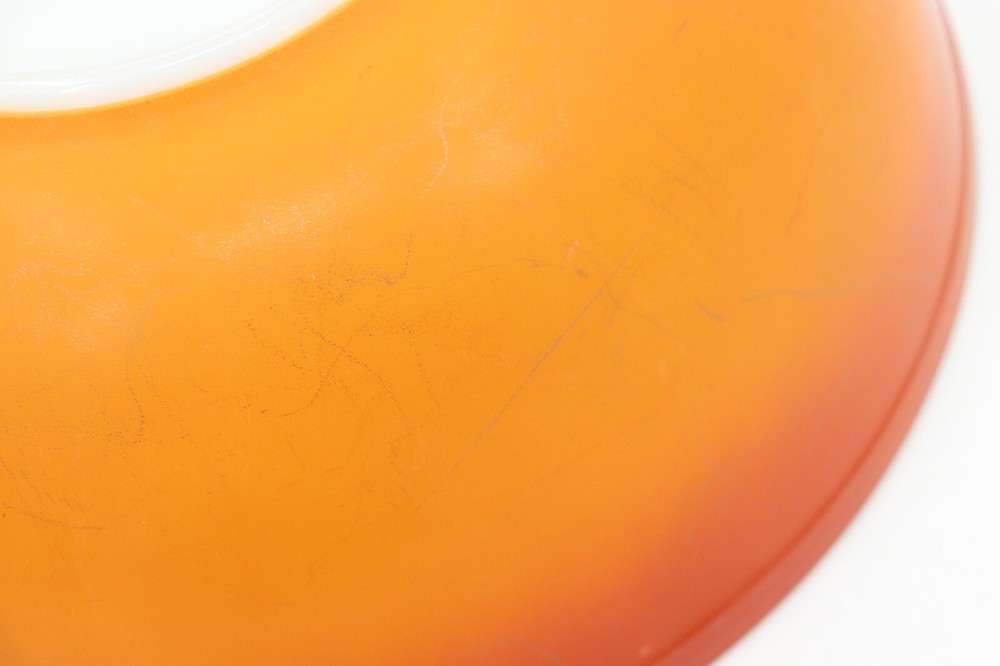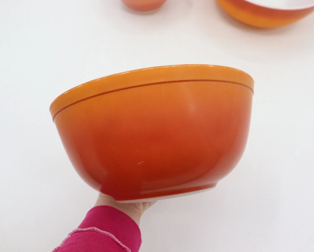 Vintage Pyrex Dishes in the pattern Flameglo, which is a red to orange ombre. These mixing bowls were made in the 1970s for a short period of time. It is missing one nesting bowl, so it is not a complete set. These dishes are great for use or to add to your Pyrex collection. The bowls range from good to fair condition. Shows signs of wear from age and use, such as discoloration, scratches and other markings. The largest bowl in the set has the most scratches. See photos for details. From largest to smallest, the diameter of the bowls measure as followed: 10.5", 8.75", 5.75". Message me with any questions!