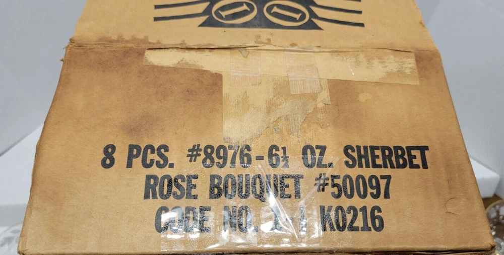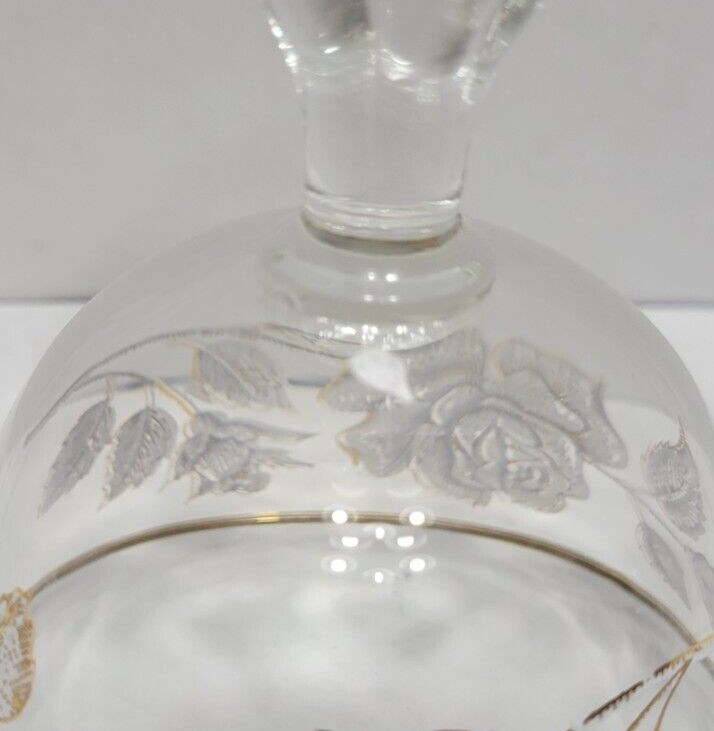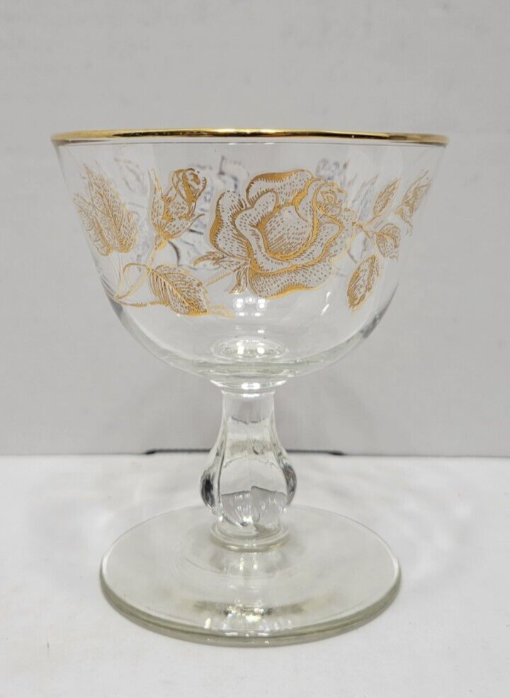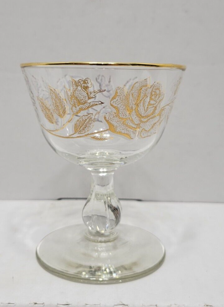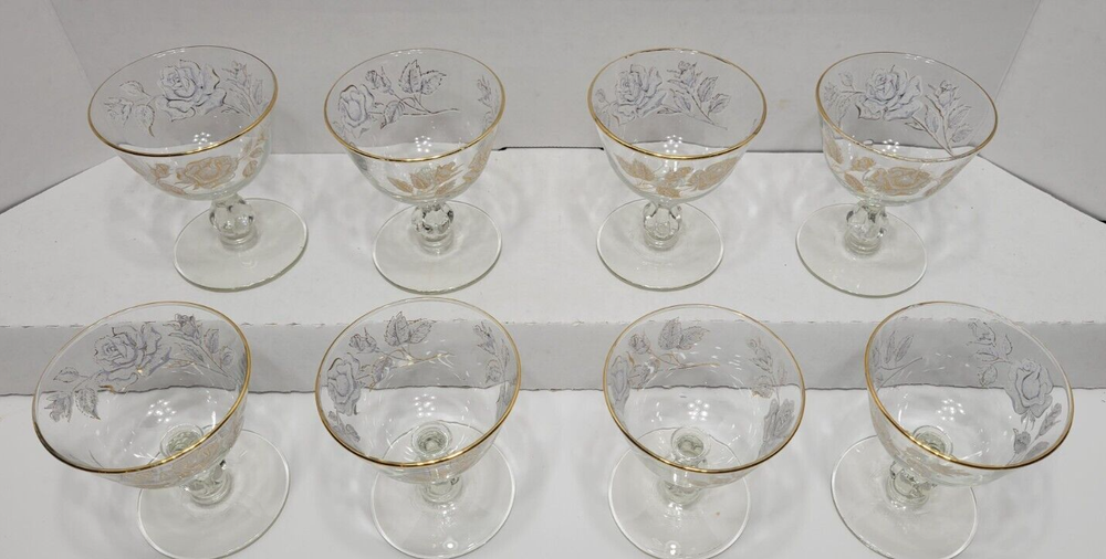 8 Libby "Rose Bouquet" Champagne Cordial Sherbet Glasses 1960s Vintage. They measure approximately 4 1/4 inches tall x 3 3/4 inches across the rim. Clear glass with white roses and gold trim. Perfect condition. Stored In original Box... No chips or cracks 1 glass has painting defect. Came in original box but it was water damaged. See photos.