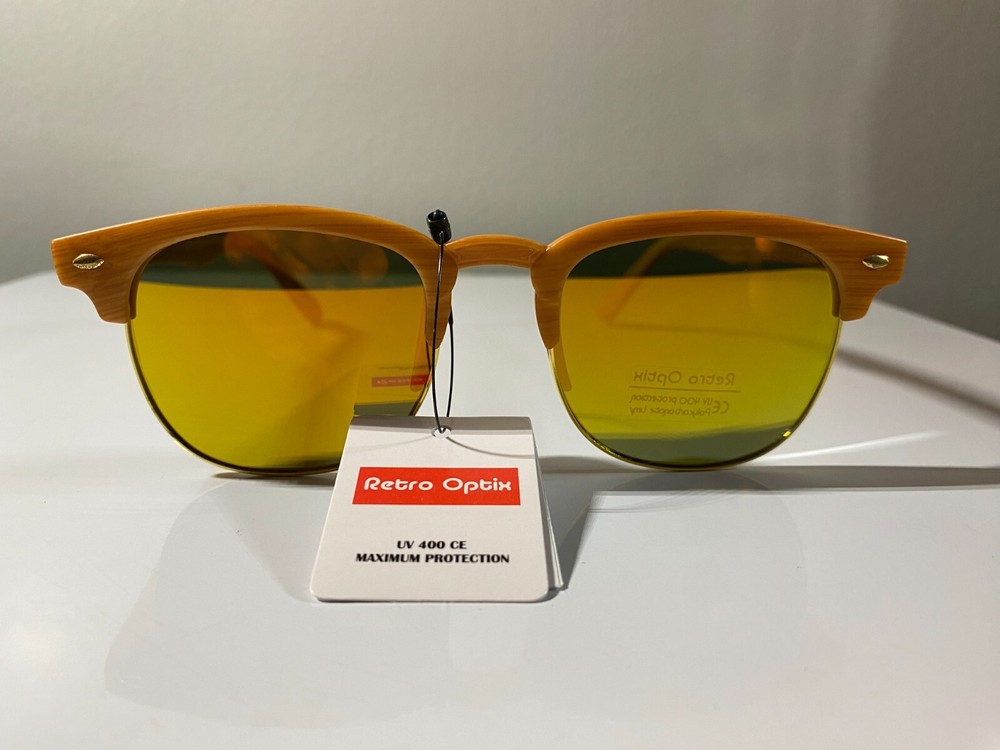 Classic 60's style sunglasses with wood like frame and yellow reflective lenses.