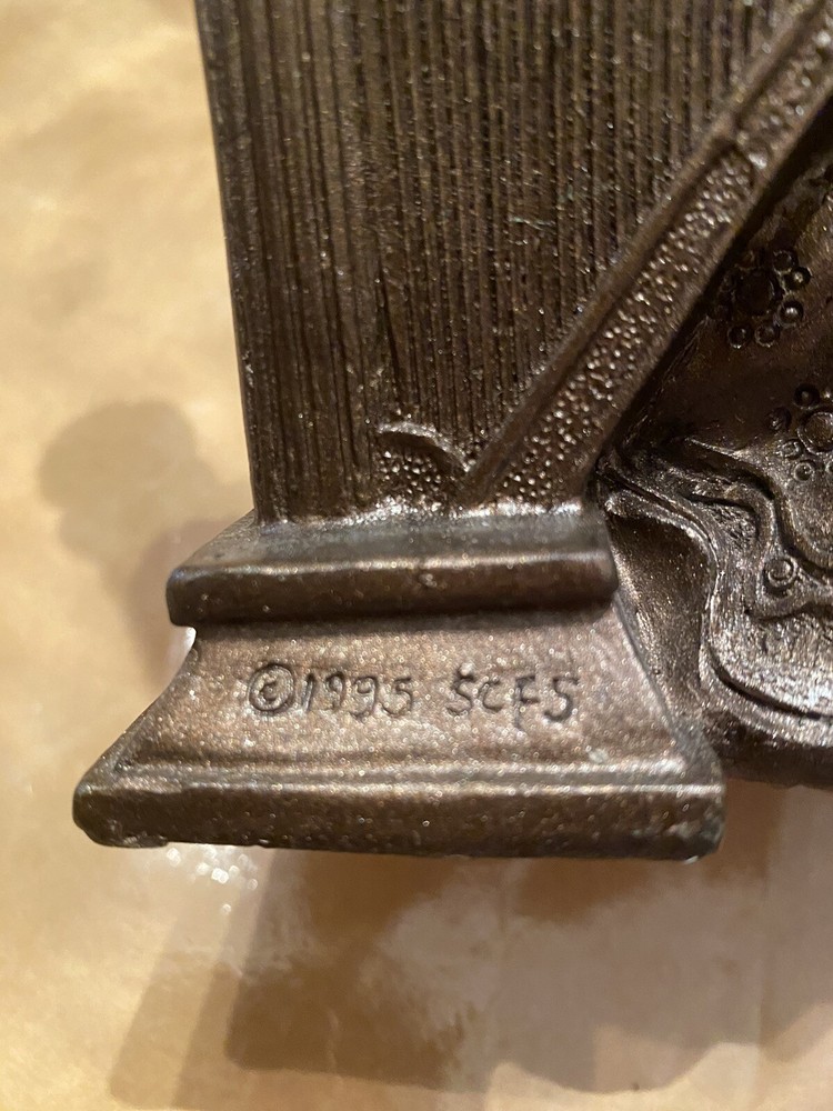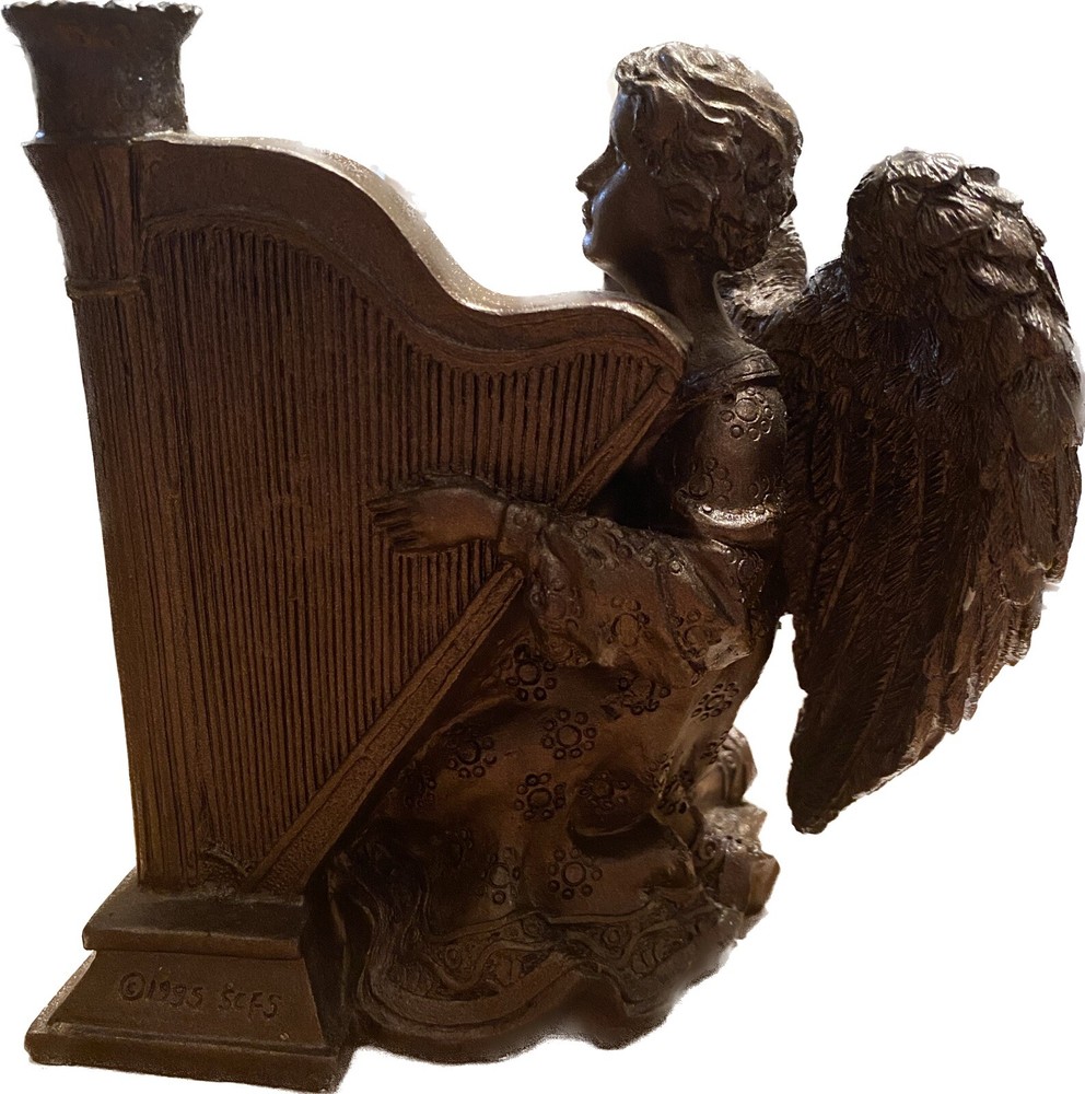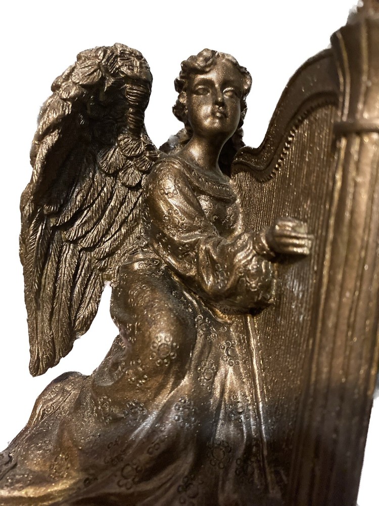 This vintage figurine is a beautiful addition to any collection. The SCFS artist created a stunning resin harp playing angel in antique gold finish. The 3D effect and musical features make this figurine a unique and captivating decorative piece. It measures 6 inches in length and is perfect for any room. This collectible item was manufactured between 1990-1999 and is in excellent condition.