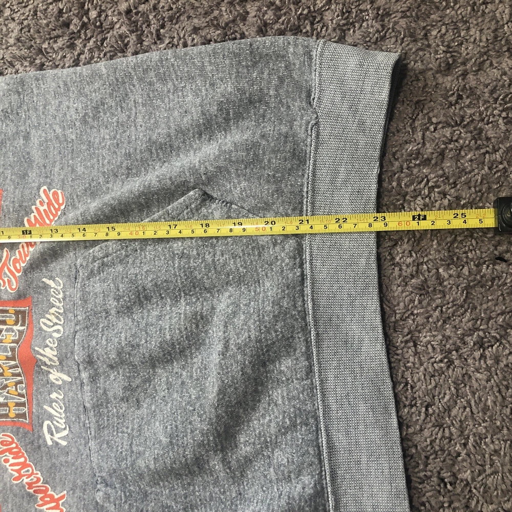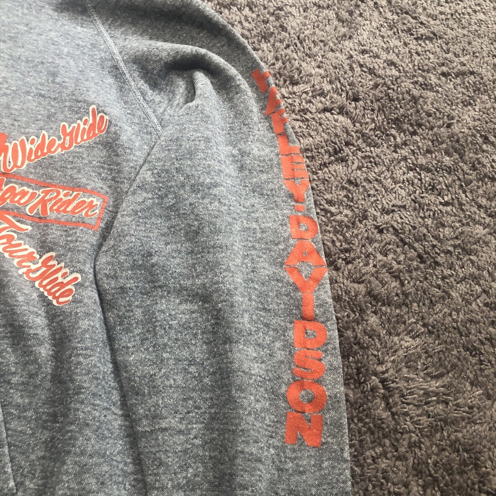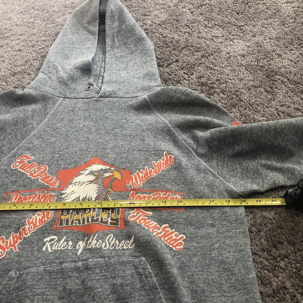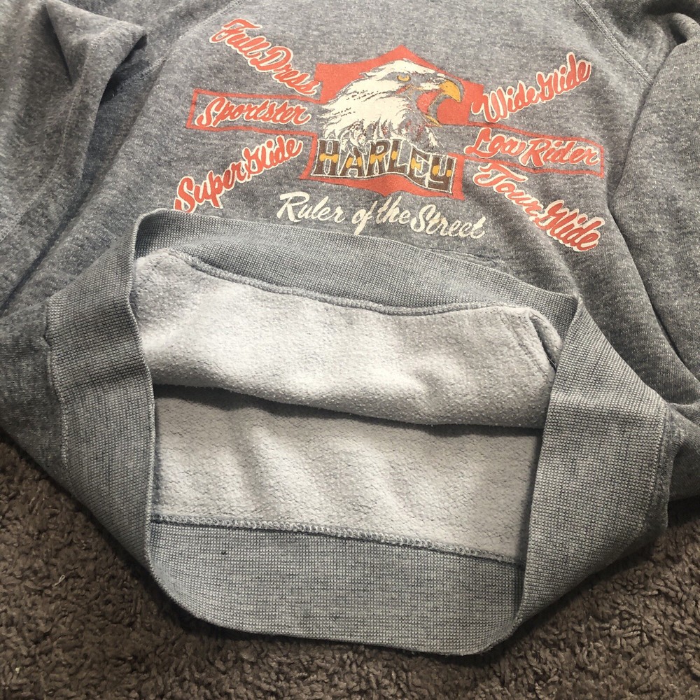 Vintage 70s 80s Harley Davidson Eagle Raglan Hoodie Size Small Grey Tilley Inc. Good condition for age with some flaws Size tag is missing, but measurements are provided in photos. A couple holes under each arm, stitching up could be a fix. Small hole at pocket corner. Small hole at bottom hem too. Missing drawstring. Graphics look to be in really nice looking shape.