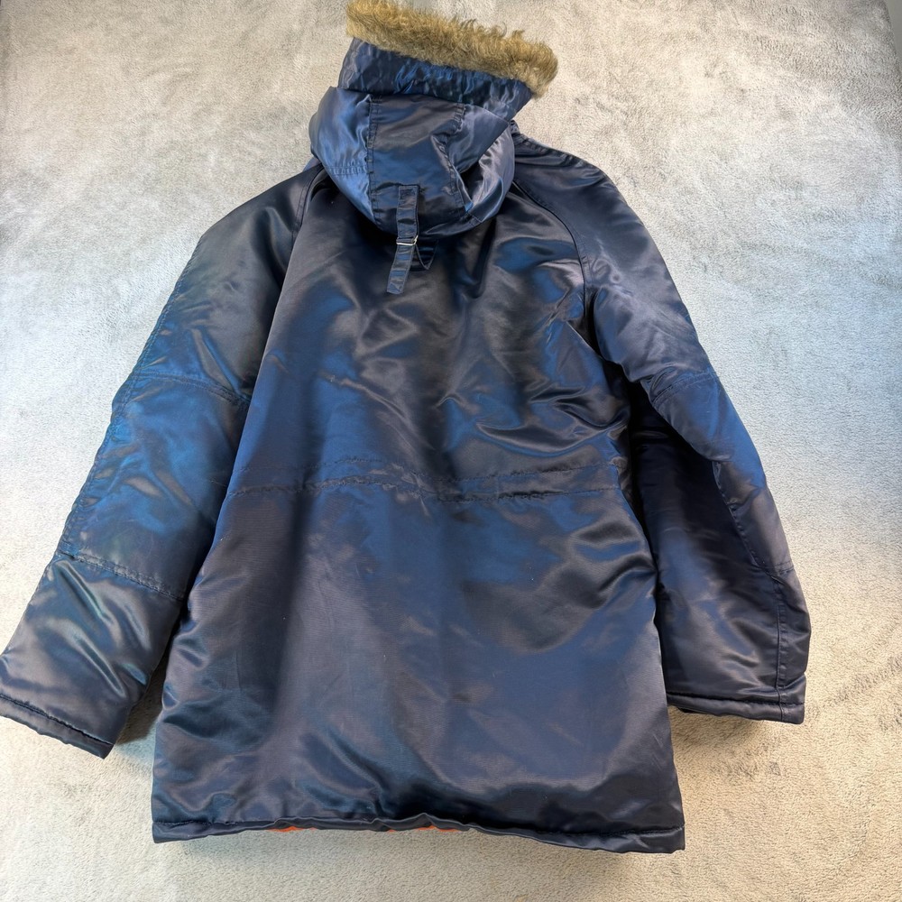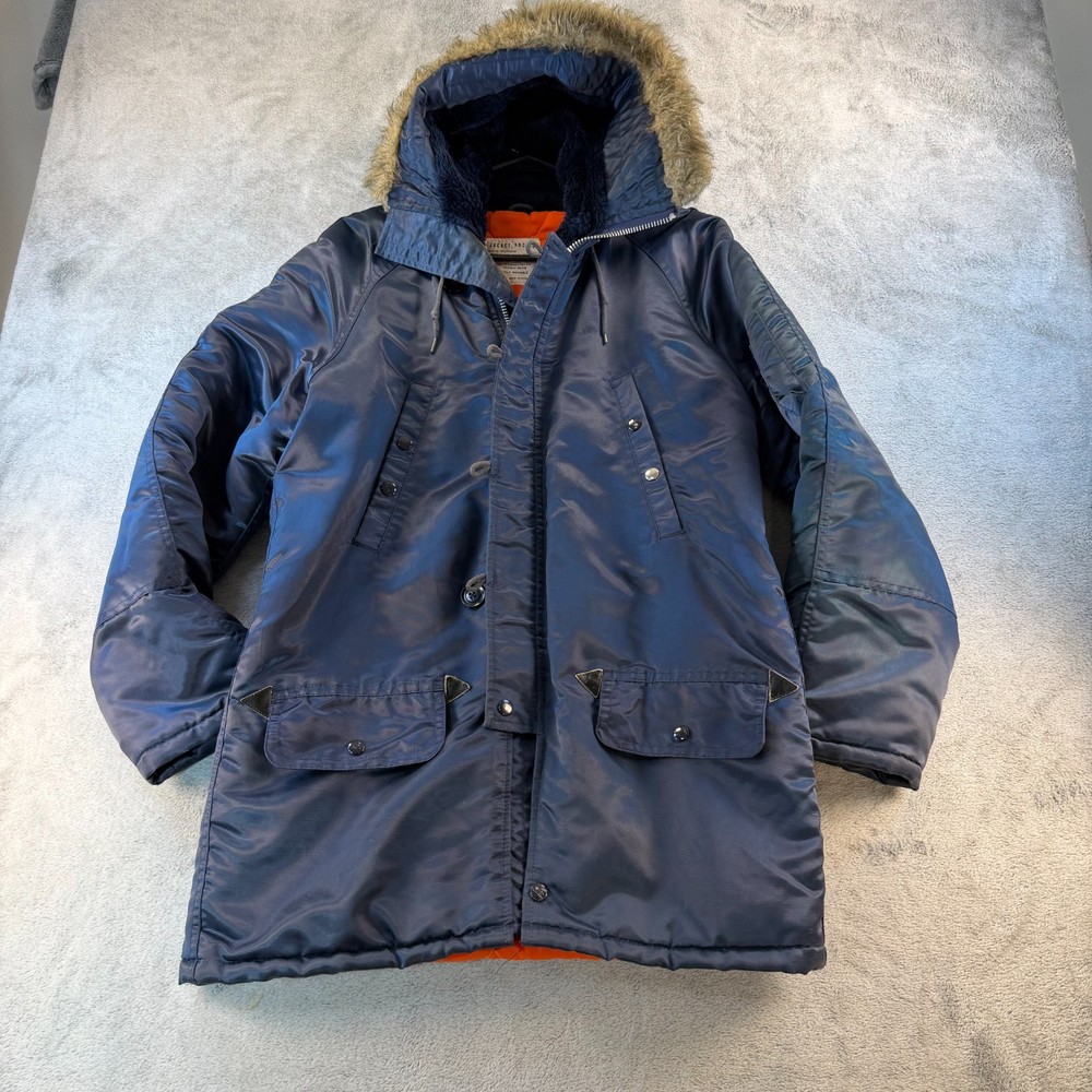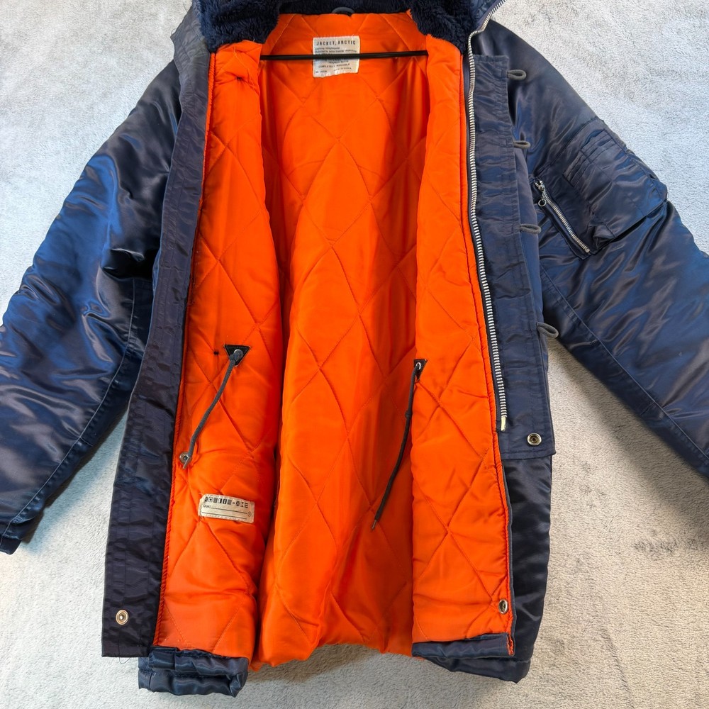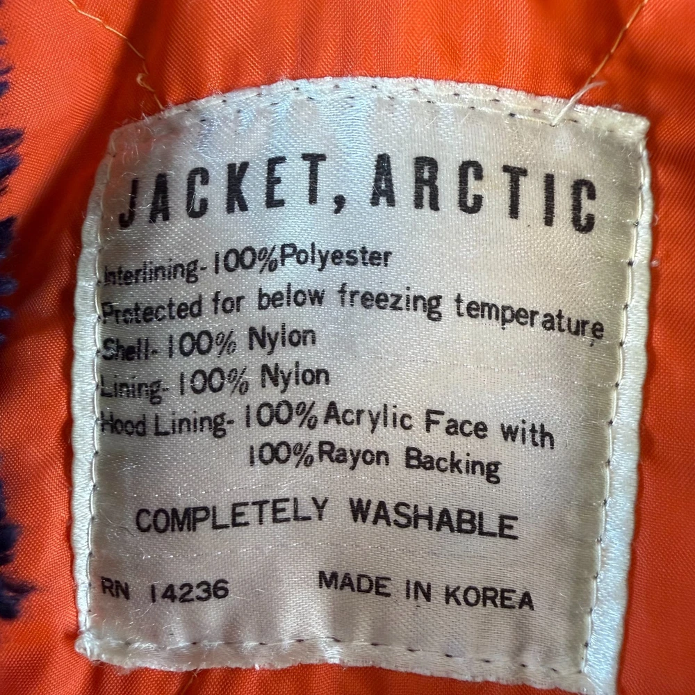 Vintage Arctic Parka – Classic 70s Cold Weather Coat This is a true vintage arctic parka featuring a nylon shell, bright orange quilted lining, and faux fur trimmed hood. Classic military-inspired cold weather styling. Details: • Made in Korea • RN 14236 • Shell: 100% Nylon • Interlining: 100% Polyester • Hood Lining: Acrylic face with rayon backing • Below-freezing protection rating • Fully washable Features: • Faux fur trimmed hood • Quilted high-visibility orange lining • Heavy-duty front zip with snap/button storm flap • Multiple front pockets • Interior pocket Condition Notes: Interior pocket has tearing. Some front buttons are missing. Shows normal vintage wear. Please review photos carefully. Measurements are shown in photos for accurate fit. Vintage sizing may differ from modern sizing. Great authentic 70s/early 80s cold-weather coat with strong nostalgic appeal. 💛 Thanks for supporting our small family business!