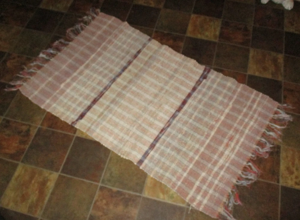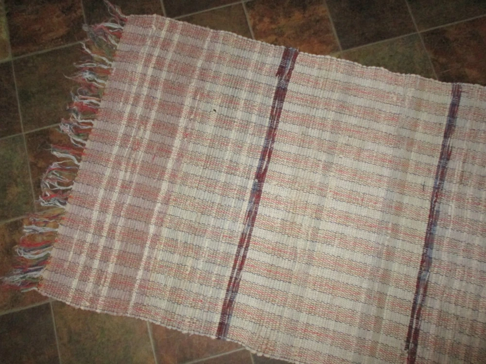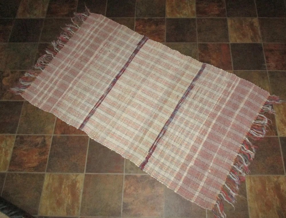 Lovely Vintage 1970s Rag Rug or Runner. Rectangle in colors of mostly Off-white, Tan, some very dark wine-red in the stripes, and other colors mixed in. VERY WORN Fringe . I am not a textile expert, so I think this feels like cotton and cotton/blend. SIZE: 46" long, including WORN fringe. 25" wide. Variations due to hand looming. This will be folded and rolled for shipping. Condition. Used, Vintage. Clean. I see no holes, but there is age-use related wear, including fraying, pulled loops, though none pulled through, and inconsistencies/irregularities due to this being hand made. There is one very small black spot, possibly paint. There is an overall well-used and many times washed look. No odor. Thanks for looking. Please see my other items.