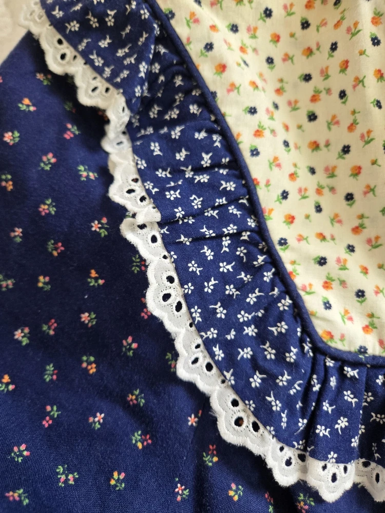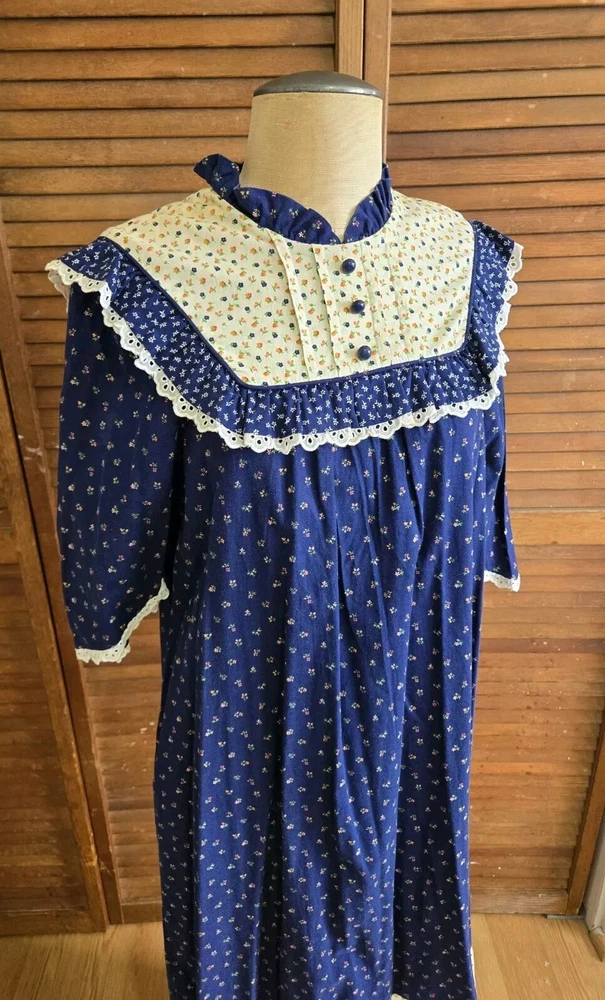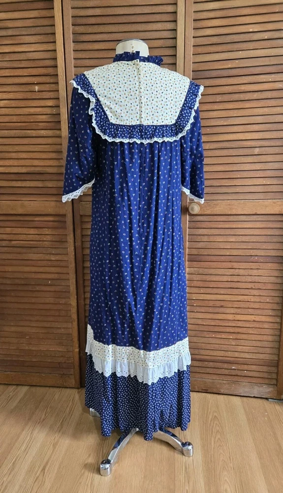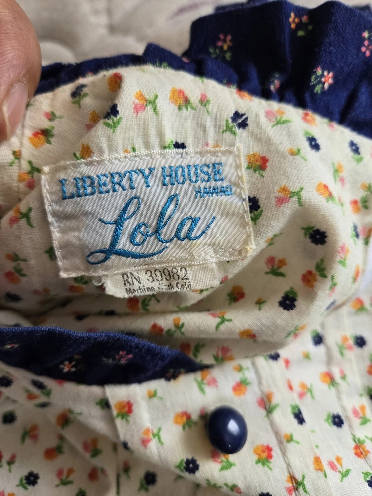 Embrace the nostalgic charm with this Vintage 70's LOLA HAWAII Muumuu Hawaii Traditional Dress. Featuring in beautiful mini floral print, this maxi dress is a delightful ode to the carefree spirit of the '70s. The comfortable cotton fabric, woven in a regular size S, ensures a relaxed fit perfect for casual gatherings or laid-back travel adventures. The dress showcases a closed neckline with half puff sleeves, adding a touch of whimsy to its classic muumuu style. Accented with a ruffle and zip closure, this multicolored piece is machine washable for easy care. Whether you're attending a party or enjoying a tropical getaway, this dress encapsulates the essence of a bygone era with a timeless appeal. The dress came from a collector. She is now in her 70s. The dress was purchased in the 70s. Blue with mini floral print, eyelet ruffed, cotton fabric. It fits a size small from armpit to armpit is 17 inches across lenght is 52 inches long. zip back opening