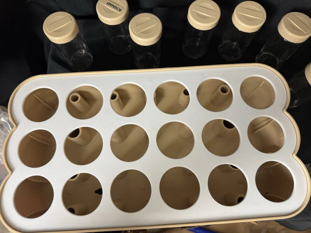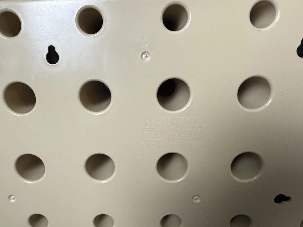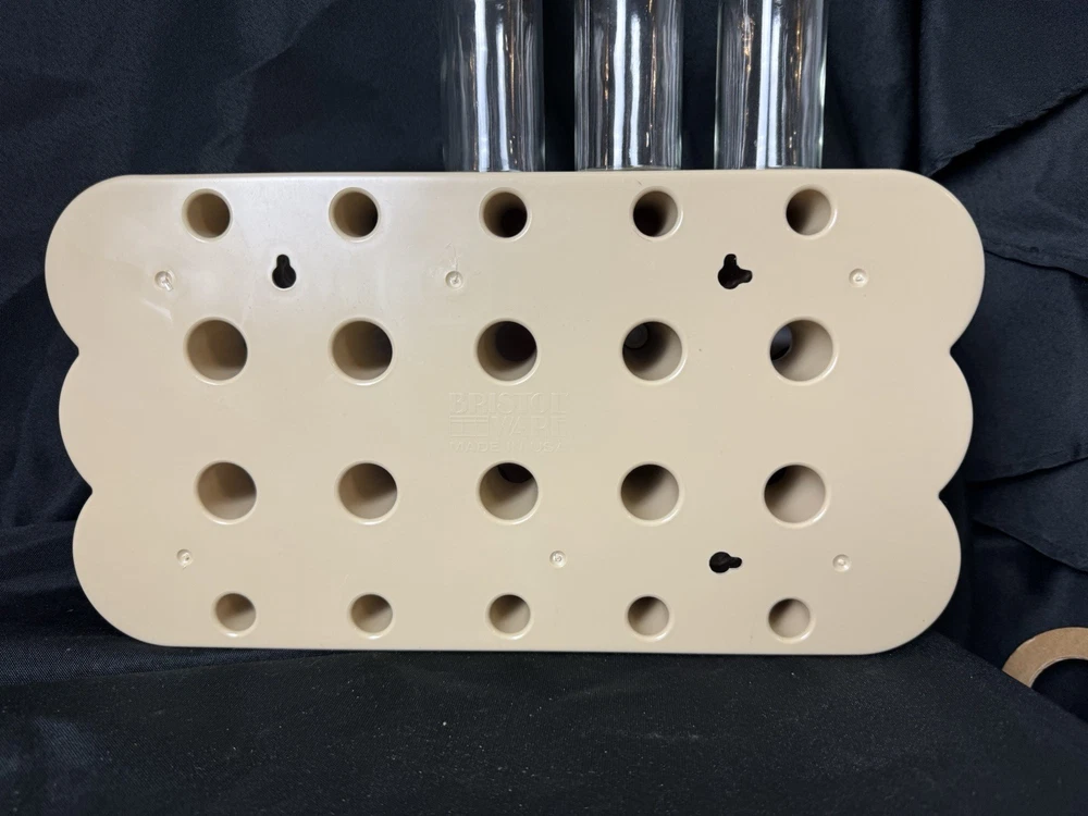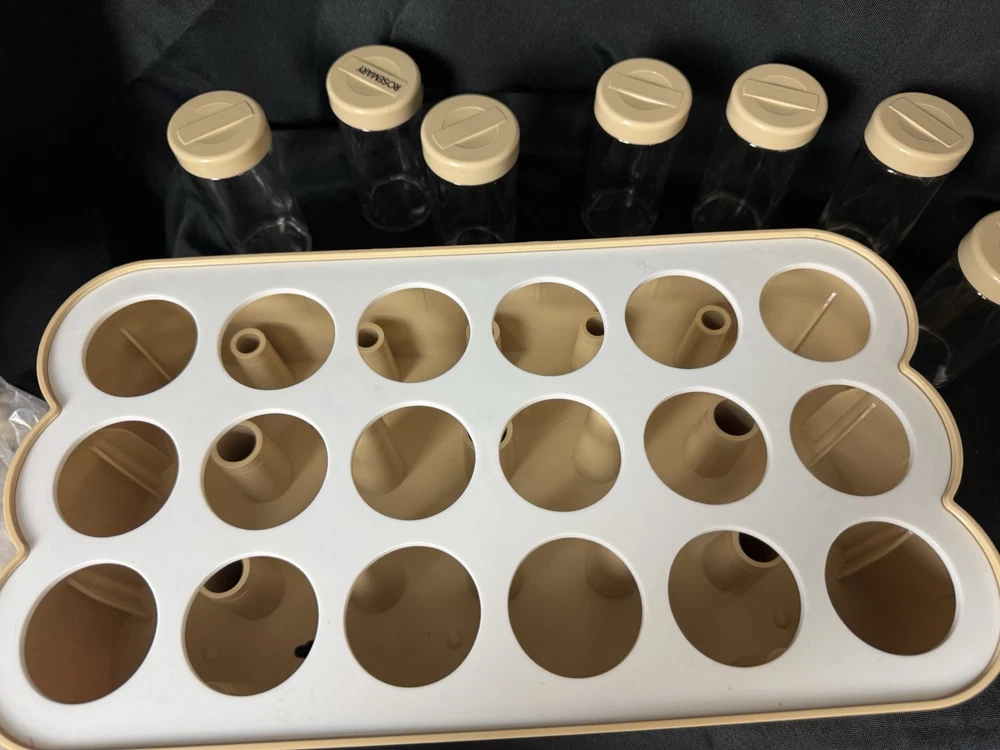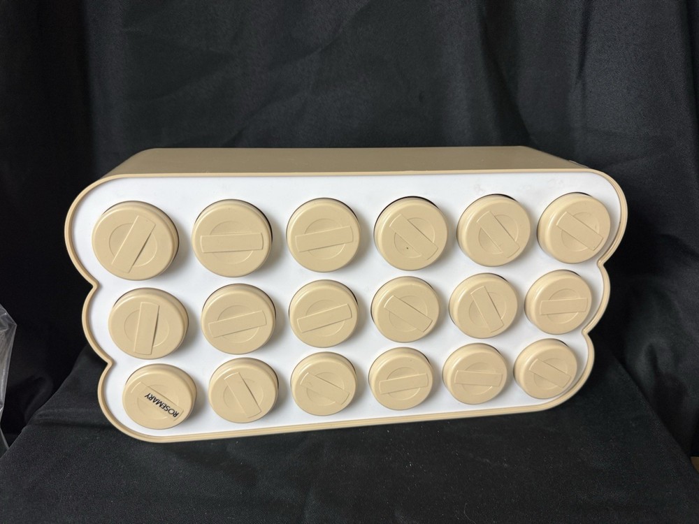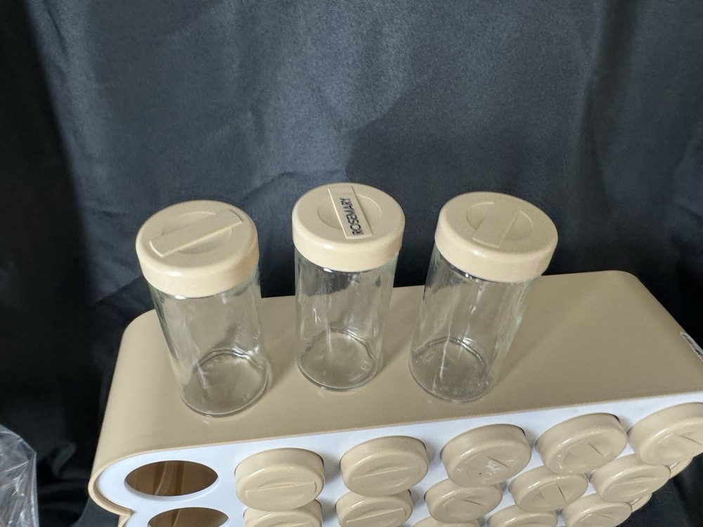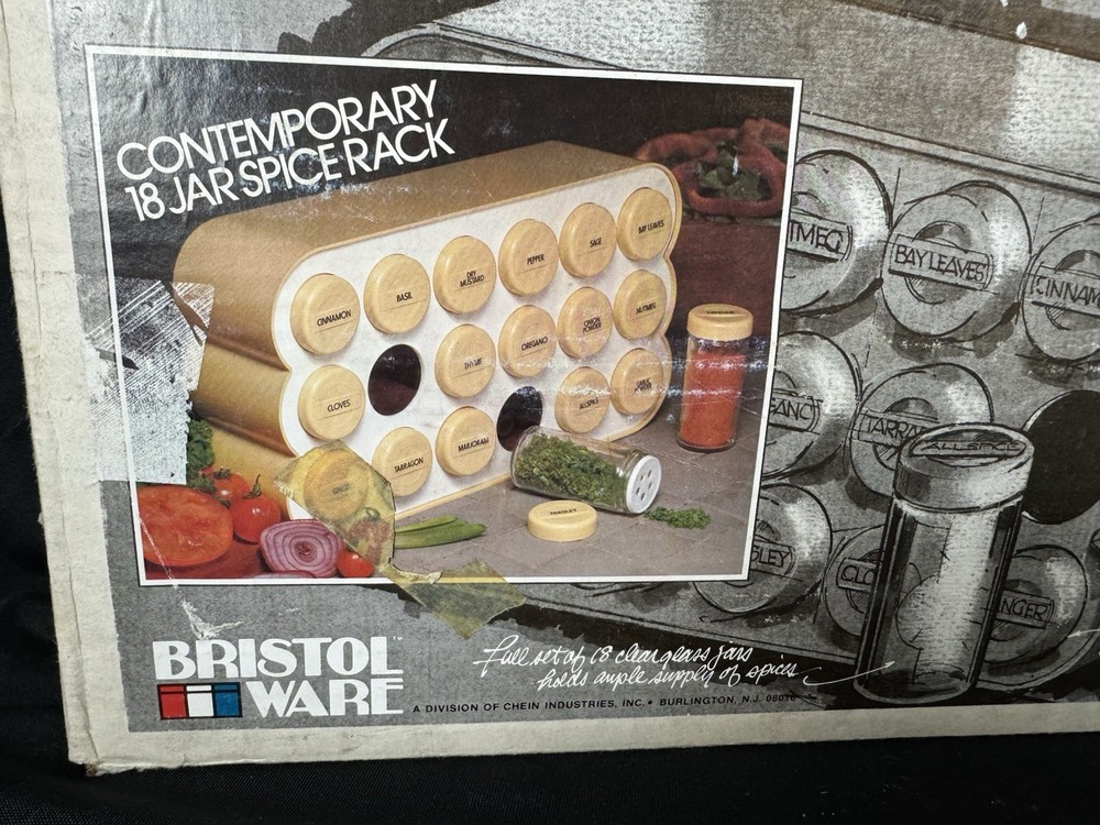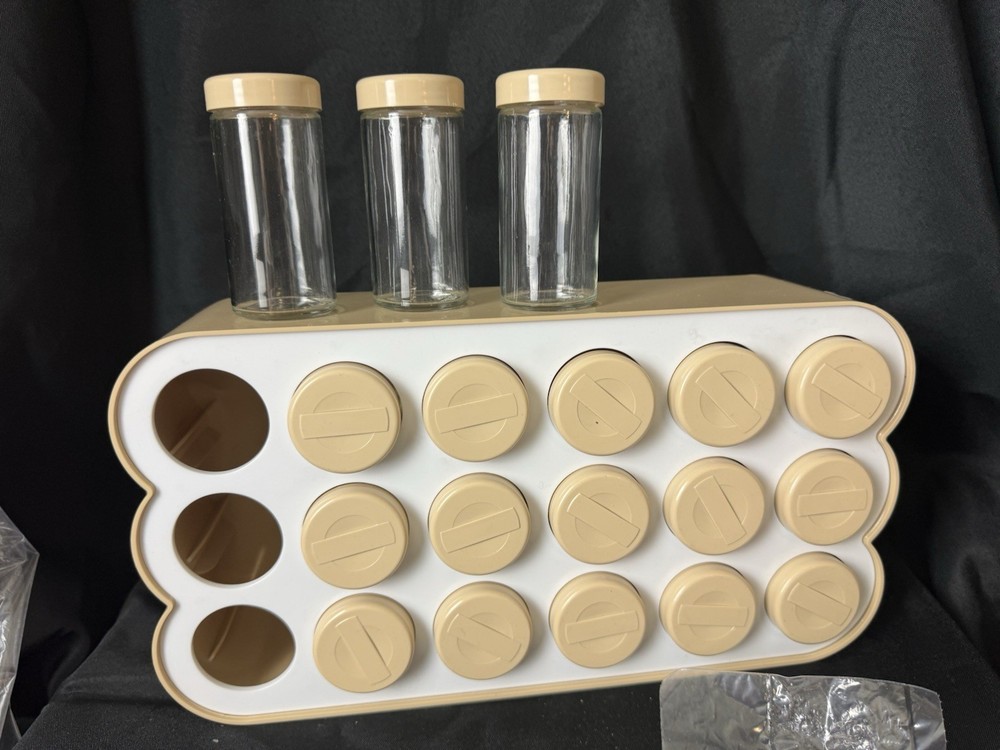 The product is a vintage 70s MOD spice rack shelf made of tan beige plastic in a Mid-Century Modern style. It features an oval shape with 18 compartments for spice jars, with three tiers for organizing. The set includes a rack, lid, and jar, and is wall-mounted for easy access. Made in the United States by Bristol Ware, this spice rack is a practical and stylish addition to any kitchen, providing airtight storage for reusable jars with label tags for easy identification.
