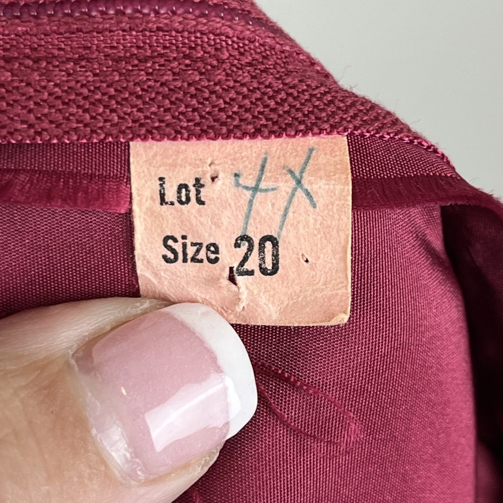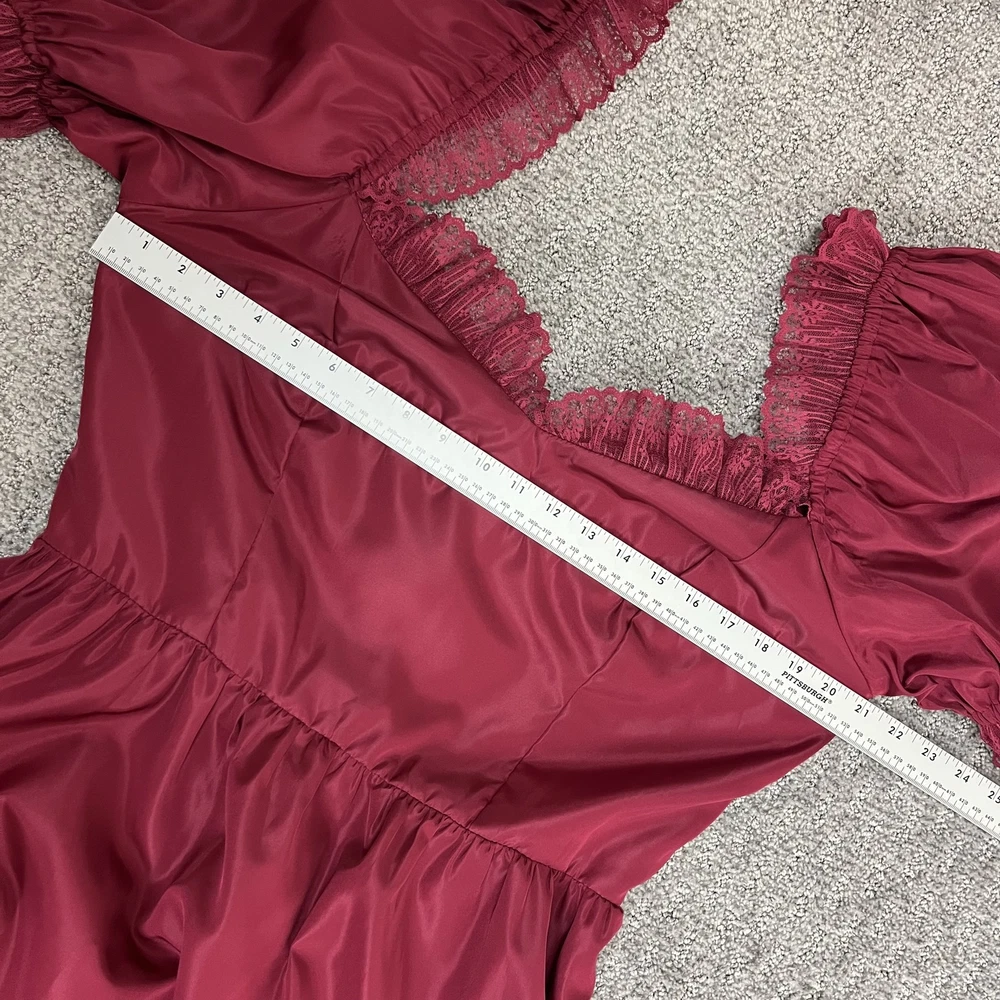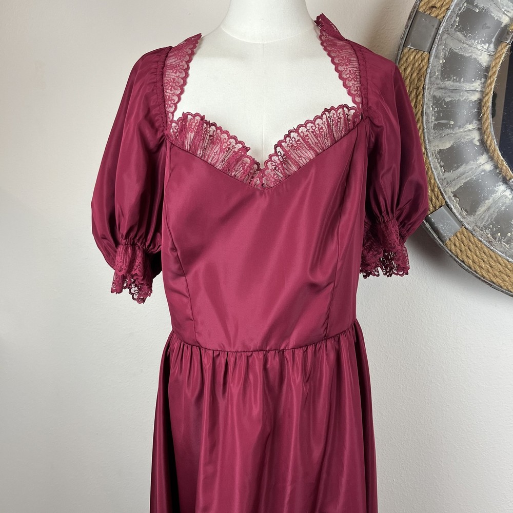 Vintage Burgundy Lace Maxi Dress Womens Size 20 Puff Sleeve 70s 80s Formal Gown Bridesmaid Prom Condition: Gently worn, no visible flaws. Zipper is functional, lace trim intact, and fabric has no stains or holes noted. Classic vintage formal gown likely from the 1970sb or the 1980s featuring a rich burgundy color with matching lace trim detail at neckline and sleeve cuffs. Puff short sleeves with elastic and lace edge, V-neck with scalloped lace, and a gathered skirt for a full silhouette. Deep V back with functional zipper closure for secure fit. Tag size 20 (see photo for original tag). Flat measurements (approximate): pit to pit ~20.5", total length from shoulder to hem ~59". Estimated for plus size/curvy fit; please compare measurements to your own for best fit. Weight: 13.5 ounces (see scale photo). Color: Burgundy/wine with tonal lace accents. Fabric has a light sheen, likely synthetic blend (no fabric content tag present). Great for formal, costume, prom, period, or stage wear. Stored in a labeled poly bag for protection (see storage photo). Style: Vintage 70s formal gown, prom dress, maxi puff sleeve, lace trim, zip back.