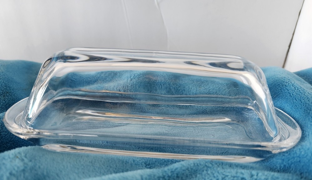 This vintage clear glass kitchen butter dish is a must-have for any collector of mid-century modern décor. The dish is made of pressed glass and features a glossy finish.