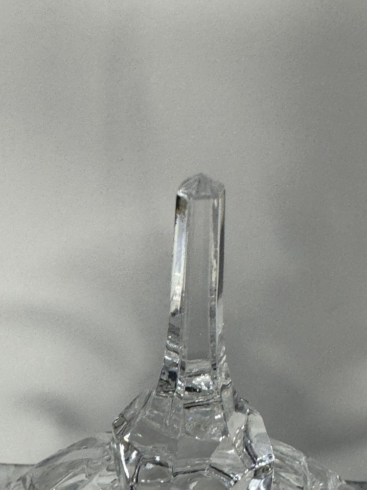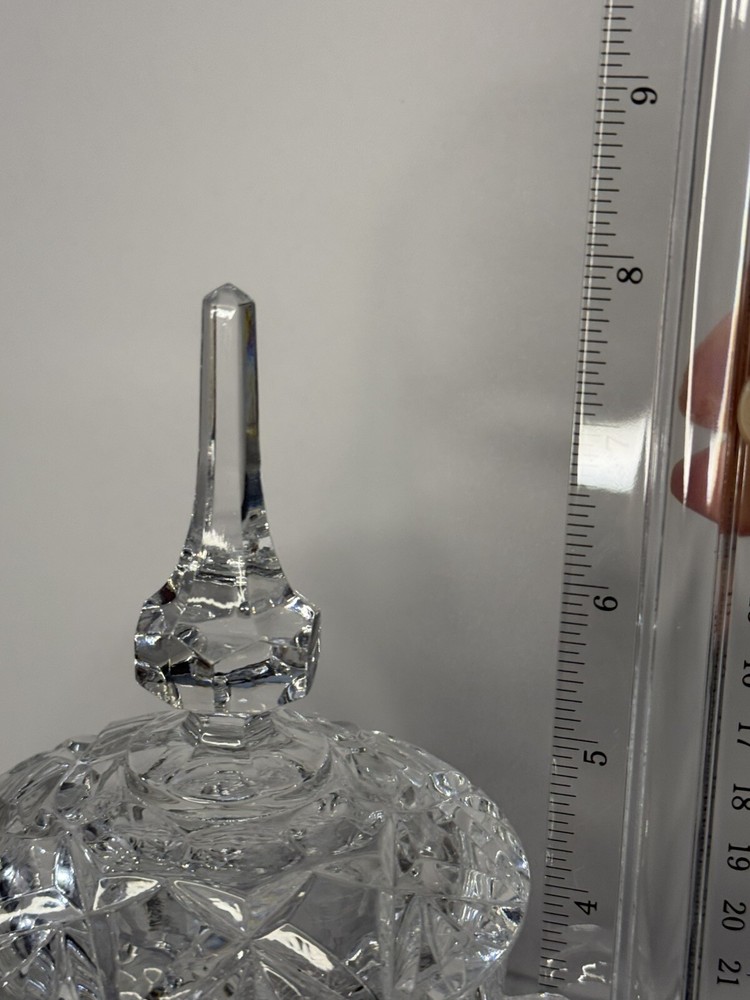 Elevate your table setting with this Vintage Cut Glass Crystal Sugar Bowl, complete with a matching lid. The bowl stands at 8 inches tall and showcases a classic round shape that is both elegant and practical. Its clear crystal construction allows for a seamless display of your sugar or preserves, making it a functional yet decorative piece for any occasion. The sugar bowl's etched detailing reflects a production style synonymous with cut glass craftsmanship. Although the brand remains unknown, the quality and charm of this two-piece set are undeniable, perfect for those who appreciate the beauty of vintage glassware. Whether used for special gatherings or as a display item, this unbranded bowl is a timeless addition to your collection.