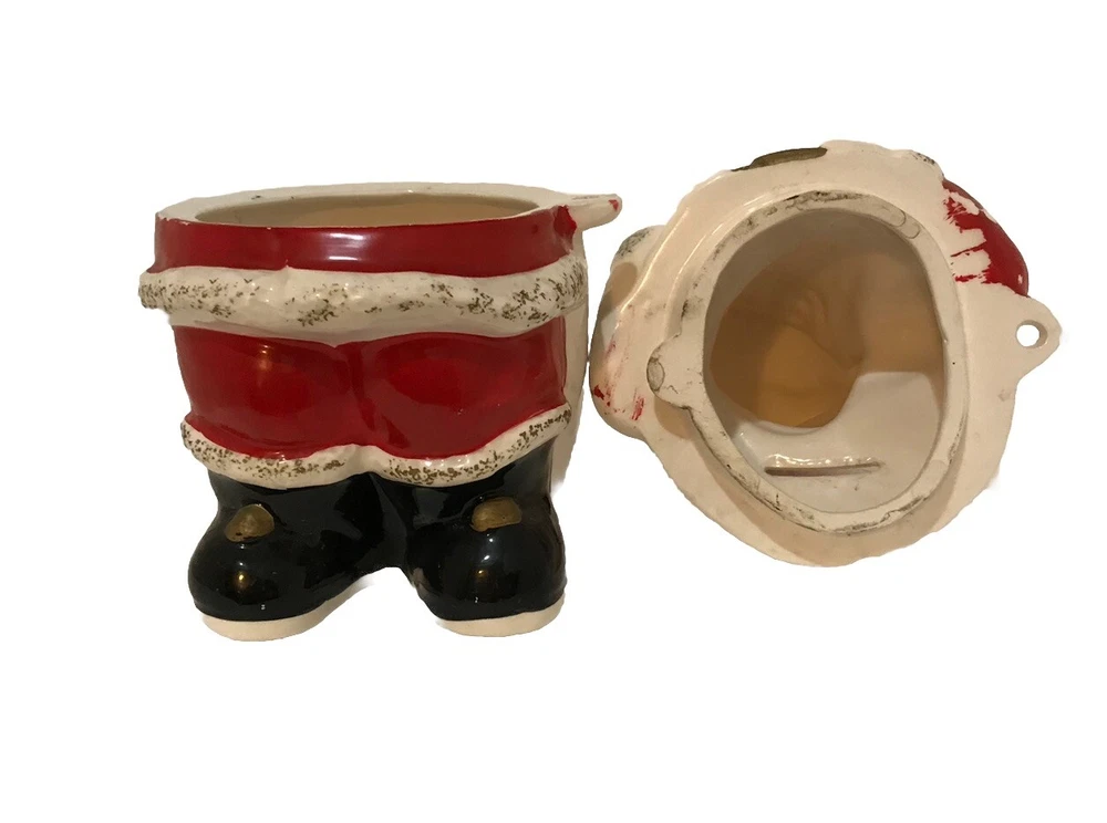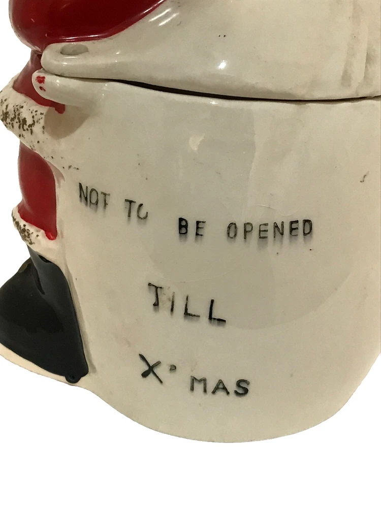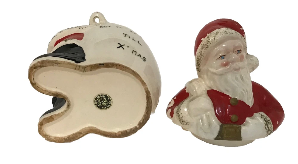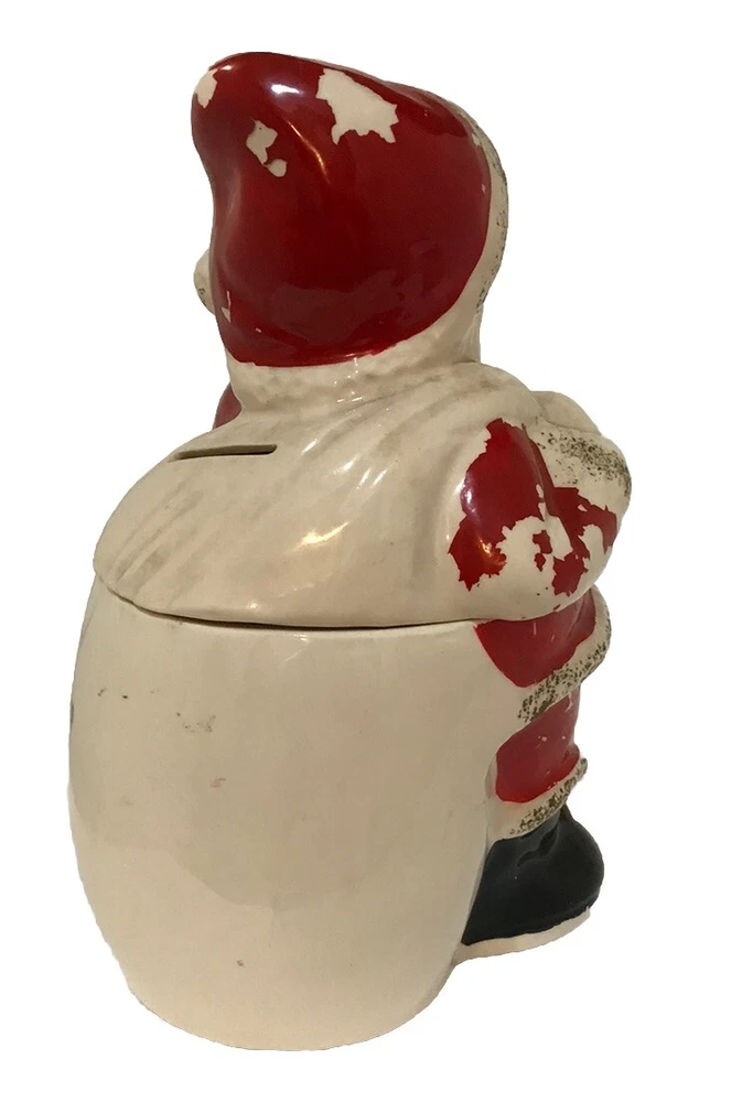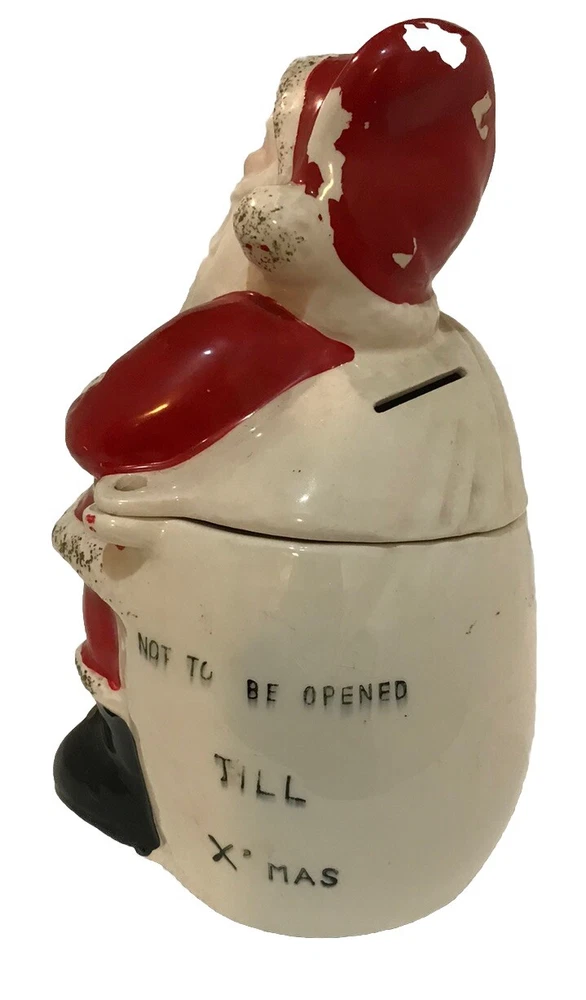 This vintage porcelain Santa bank from the 1920s is a must-have for any collector. Made in Japan, this figurine features a glossy finish and a 3D effect, making it a unique addition to your Christmas decor. The hand-painted multicolor design is perfect for any season and occasion, making it a great novelty item for teens, adults, or kids. This is perfect for anyone looking for a seasonal or novelty item. With a subject of Santa and a department of teens, adults, and kids, this figurine is sure to bring joy to any collector. Don't miss out on this one-of-a-kind piece from the past. 8” tall