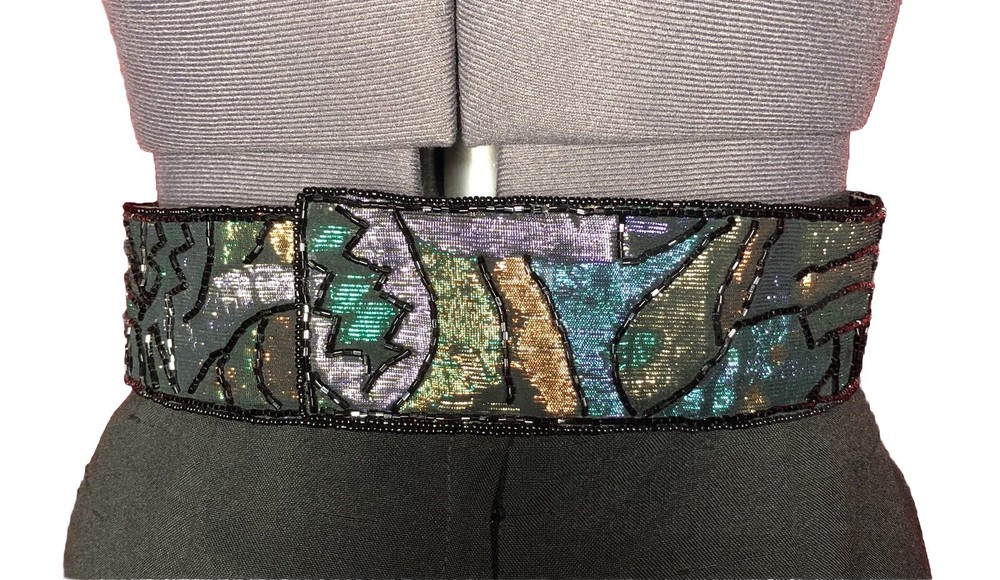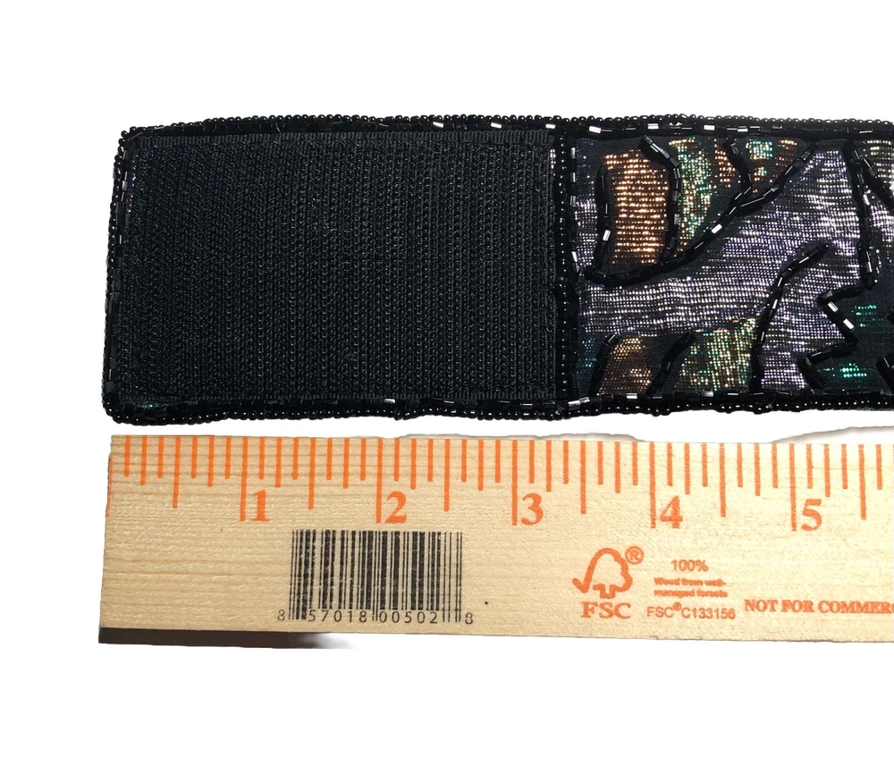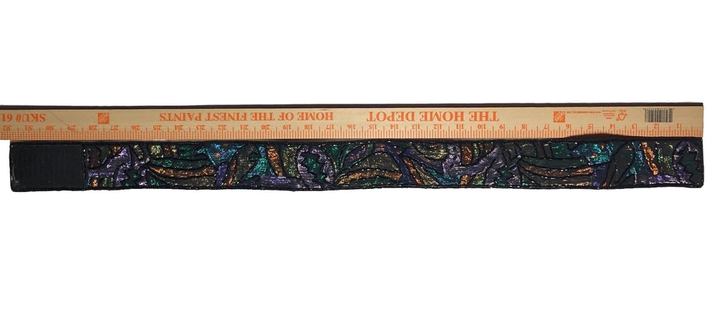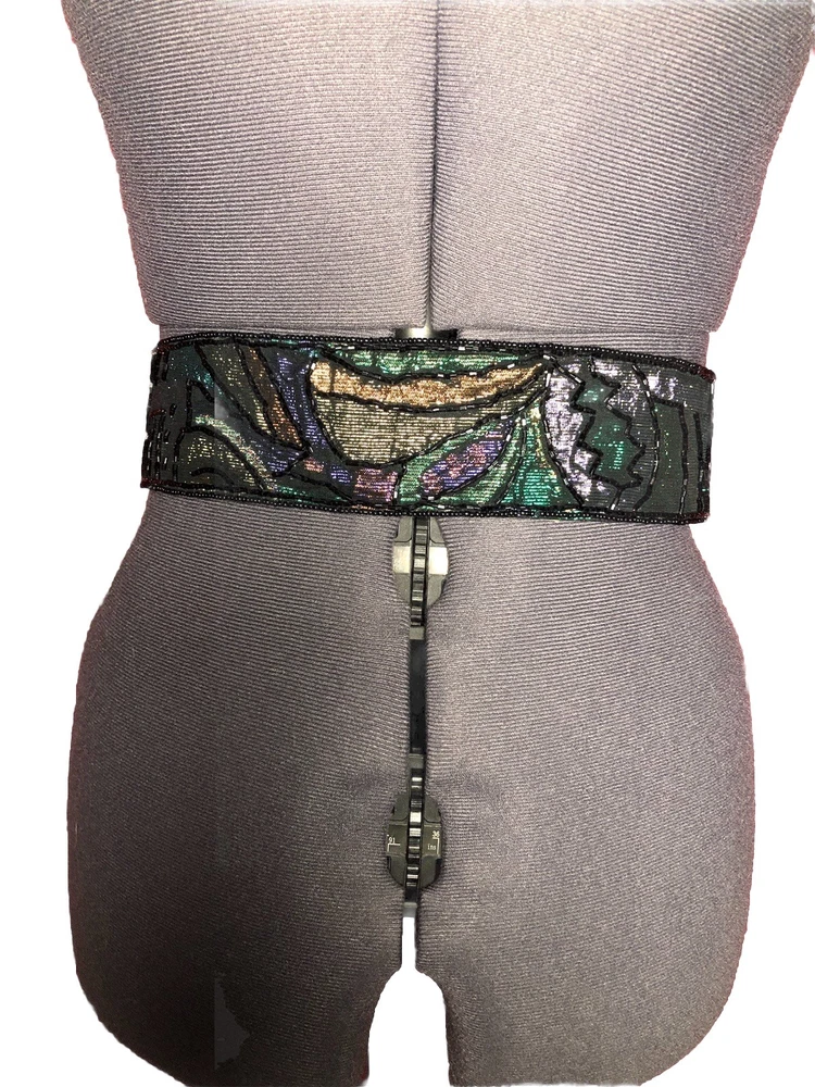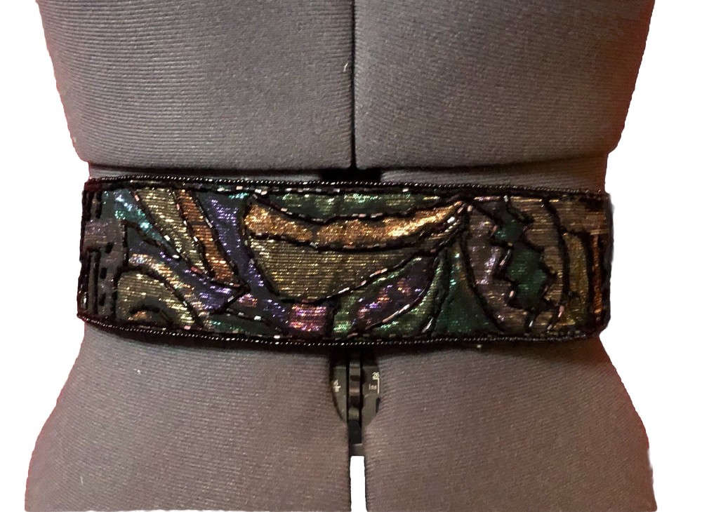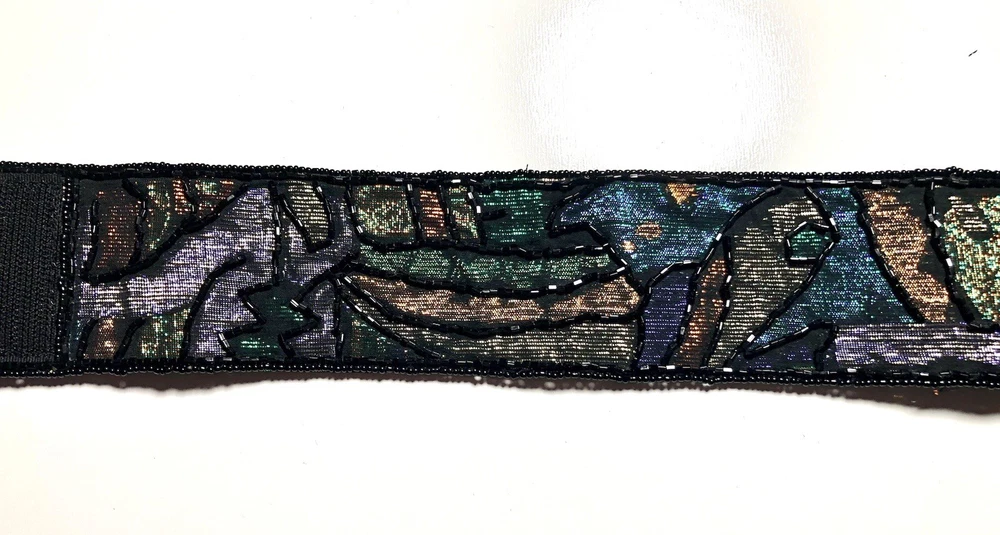 This Vintage 80s 90s Beaded Self Fastener Belt by La Regale features iridescent jewel tones in black, green, purple, blue, copper, and gold. The belt boasts a textured pattern, a 2" width, and a size of 25 1/2 inches, making it perfect for a small waist. This adjustable belt is ideal for events, parties, or adding a touch of vintage flair to any outfit. The beaded accents add a unique and eye-catching element to this stylish piece of women's accessories. Witchcore, gothcore, vampirecore
