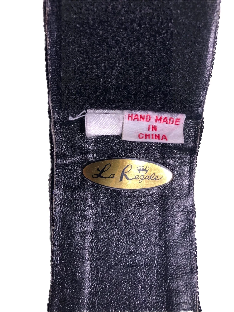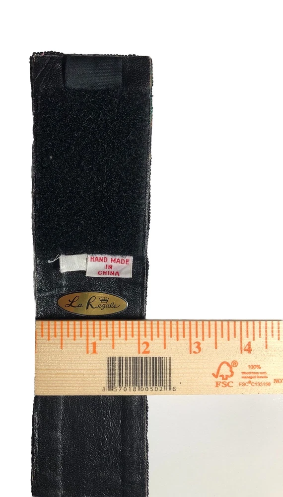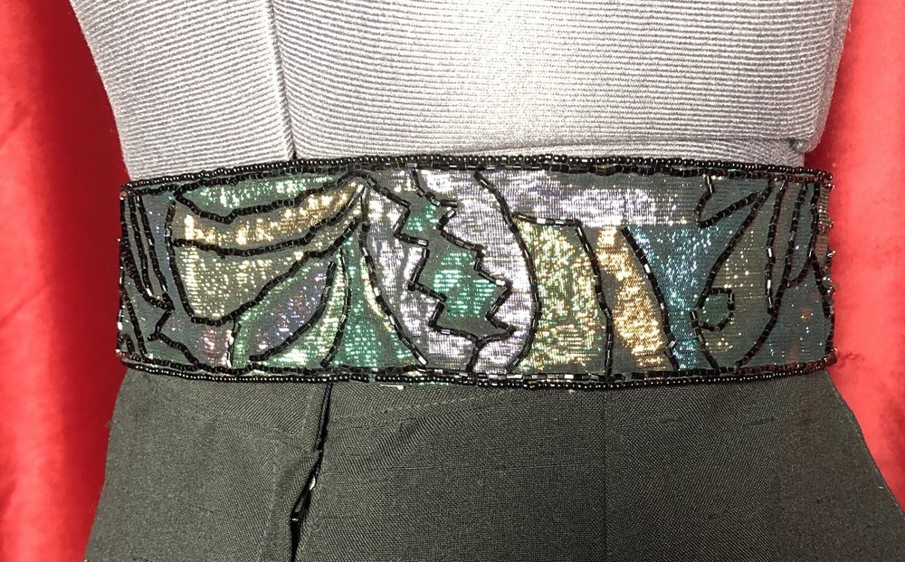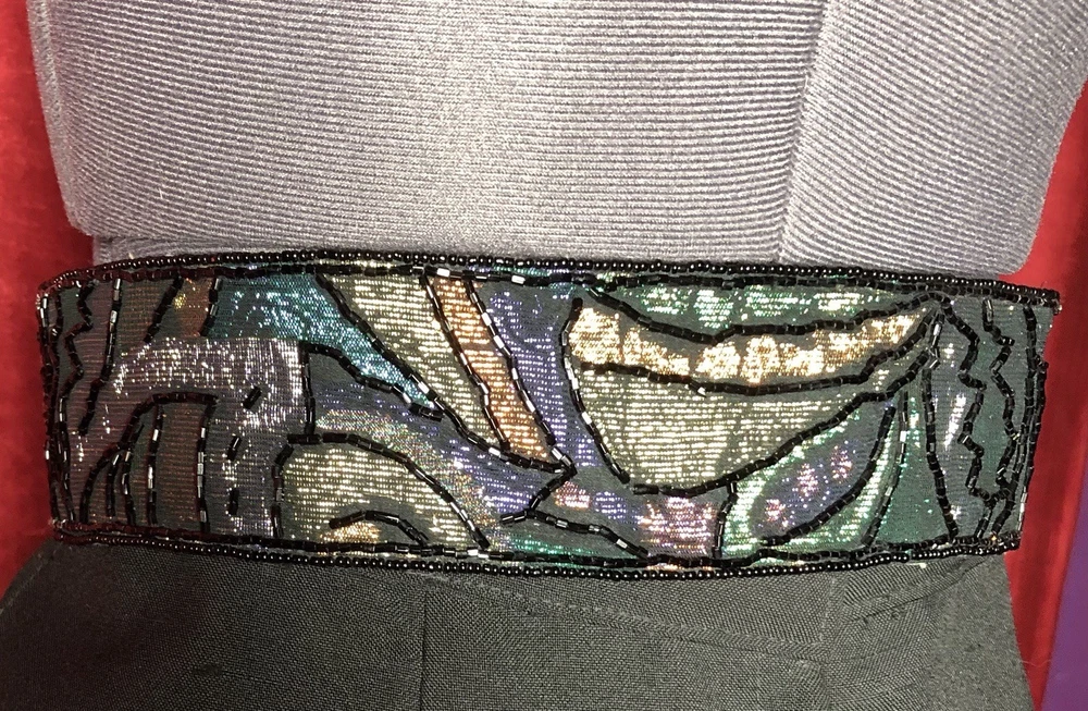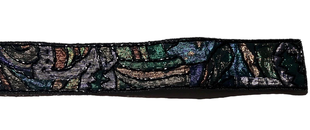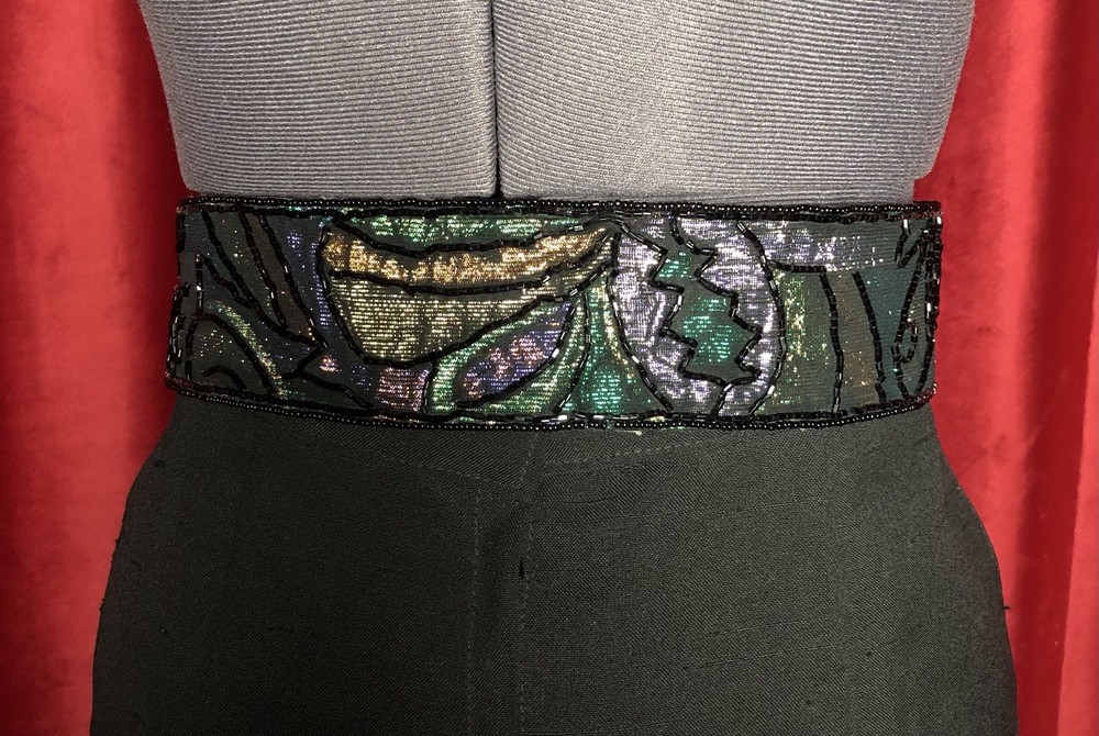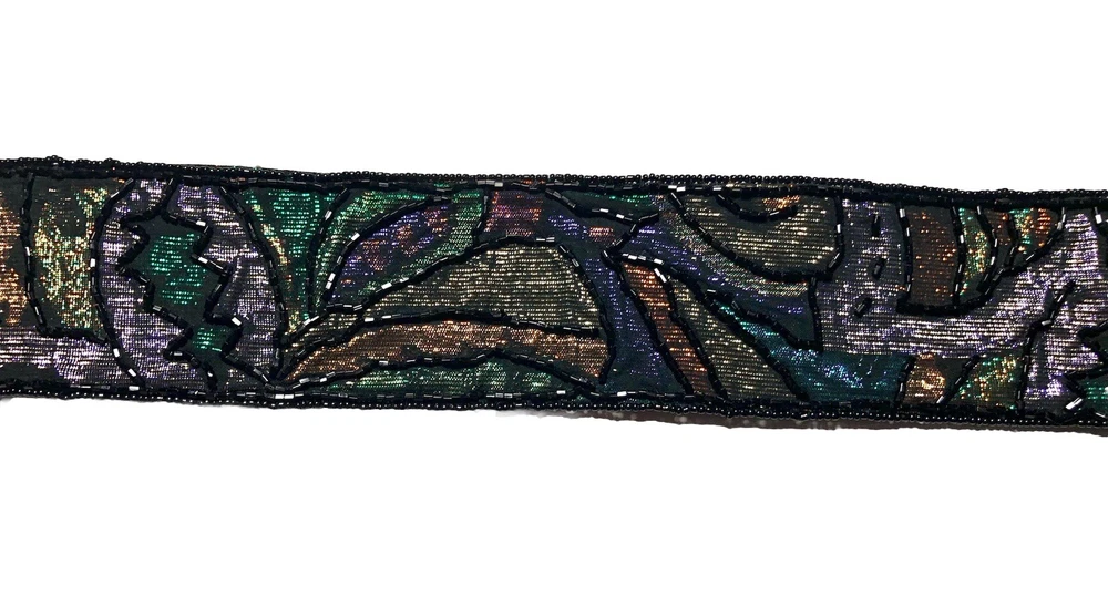 This Vintage 80s 90s Beaded Self Fastener Belt by La Regale features iridescent jewel tones in black, green, purple, blue, copper, and gold. The belt boasts a textured pattern, a 2" width, and a size of 25 1/2 inches, making it perfect for a small waist. This adjustable belt is ideal for events, parties, or adding a touch of vintage flair to any outfit. The beaded accents add a unique and eye-catching element to this stylish piece of women's accessories. Witchcore, gothcore, vampirecore