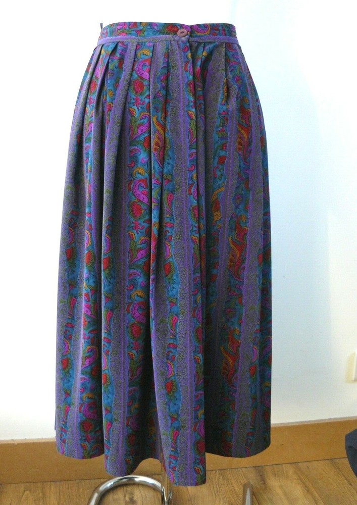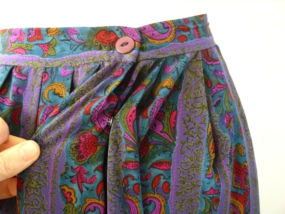 Good vintage condition no faults found. This skirt is hand made and has no fabric or other labels. Feels a bit like slub silk but is likely man made. Unusually the skirt fastens with a button and a popper no zips. Measures 15" across waist so will fit a modern UK 12. 30" long so a midi length. Soft pleats all the way round. Not lined or particularly well finished.