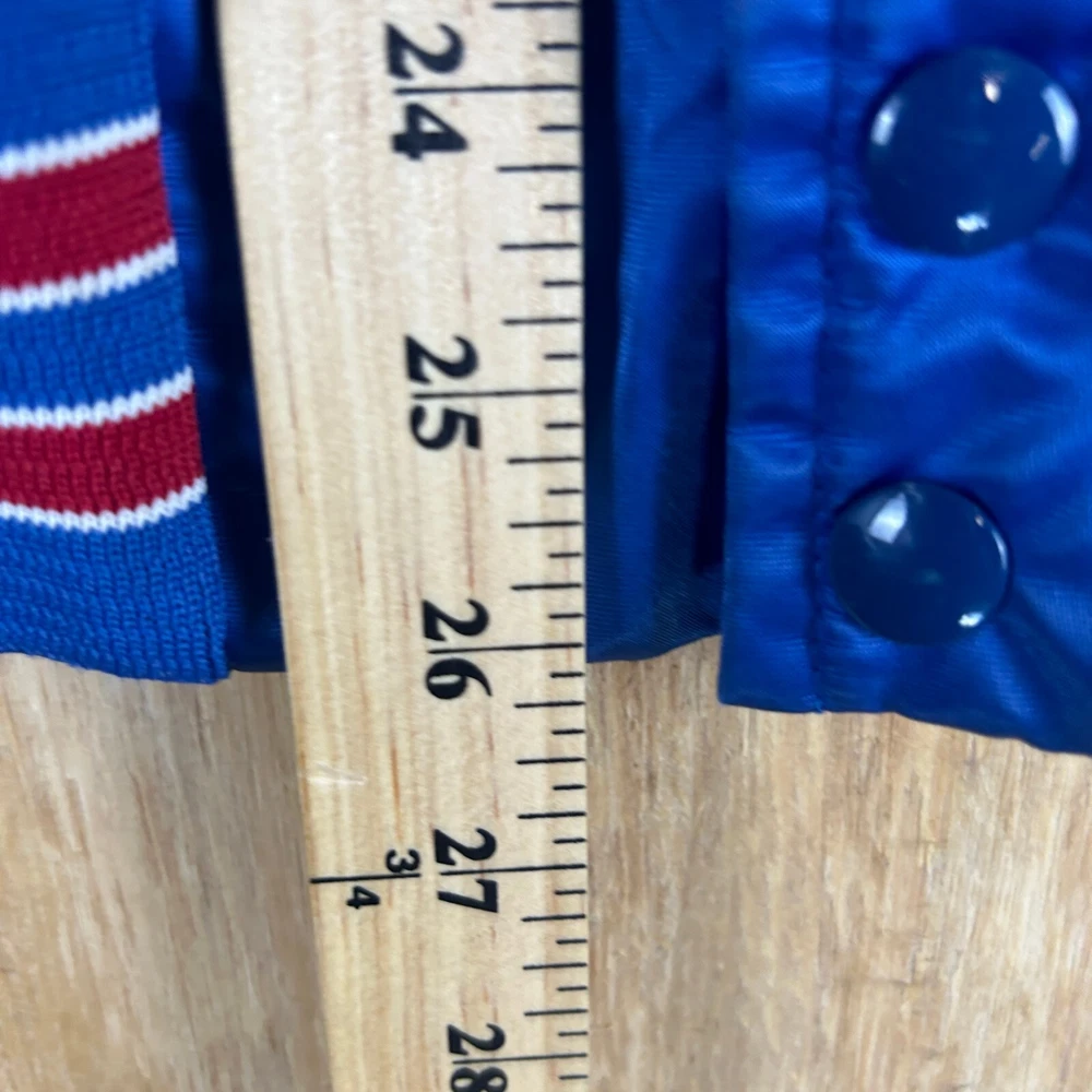 Show off your love for the Chicago Cubs with this vintage MLB 80s Chalk Line blue satin jacket. This unisex adult jacket is officially licensed and made in the United States. It features the iconic team logo and is perfect for regular season games. The jacket is size XL and comes in a beautiful blue color. It is a great addition to any baseball fan's collection and is perfect for showing support for your favorite team. Don't miss out on this opportunity to own a piece of baseball history! SKU: 180041