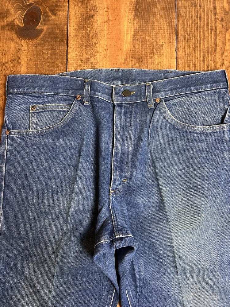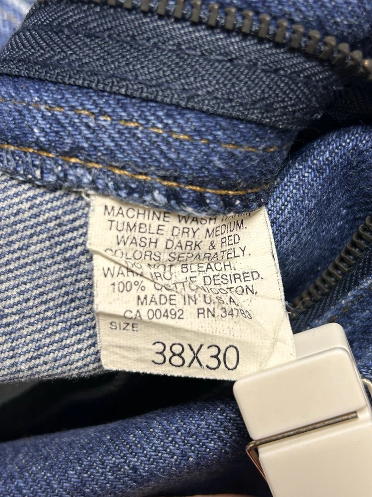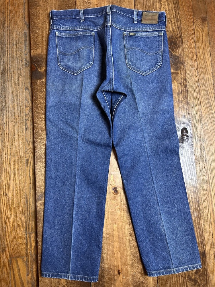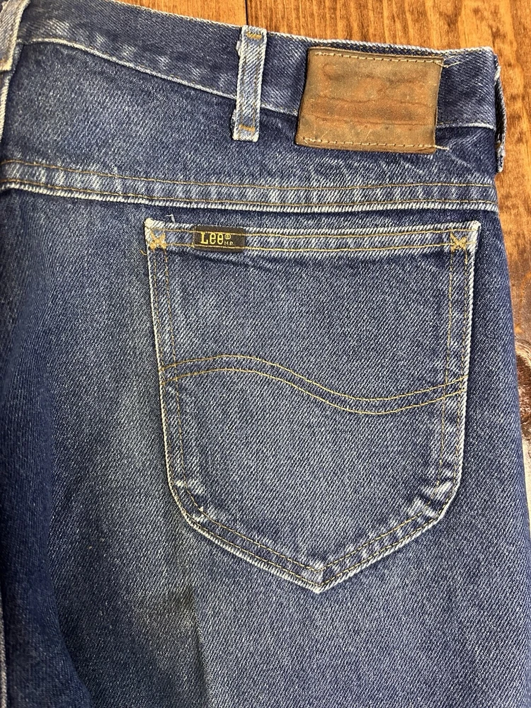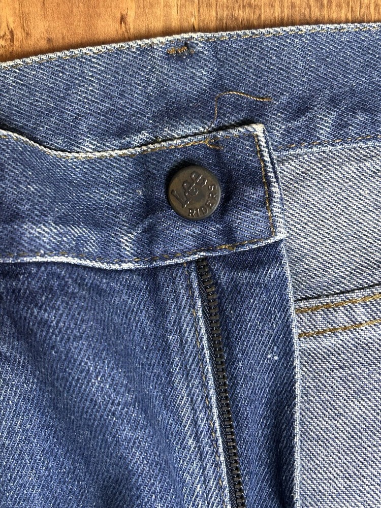 Vintage 80s Lee Riders Men 38X30 Jeans Blue Denim Starched Cowboy Union Made USA Waist: 38" Inseam: 30" Rise: 12" Please be aware that used, vintage, or older items may show a few signs or wear or slight fading due to age. Anything visible, such as stains, rips or holes are a possibility, if not shown initially. Measurements are taken from the waist, the inseam of the pant leg and the rise from the top of the jean to the end of the crotch.