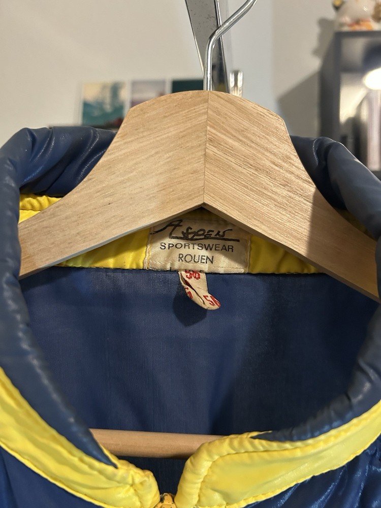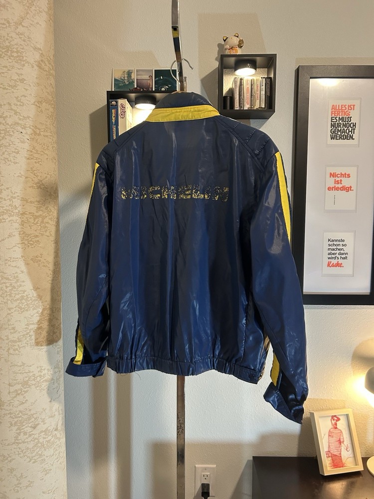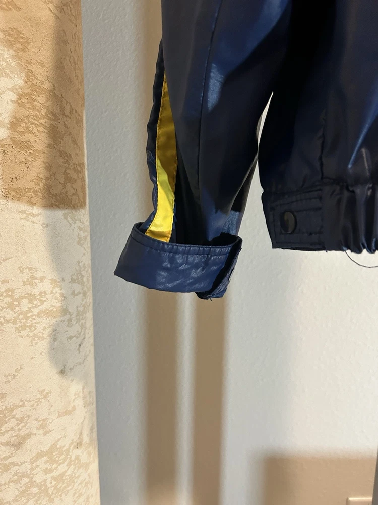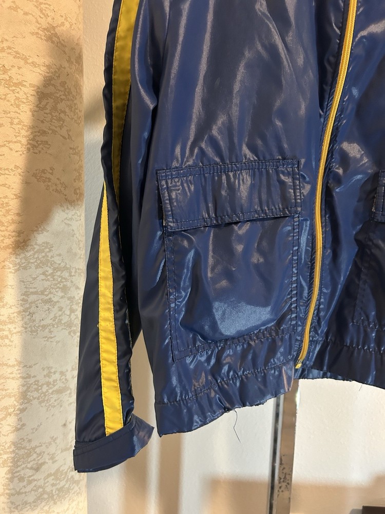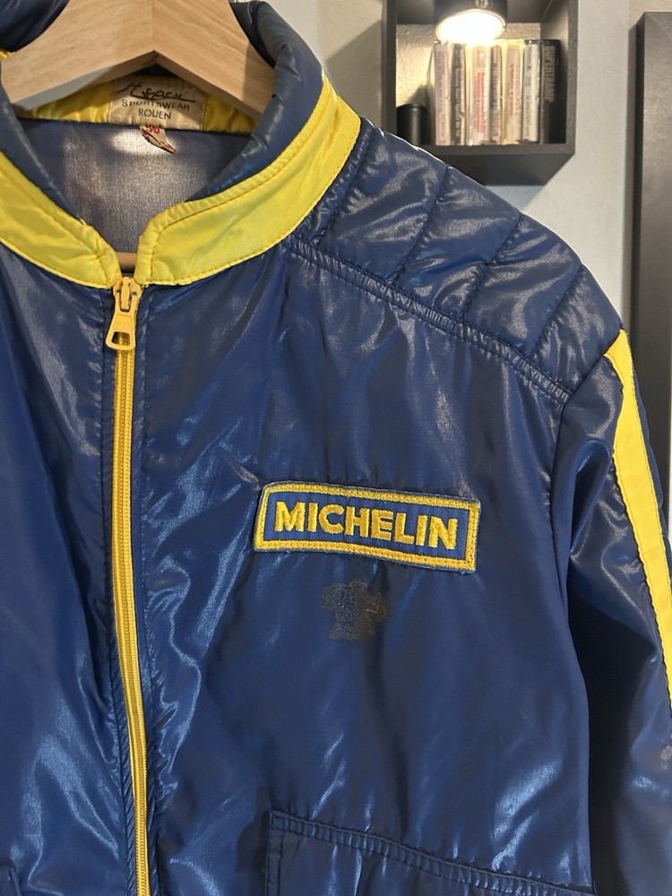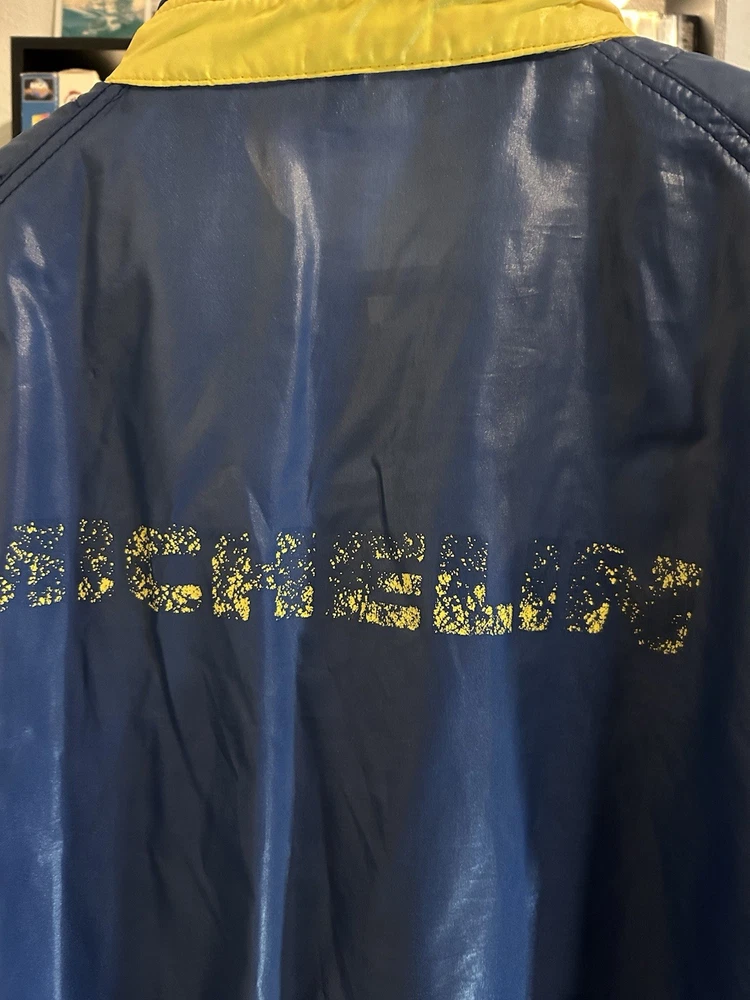 The Vintage 80s Michelin NASCAR Pit Crew Jacket is a stylish and retro bomber jacket made of polyester in a beige color. With a zip closure and featuring the Michelin logo as accents, this jacket is perfect for casual occasions and showcases a 80s theme appropriate for fall wear. The jacket is designed for regular fit and is a great addition to any man's wardrobe, especially for those who appreciate vintage fashion and racing enthusiast aesthetics. Made in the United States, this reversible jacket offers a unique and nostalgic touch to any outfit.