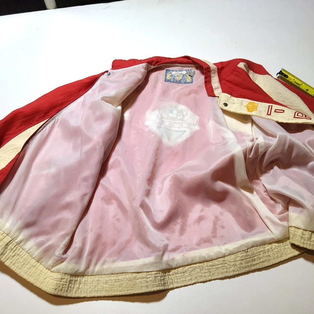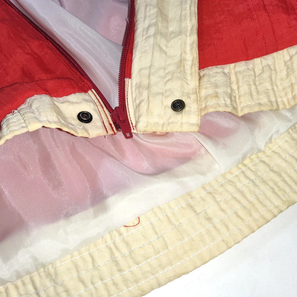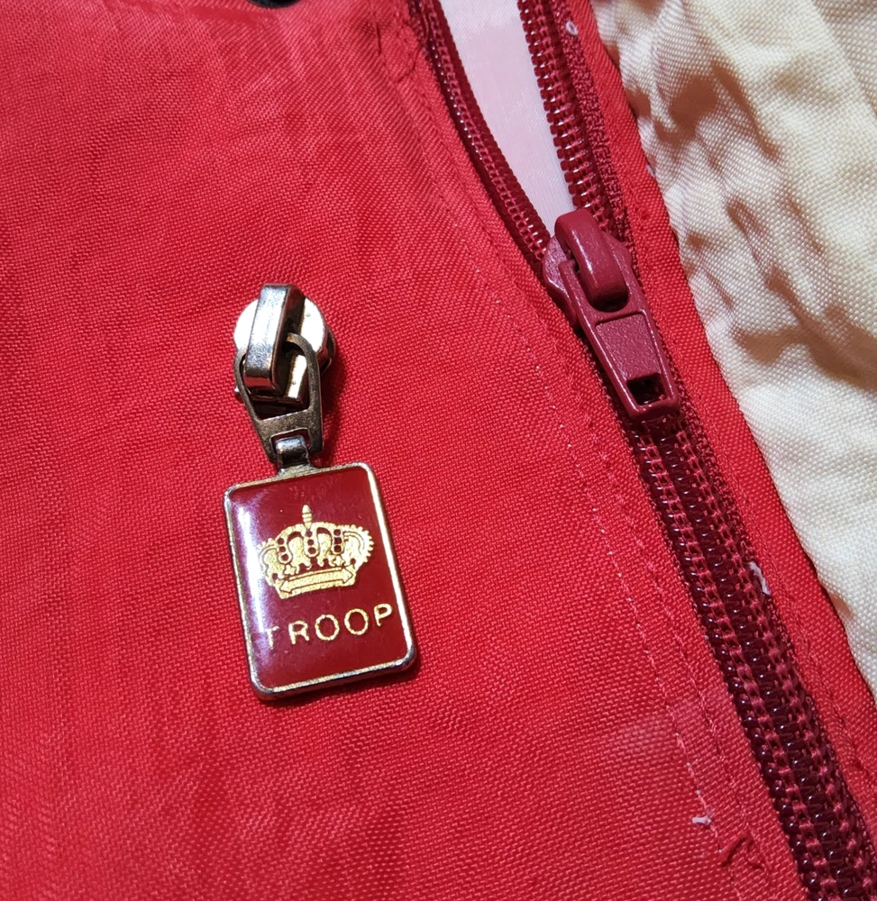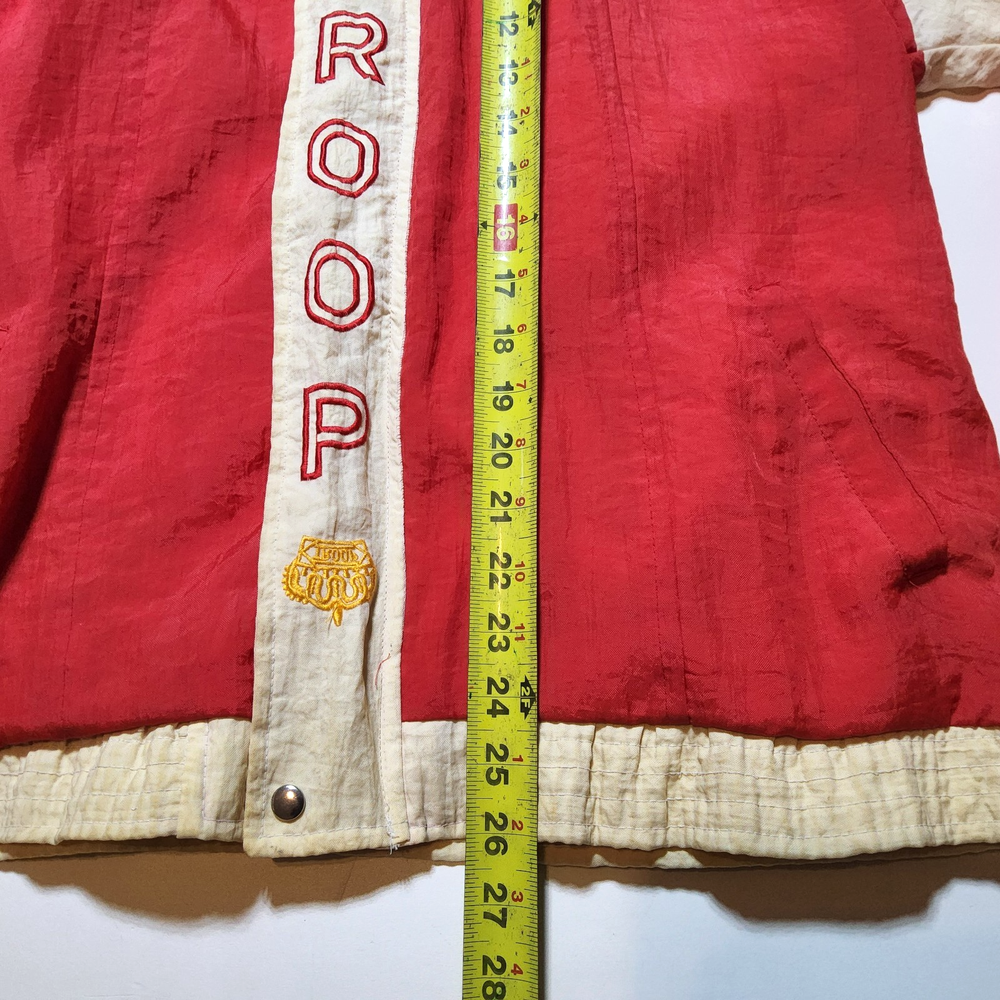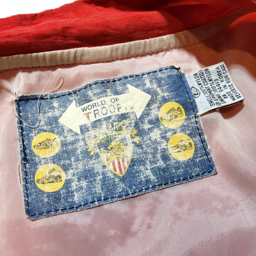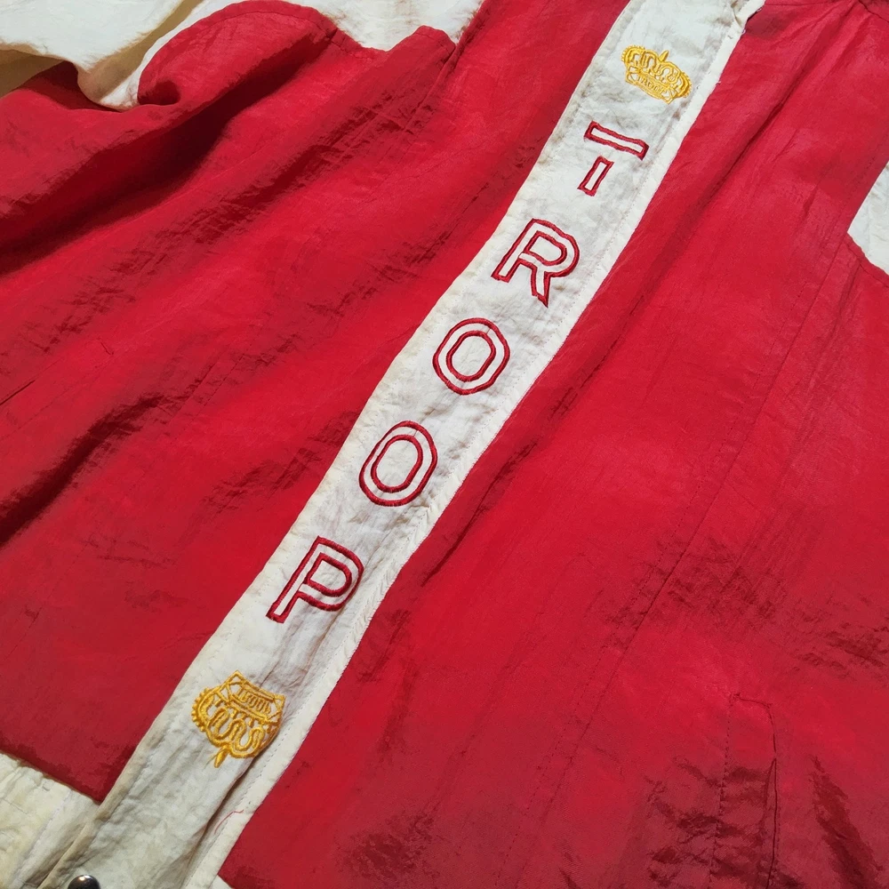 Can combine shipping on all orders. Vintage 80's world of troop windbreaker hip hop rap zip up jacket size large Had a new zipper installed cause the old one was busted. I specifically asked seamstress to install the signature Troop original zipper pull but didn't. Perhaps you can get it put on. Comes with jacket. Could use a nice oxy clean bath to get the brights out on cream colored sections. The reds, embroidery, and logos are crisp. Definitely early 80s. Definitely not owned by a breakdancer or else colors and fabric would be faded. All pre-owned clothes sourced from thrift stores,yard sales,estate sales,flea markets,etc. and have NOT been washed by me. My household is non smoking and do my best not to pick up stinky items.