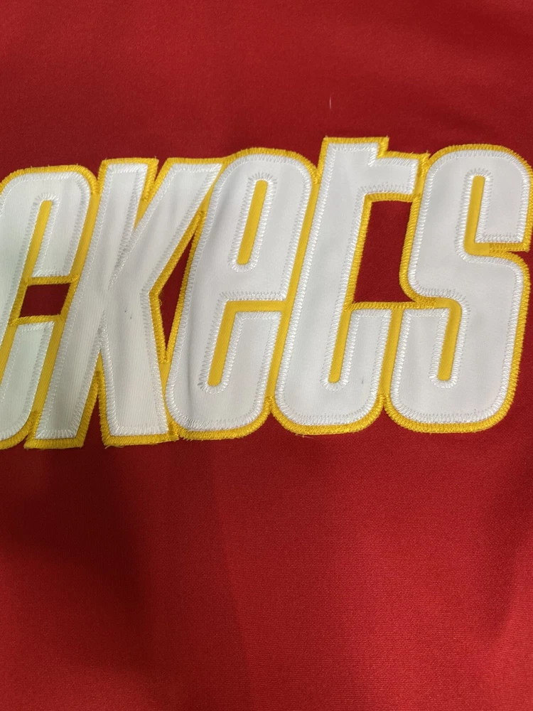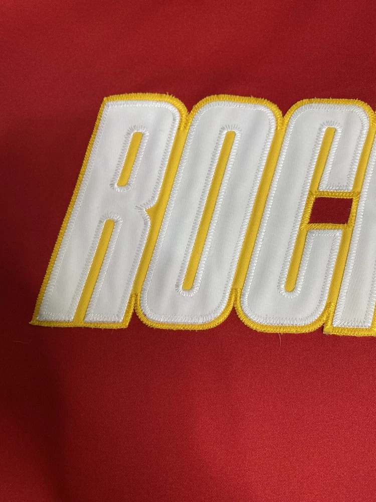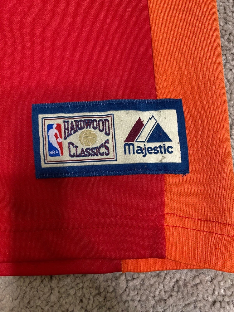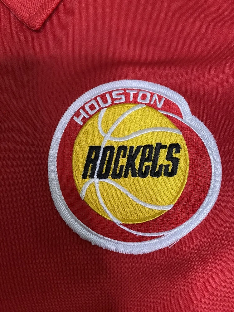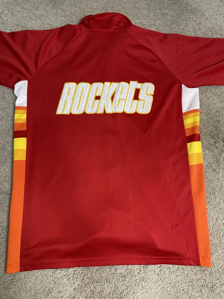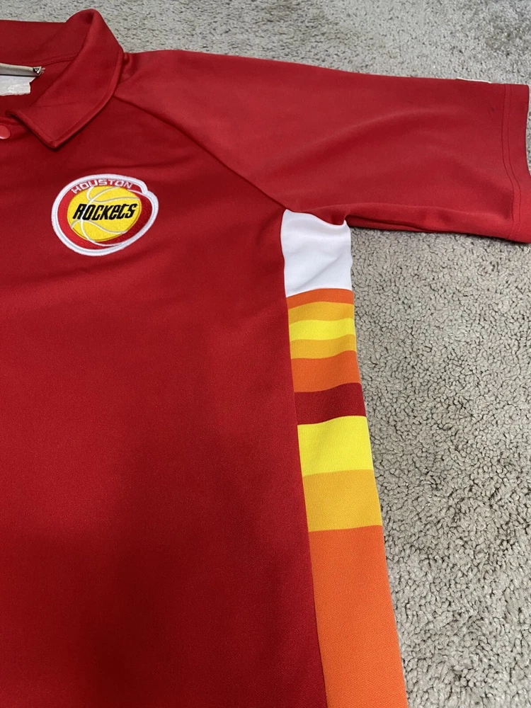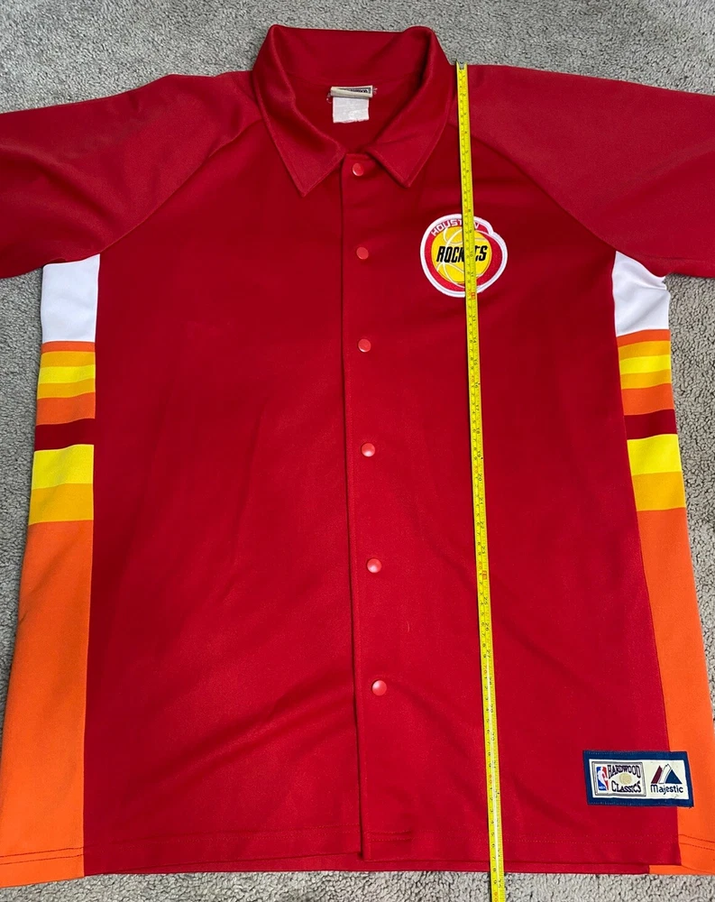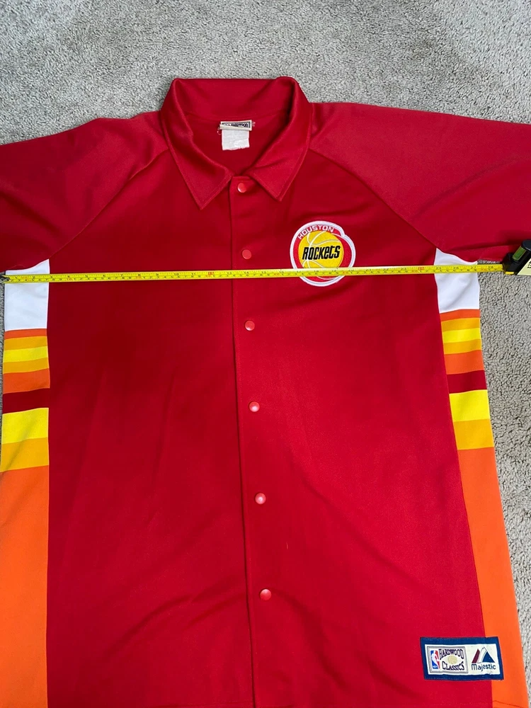 Get ready to cheer on the Houston Rockets with this vintage NBA warm up jersey/top from the 80s/90s. Made by Majestic and officially licensed by the National Basketball Association (NBA), this red jersey is perfect for any basketball fan. The size XL jersey is designed for men and features the Houston Rockets team logo and regular season patch. Whether you're heading to the game or just showing off your team spirit, this jersey is a must-have for any basketball enthusiast. The perfect addition to your sports memorabilia collection, this jersey is sure to impress. Don't miss out on this opportunity to own a piece of NBA history.