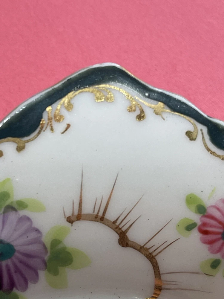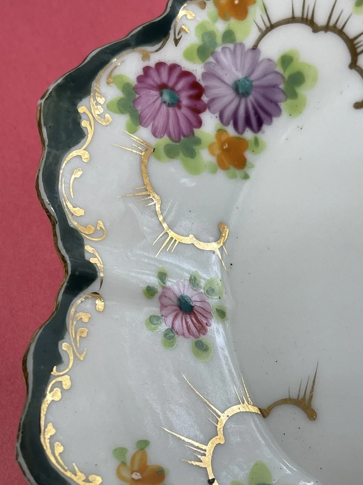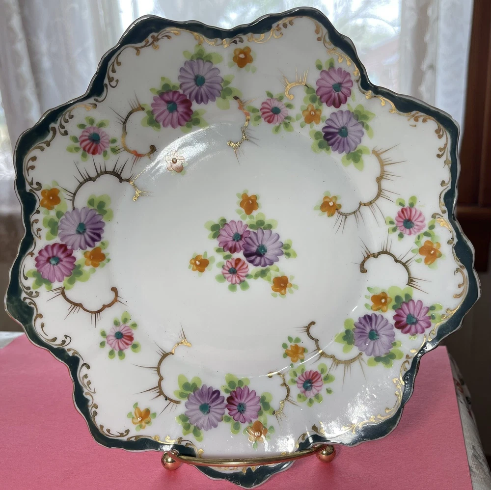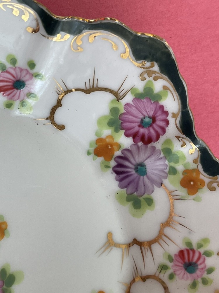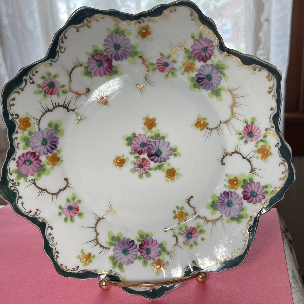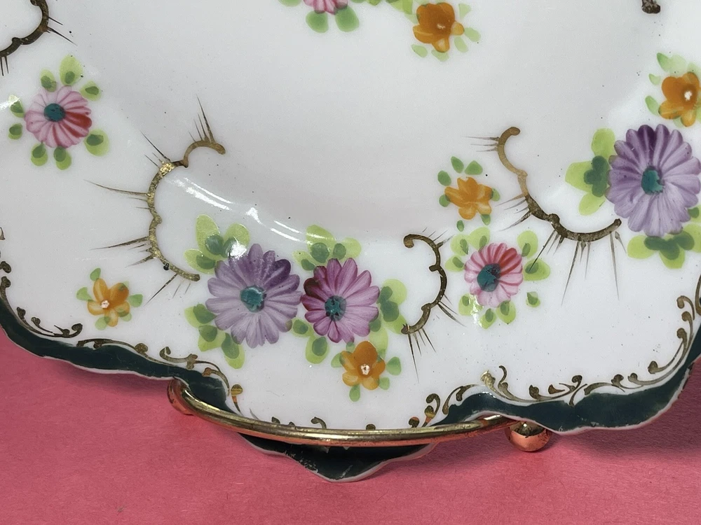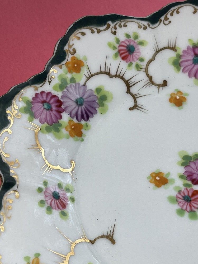 Vintage 8 inch Hand Painted Plate Unsigned Limoges Dresden? Florals Gilt. Only 1 small 5 mm chip on back as pictured. I have take a picture of the front and edge picture of the front scallop, quite insignificant and does not show from the front. Still bright white in color and the hand painting is precise. Beautiful pink, purple daisies or cone flowers, the gold paint gilding is intact, only a little fading on the edges. Estate sale find. Beautiful antique plate and wonderful condition. Thank you!