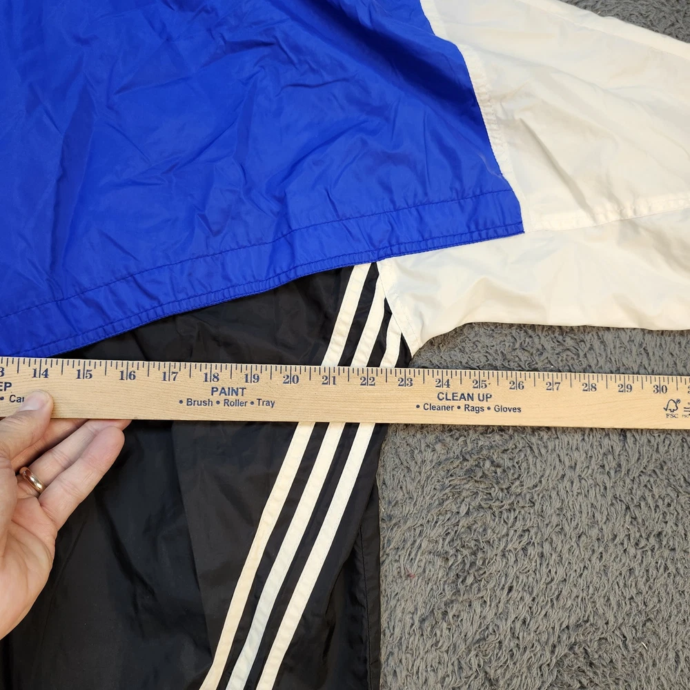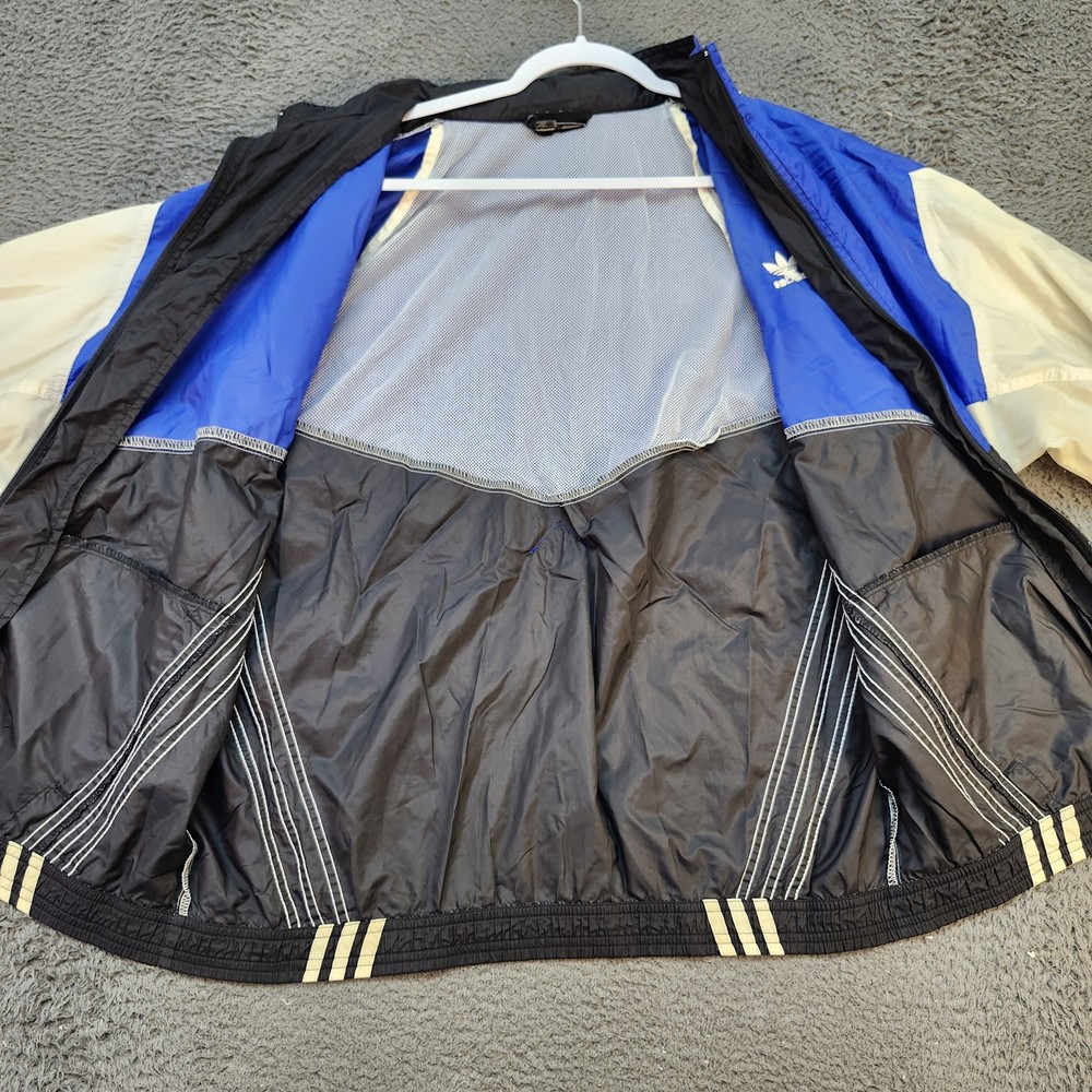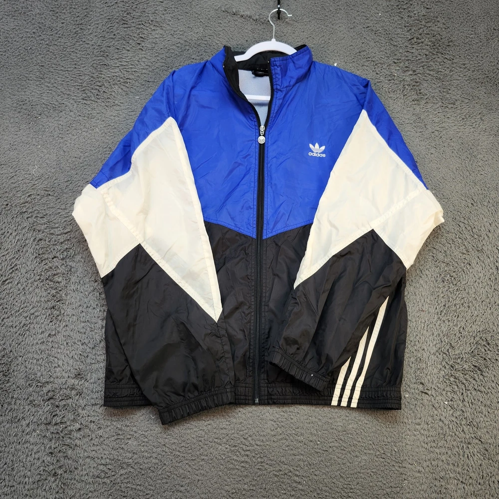 Vintage Adidas Jacket Mens Large Blue Black White Trefoil Windbreaker 90s Retro Condition: Good – minor signs of general wear, light discoloration on white sleeve panels and some overall wrinkling, no holes or major damage Classic Adidas trifecta colorblock windbreaker in blue, black, and white Features iconic embroidered Adidas Trefoil logo on chest Full front zip closure Mesh lining for breathability Two front zip hand pockets Signature three-stripe detailing down sides and sleeves Material tag not visible, feels like nylon shell with polyester mesh lining Tag size: Large (Mens) Approximate flat measurements: Pit to pit 26.5 inches, back length 27.5 inches Authentic vintage Adidas piece from the 1990s with retro styling Perfect for streetwear, track, or casual athletic outfits