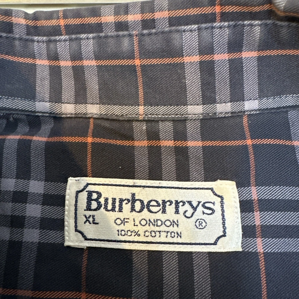 Elevate your wardrobe with this classic Burberry Nova Check button-up shirt. Made of 100% cotton, this navy plaid shirt features short sleeves and a collared neckline, making it perfect for travel, casual outings, or business meetings. The shirt is vintage from the 90s and has a regular fit, with button accents and a woven fabric type. The Burberry shirt is perfect for men who want to add a touch of vintage style to their wardrobe. The Nova Check pattern and 90s theme make it a unique and stylish choice for any occasion. This shirt is available in size L and is a great addition to any collection. In excellent used condition. A couple of pulled threads on bottom see pics