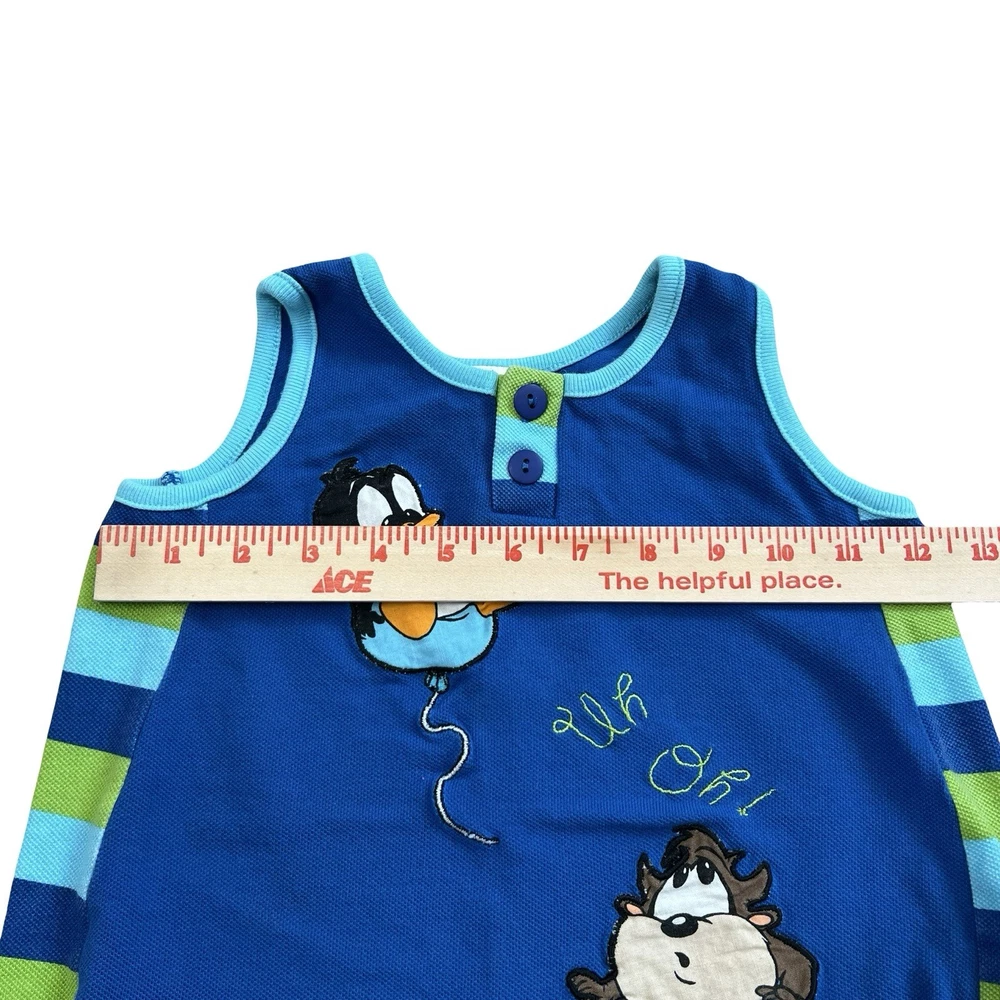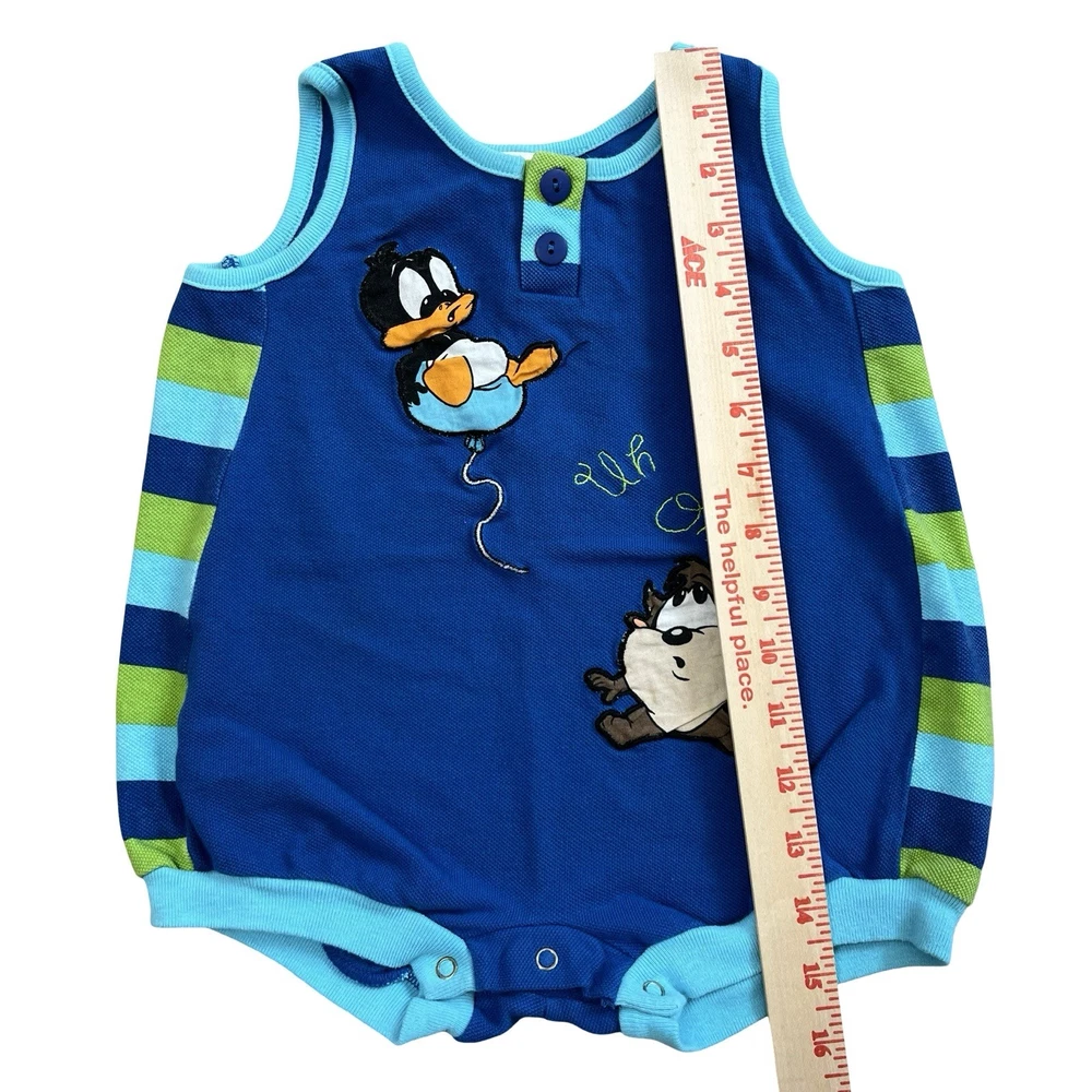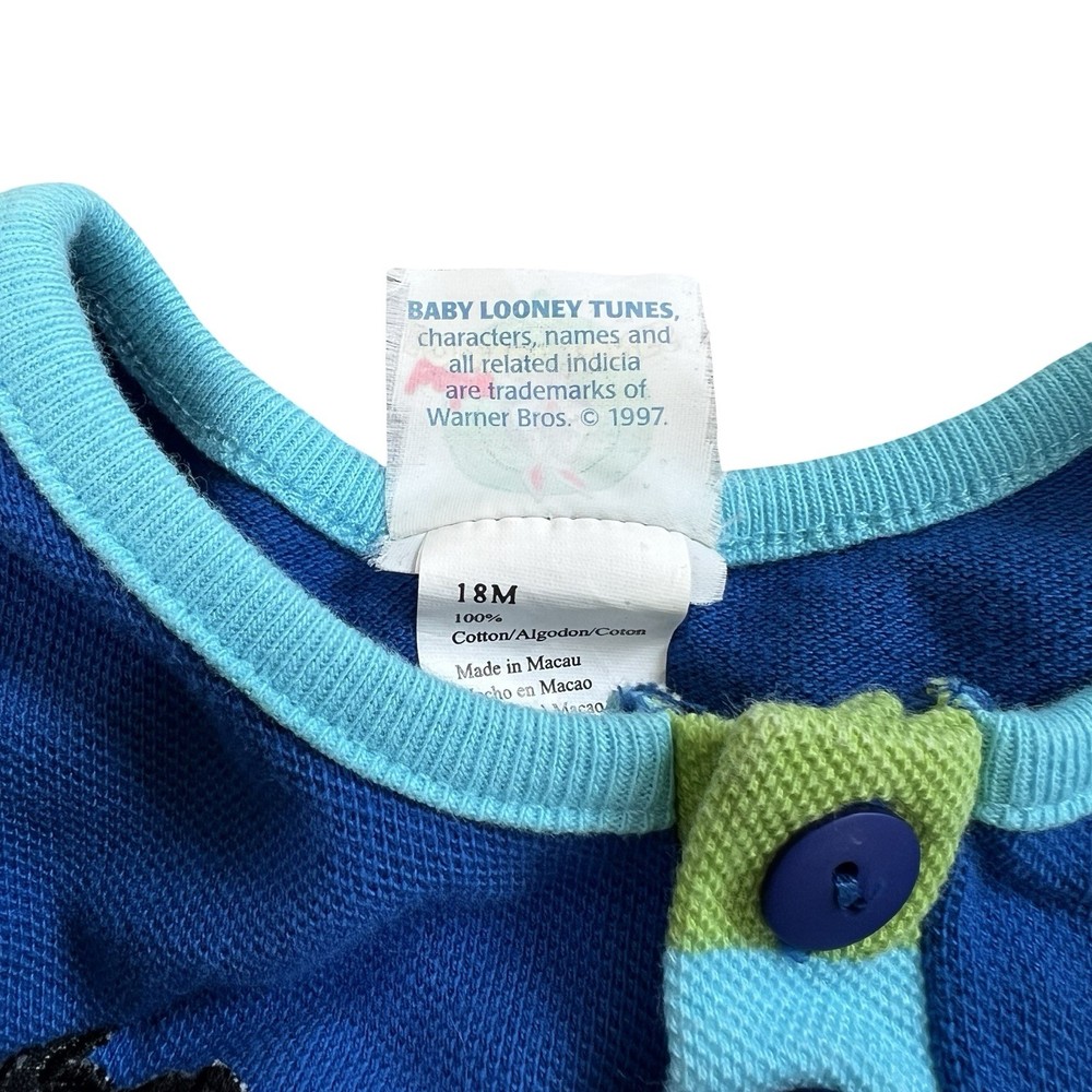 Brand: Baby Looney Tunes Style: Romper one-piece with embroidered/applique9 Daffy Duck and Taz on front Material: 100% Cotton Jersey Size: 18 Months Department: Unisex Baby & Toddler Color: Blue body with light blue trim and green/blue striped side panels Type: One-Piece romper, snap crotch closure, two-button placket, ribbed trim Pattern: Striped Made in Macau. Tag reads: BABY LOONEY TUNES, characters, names and all related indicia are trademarks of Warner Bros. A9 1997 Vintage: Yes - 90s Keywords: Baby Looney Tunes, Daffy Duck, Taz, vintage baby romper, 90s, striped, 100% cotton