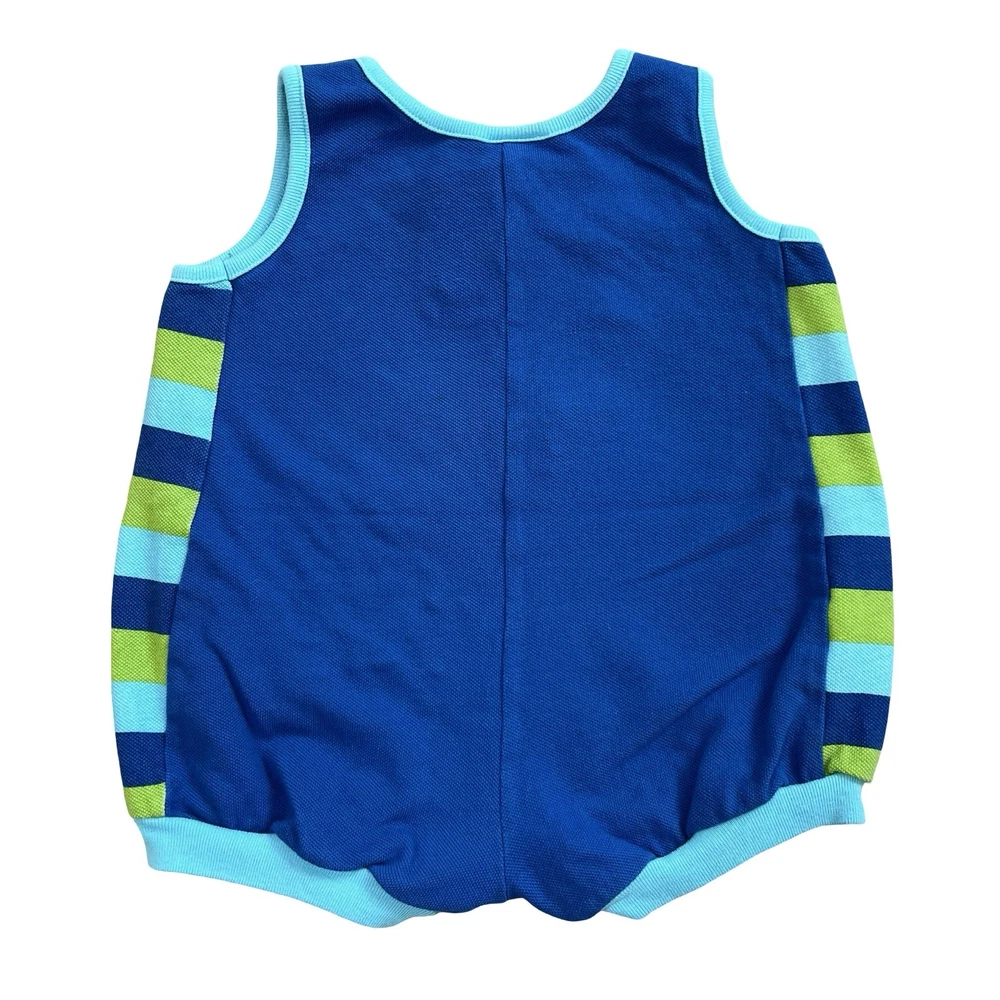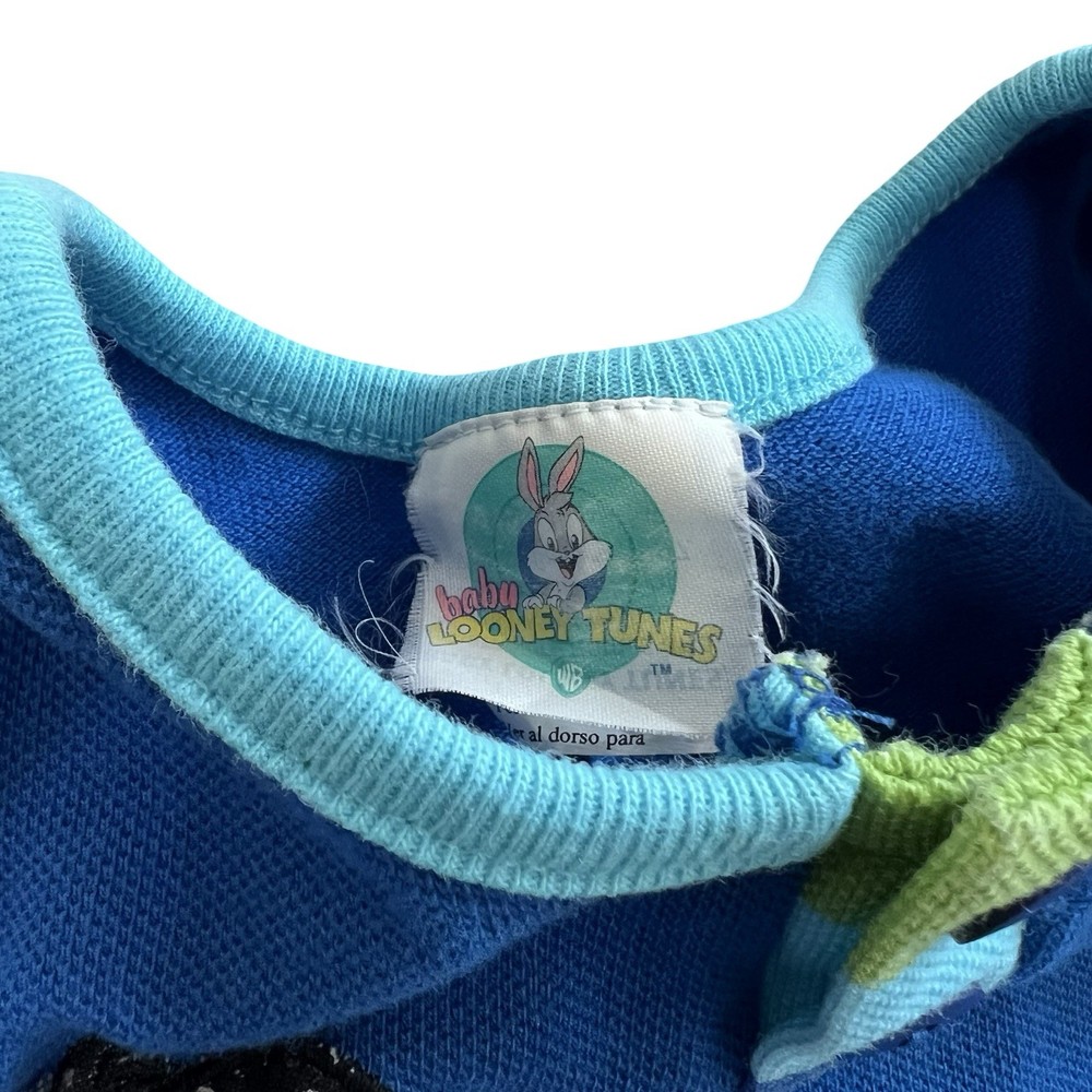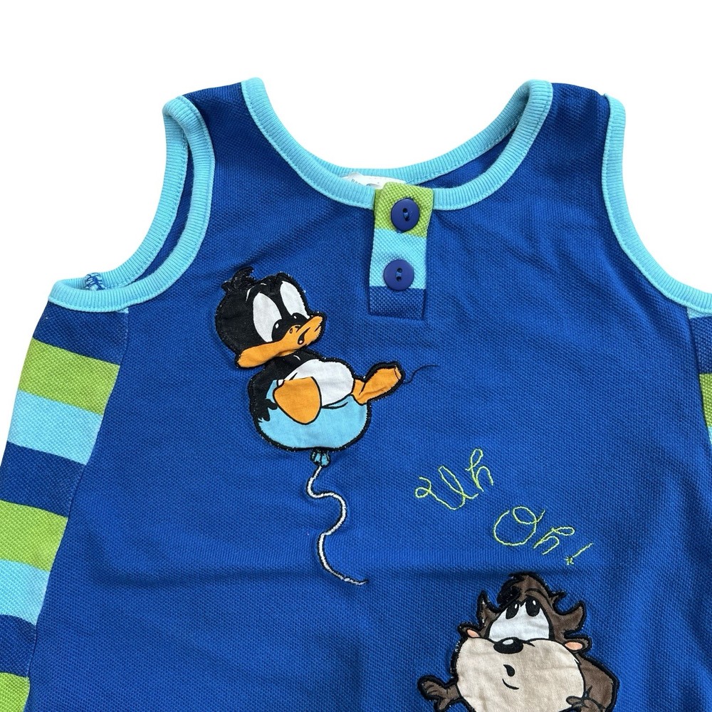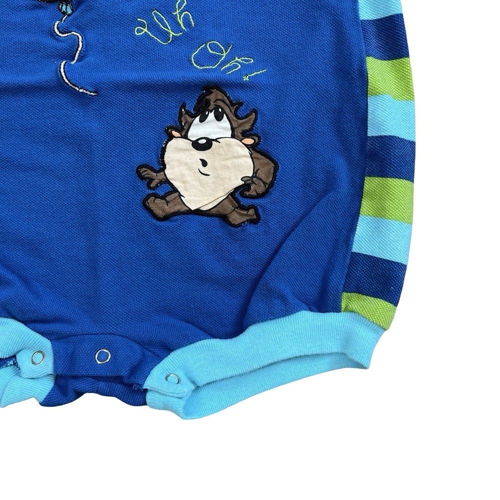 Brand: Baby Looney Tunes Style: Romper one-piece with embroidered/applique9 Daffy Duck and Taz on front Material: 100% Cotton Jersey Size: 18 Months Department: Unisex Baby & Toddler Color: Blue body with light blue trim and green/blue striped side panels Type: One-Piece romper, snap crotch closure, two-button placket, ribbed trim Pattern: Striped Made in Macau. Tag reads: BABY LOONEY TUNES, characters, names and all related indicia are trademarks of Warner Bros. A9 1997 Vintage: Yes - 90s Keywords: Baby Looney Tunes, Daffy Duck, Taz, vintage baby romper, 90s, striped, 100% cotton