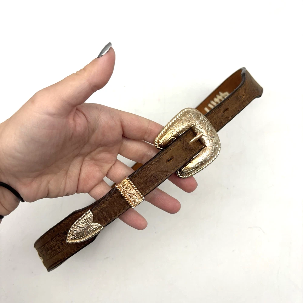 Vintage 90s 3D Women's Western Belt Made in USA Style Code: 603 Brown Genuine Leather White Whipstitch Accents Three 1/2" x 3/4" Oval Rose Gold-tone Floral Conchos Rose Gold-tone Floral Engraved Interchangeable Buckle Women's Size 28 Refer to measurements below to ensure accurate fit before purchase! Buckle: 2" long 2" wide Belt Measurements: 1 1/8" wide 3/4" wide at ends 33" full length from buckle prong to belt end 25" smallest hole 29" largest hole 5 holes total Great vintage pre owned condition. Very gently owned. No rips, tears, stains, holes or other notable flaws. Clean and from a smoke free home.