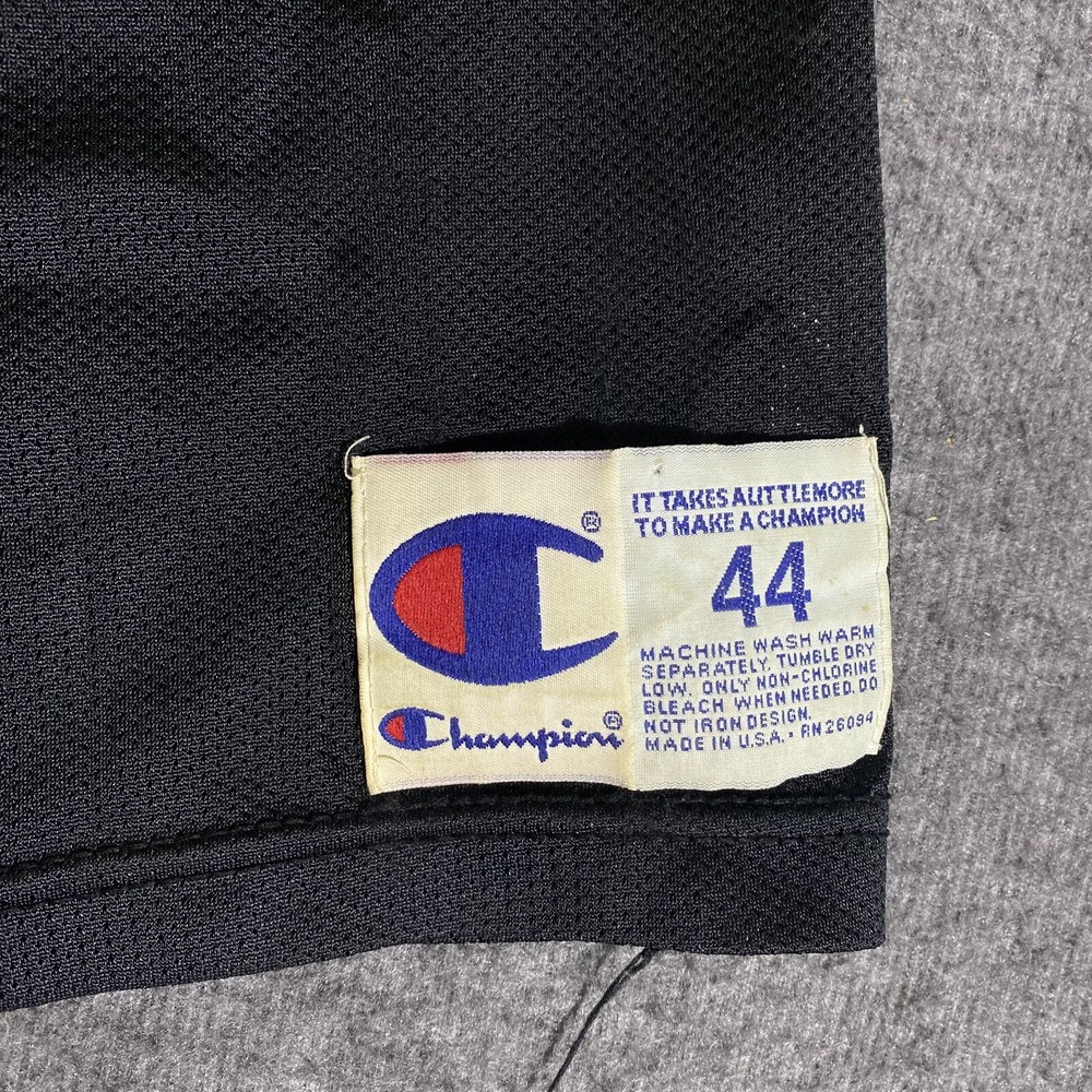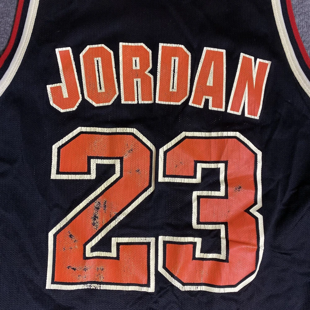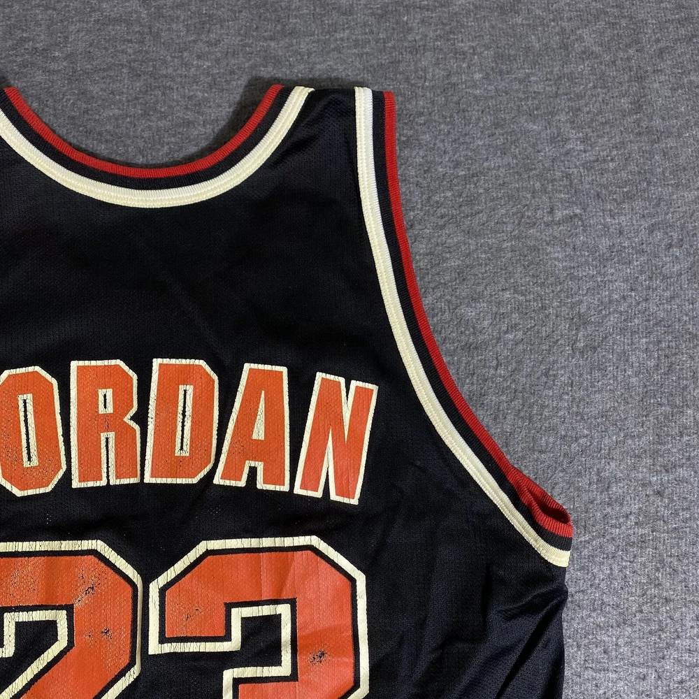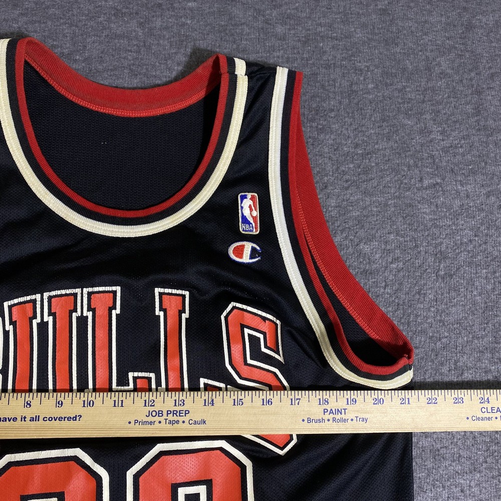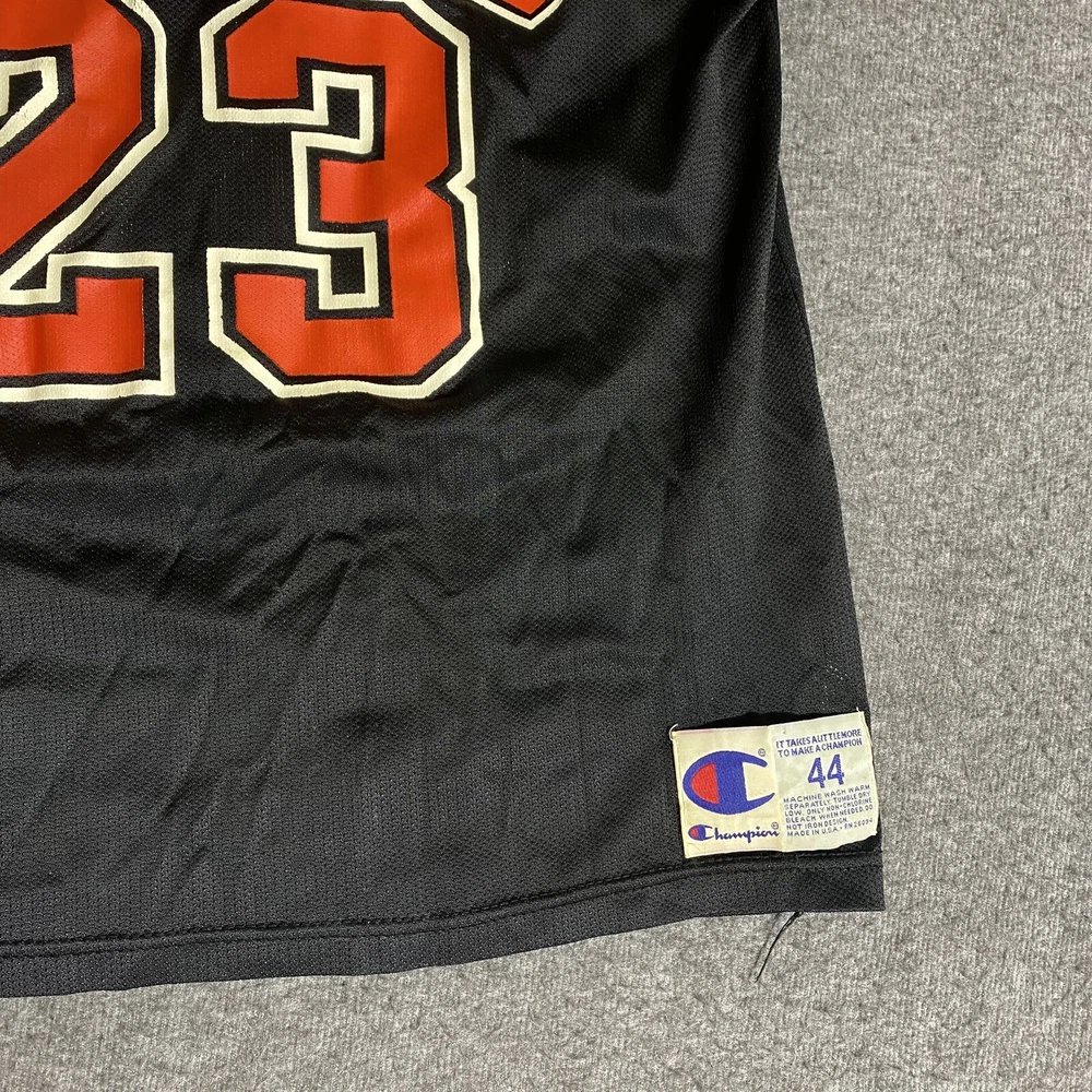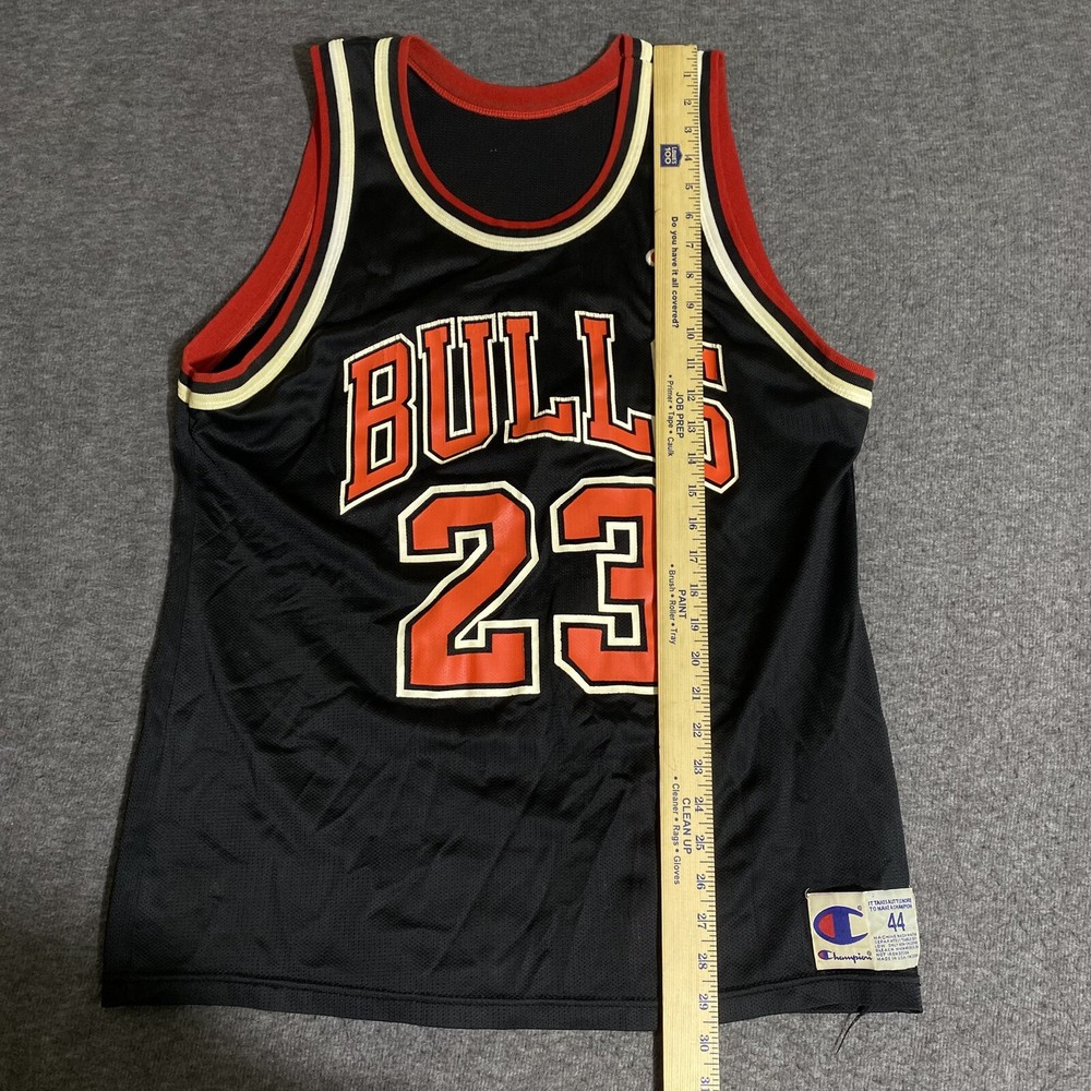 Rare Vintage Champion 90s Made in USA Chicago Bulls Michael Jordan Jersey Adult Men’s Size 44 Large. Good used condition. Has obvious signs of wear and fade. Yellowing on the white on sleeves and numbers. Has some cracking and the neck tag has been removed. All flaws shown in photos. Besides yellowing, no major stains, no rips, holes, tears, or major damage. Measurements in photos and description! MEASUREMENTS Pit to pit: 21 inches Length: 29.5 inches Shown in photos! ** This item has been washed and cleaned per eBay’s used clothing policy. ** Ships within 24 hours of purchase via USPS Ground Advantage.