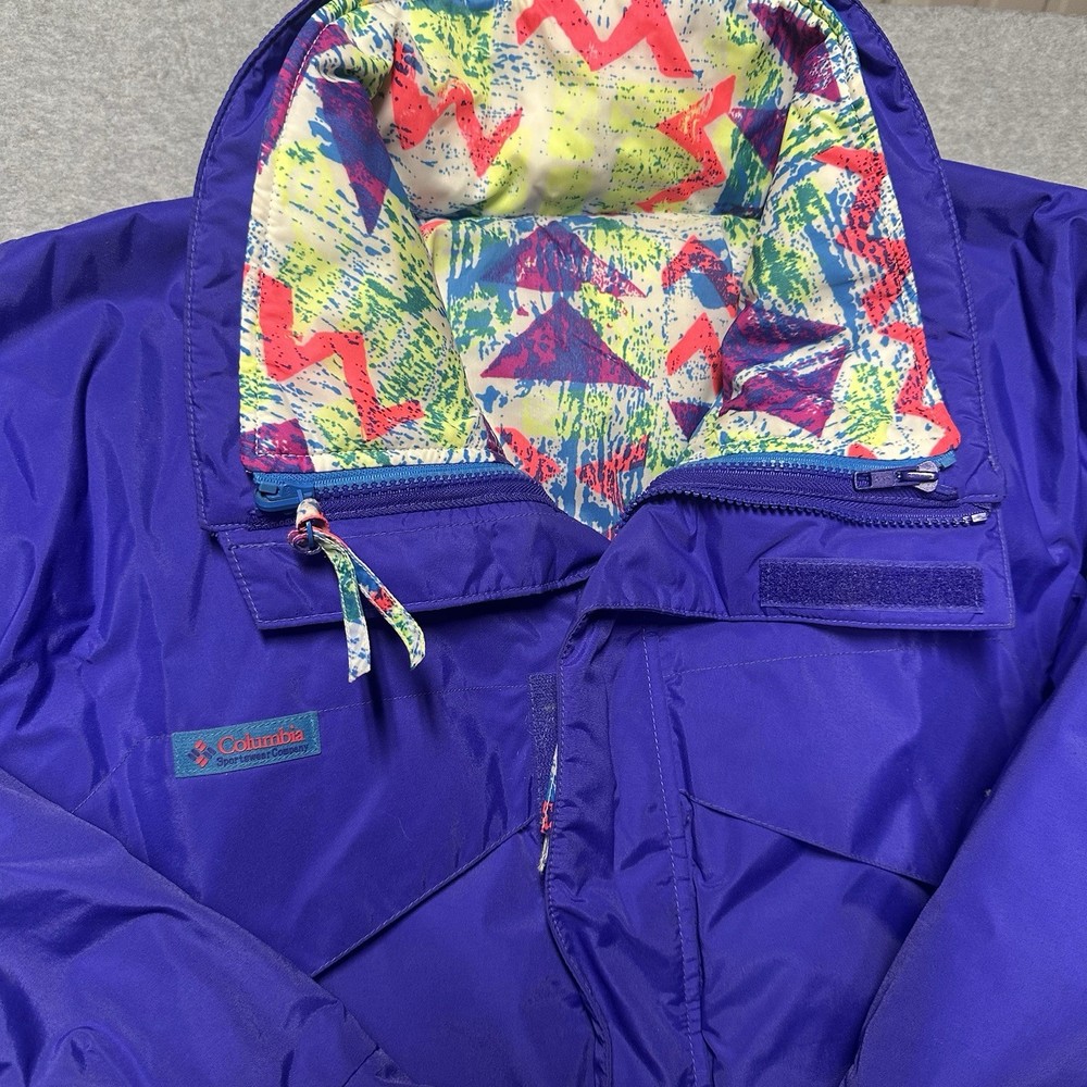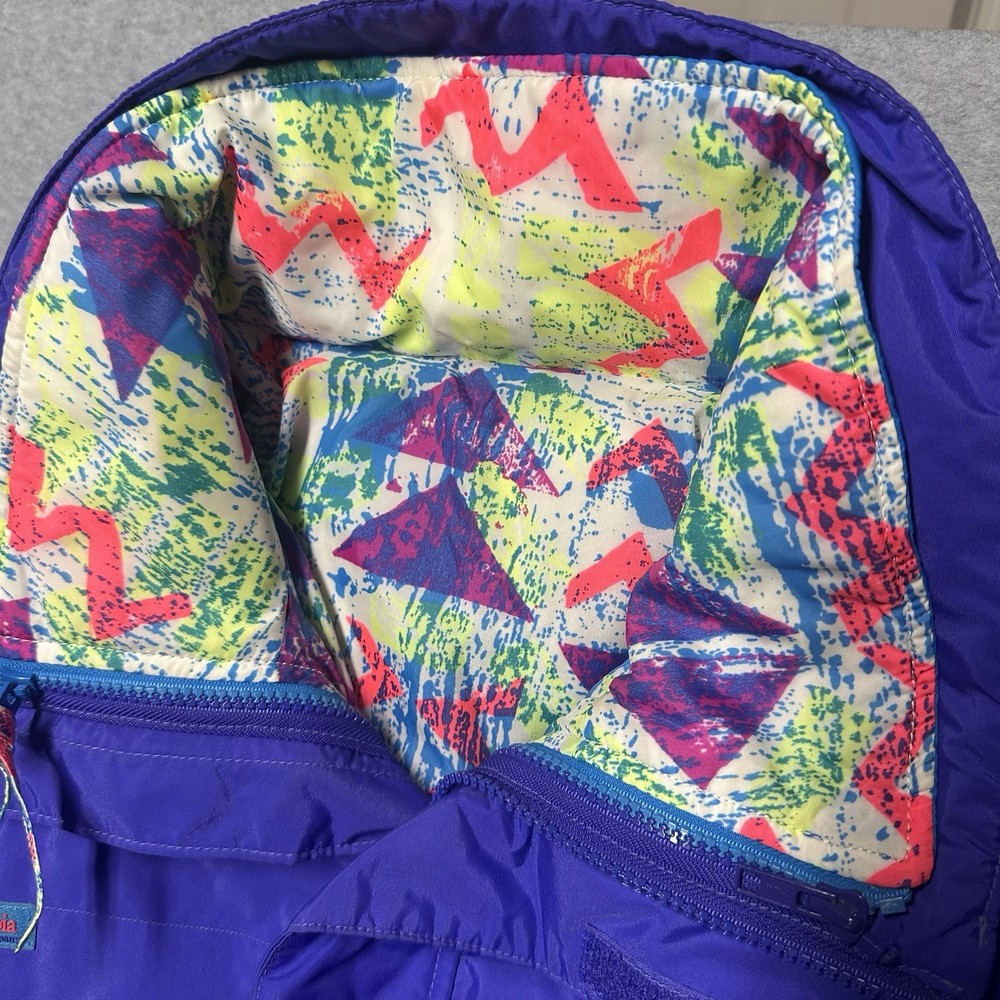 The Vintage Columbia Neon Bugaboo Ski Jacket is a retro piece from the 90s, featuring a colorful multicolor design with a unique radial sleeve and zipper accents. Made from durable nylon, this 3-in-1 jacket is perfect for casual occasions and outdoor activities like skiing and snowboarding. With waterproof features and multiple pockets for convenience, this Columbia Bugaboo Interchange model is a stylish and functional choice for men looking to add a touch of nostalgia to their winter wardrobe. This coat is in great shape and made fully of reflective material. You have the blue coat that lines the purple coat. The coat is reversible to full neon print that you can see in the interior of the coat.