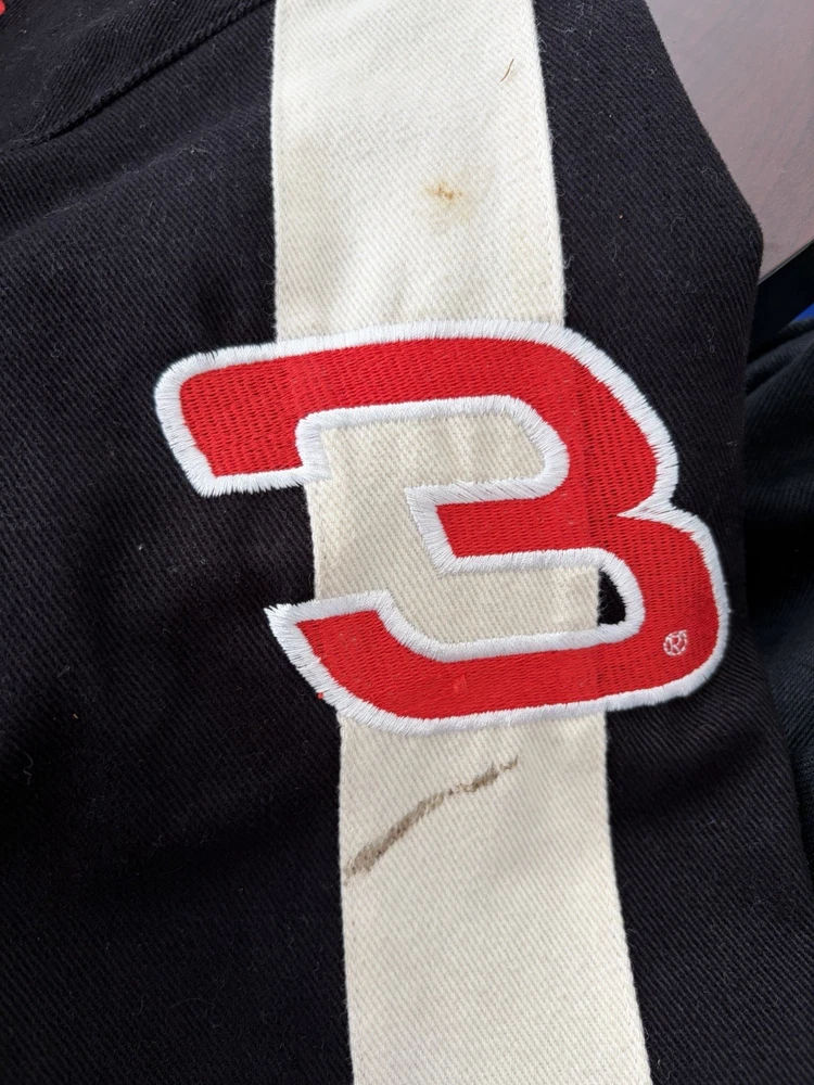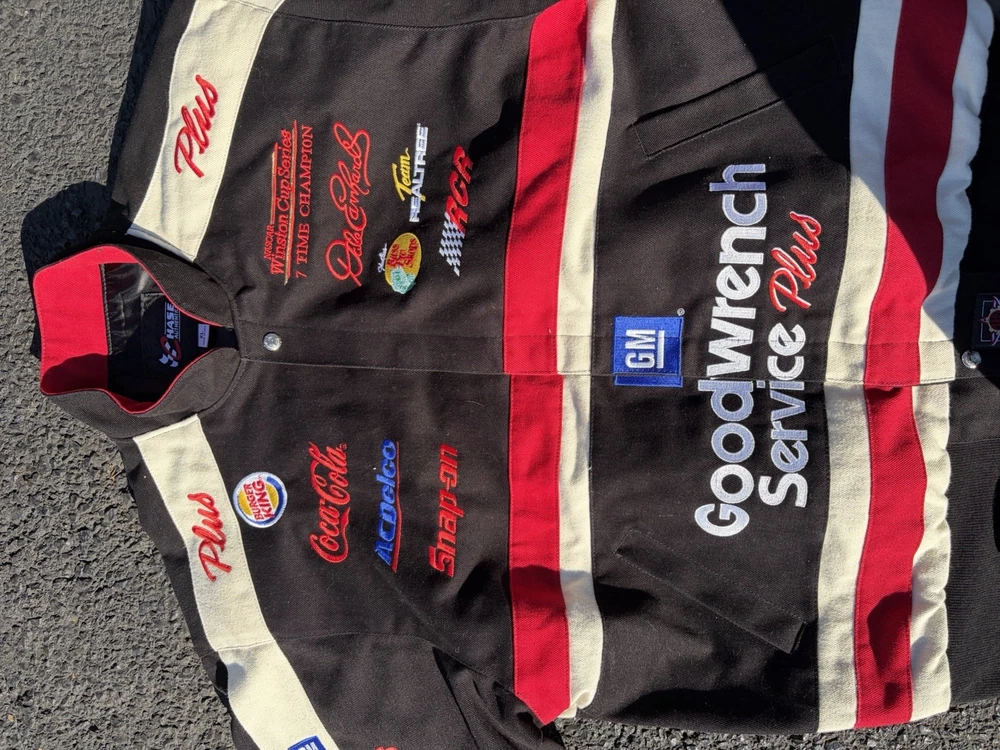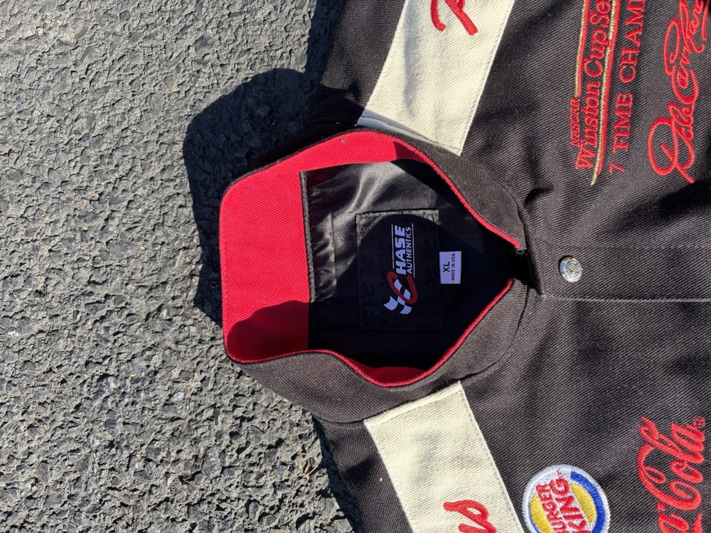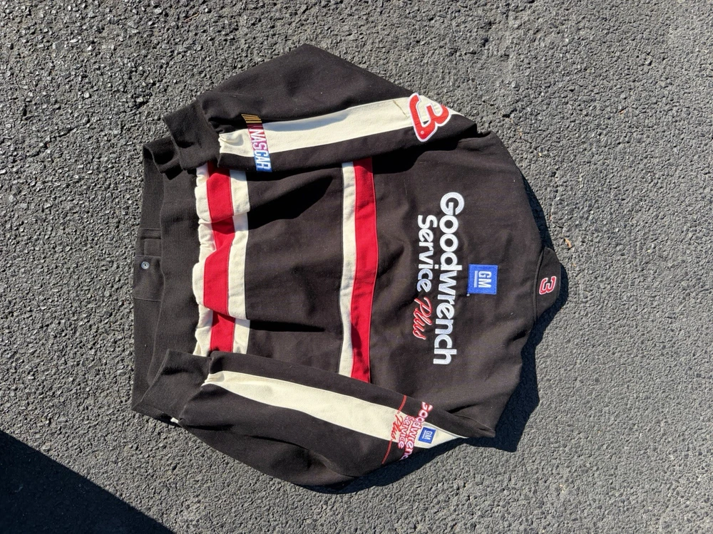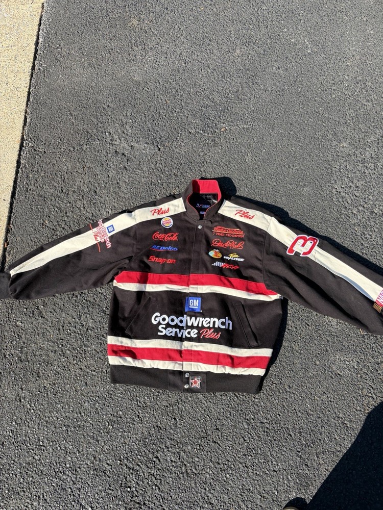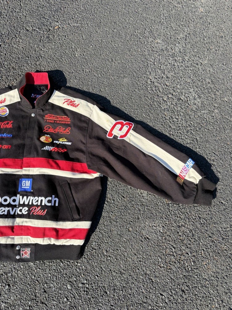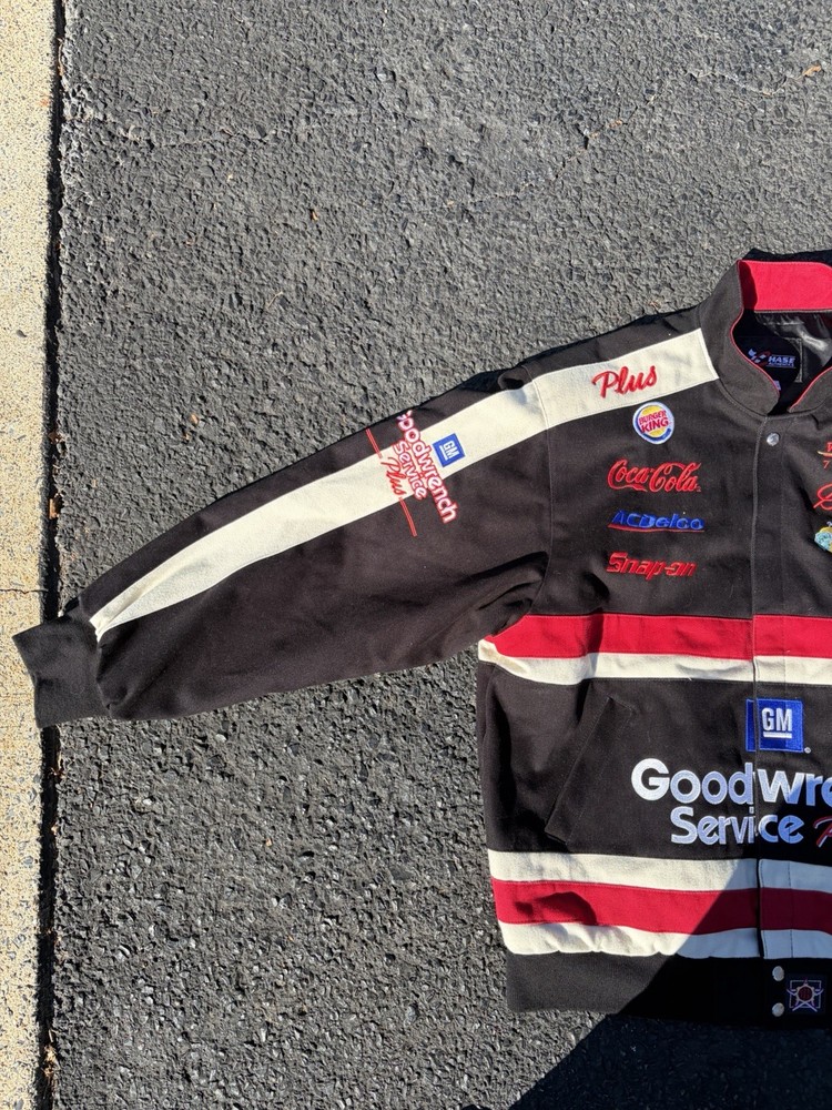 The Vintage 90s Dale Earnhardt Good Wrench Chase Authentics Racing Jacket in Mens XL is a black jacket featuring the legendary driver Dale Earnhardt Sr. It is officially licensed by NASCAR and features the iconic Earnhardt Ganassi Racing team logo. This jacket is a must-have for any fan of NASCAR or auto racing, showcasing the iconic black and green colors associated with Dale Earnhardt's racing career. Made by Chase Authentics, this jacket is a timeless piece that pays homage to one of the greatest drivers in NASCAR history. Only flaw is shown in last pic