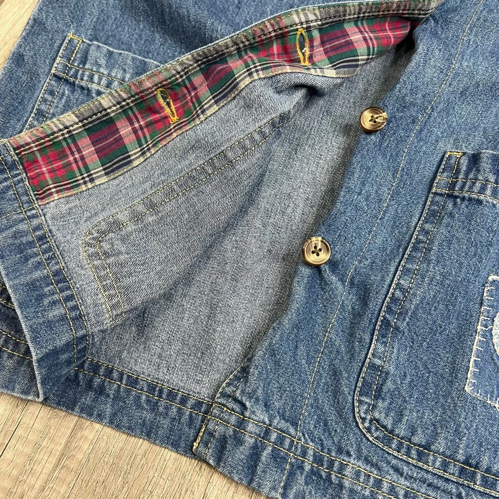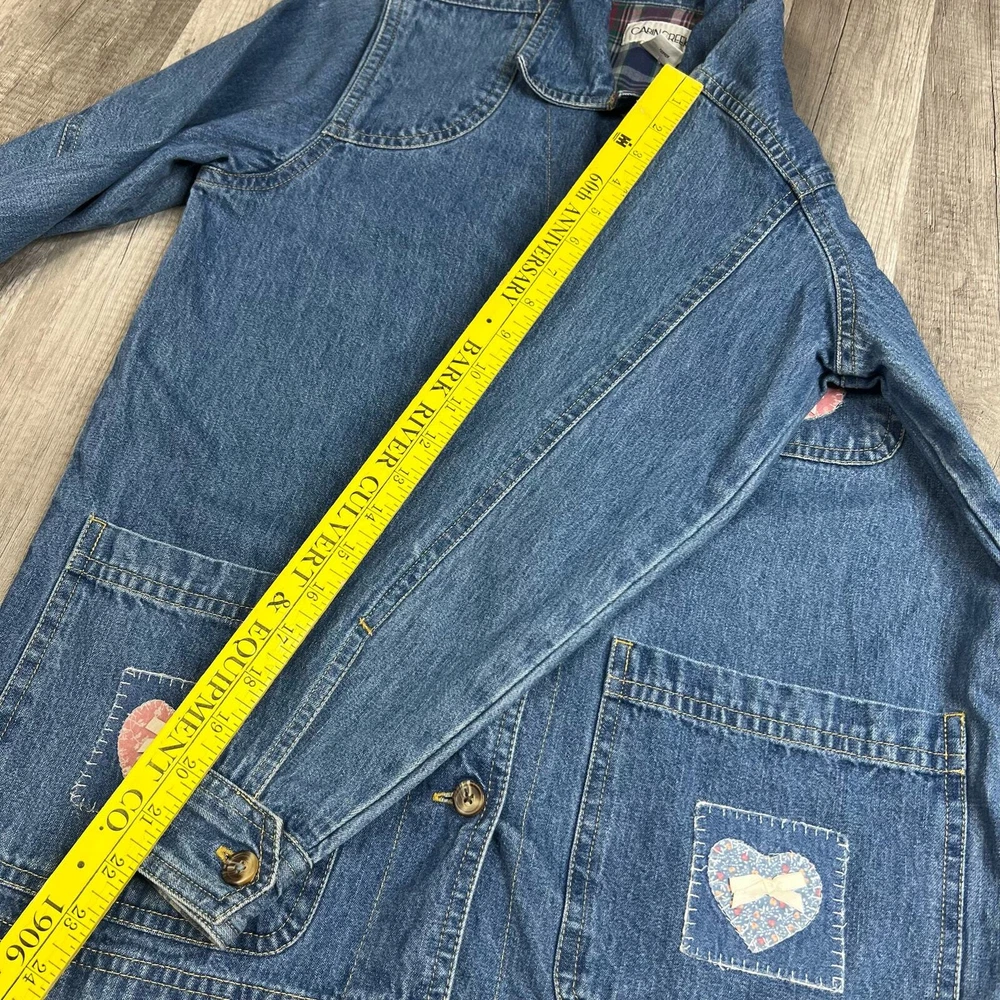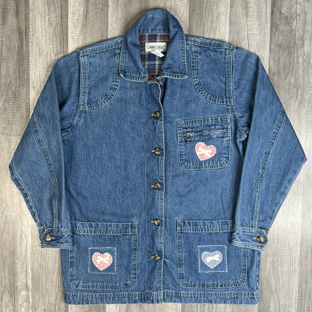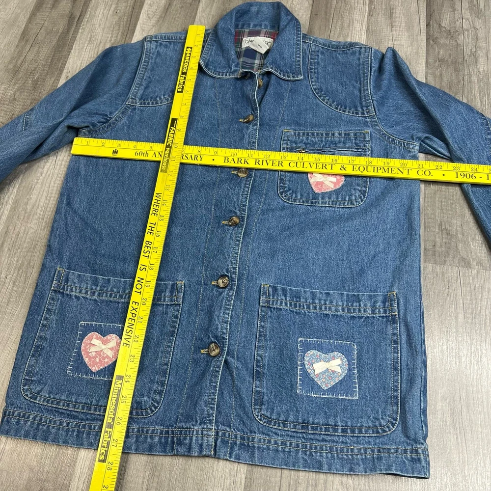 Vintage 90s Denim Jean Button Front Jacket with Plaid Trim and Heart Patches, Cabin Creek Brand, Size Small Petite Oversized Fit, Good Condition Measurements (approximate): Laying Flat not Doubled Pit to Pit: 20 3/4” Length: 27 1/4” Sleeve Length 21 3/4"