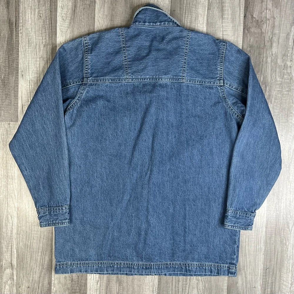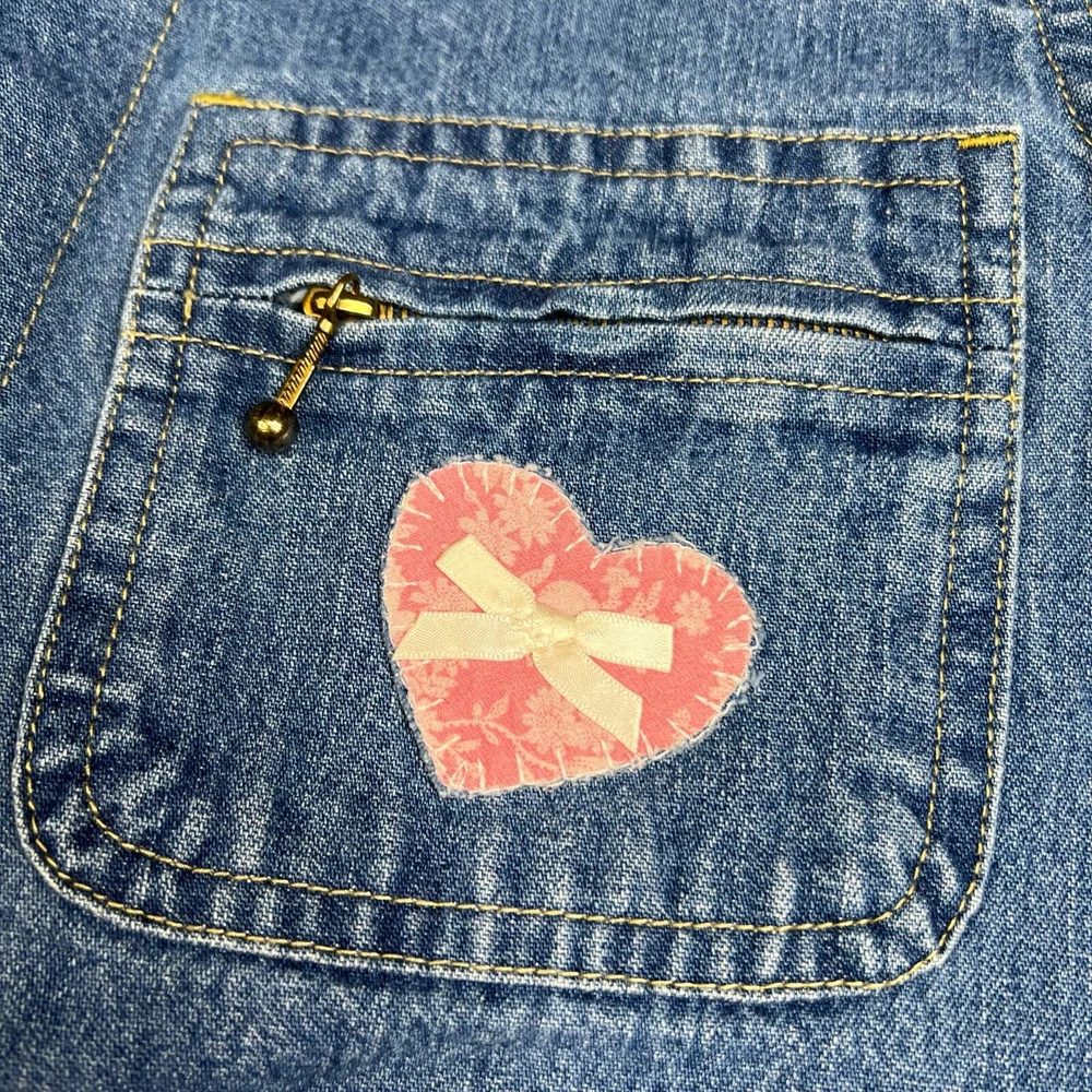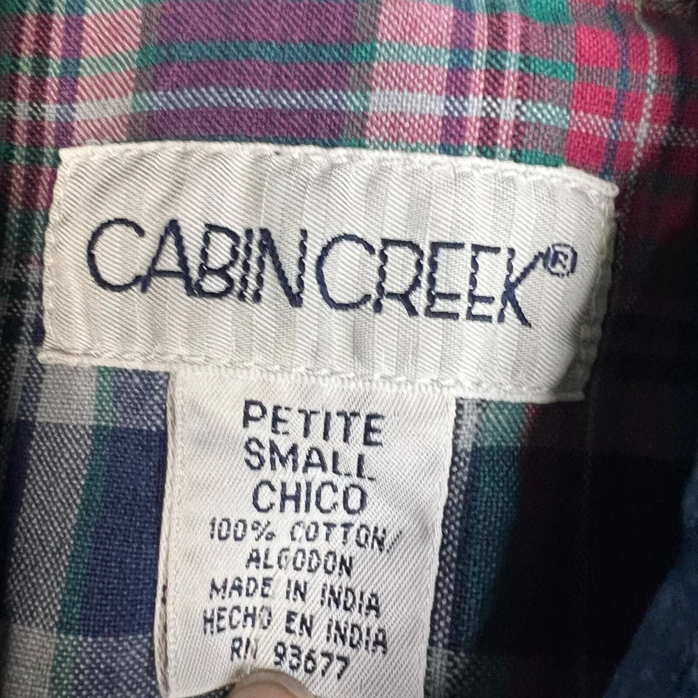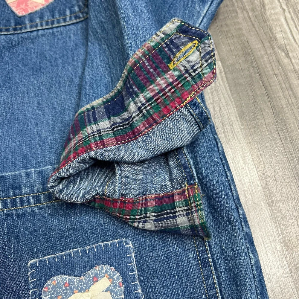 Vintage 90s Denim Jean Button Front Jacket with Plaid Trim and Heart Patches, Cabin Creek Brand, Size Small Petite Oversized Fit, Good Condition Measurements (approximate): Laying Flat not Doubled Pit to Pit: 20 3/4” Length: 27 1/4” Sleeve Length 21 3/4"