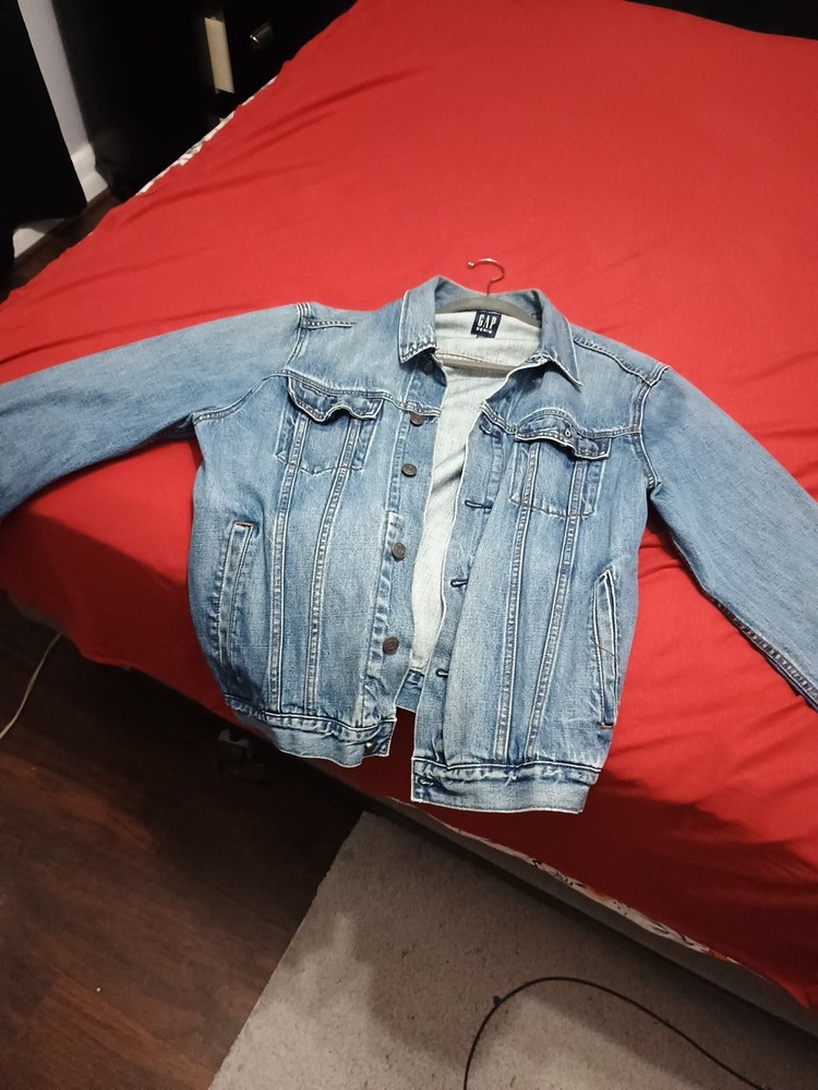 This vintage 90s Denim Trucker Jacket by Gap is a classic piece made in the USA with a solid blue color and button closure. Perfect for casual, travel, or party occasions, this jacket features a retro 80s style with a point collar and American theme. With a size large and all-season versatility, this denim jacket is a timeless wardrobe staple for men looking to add a touch of vintage Americana to their look.