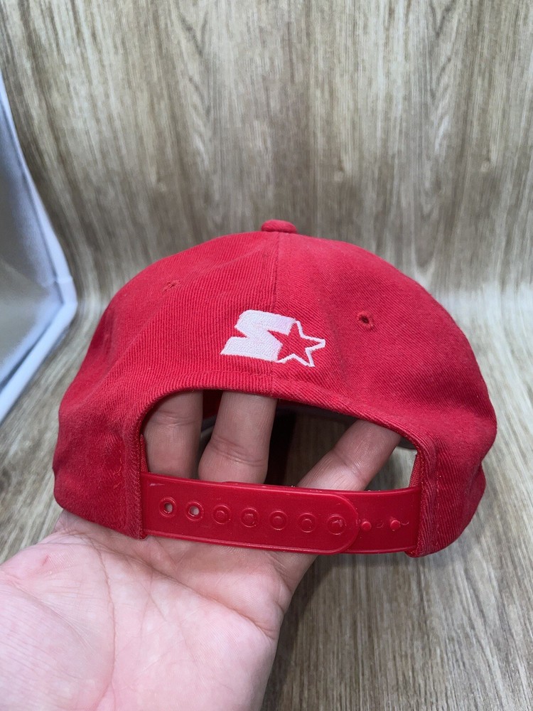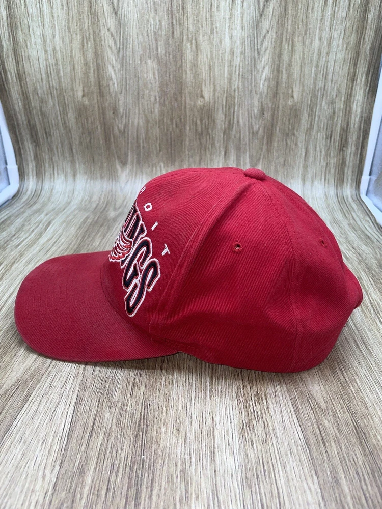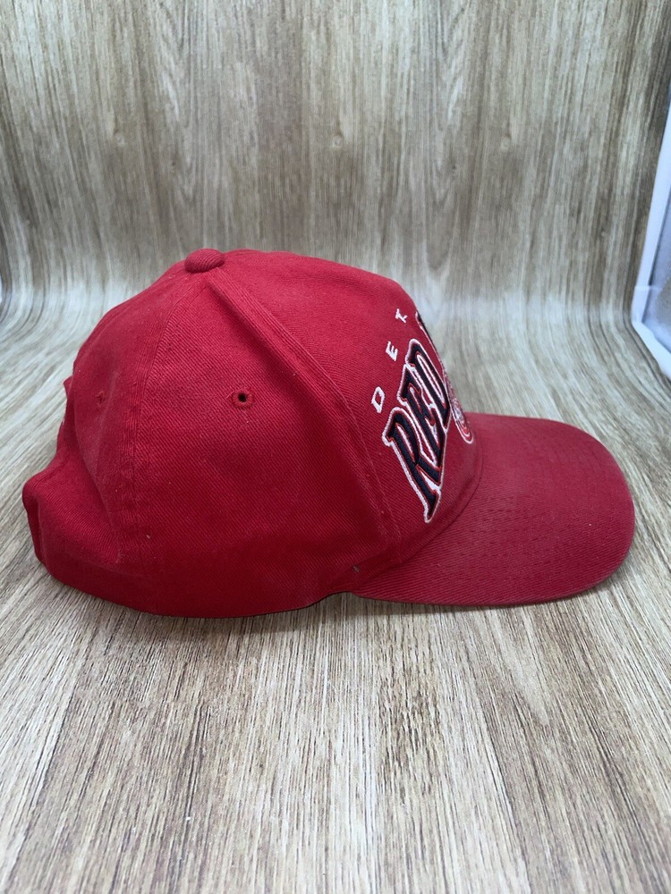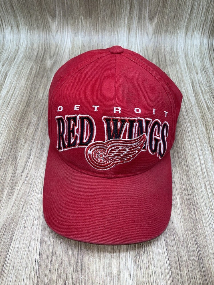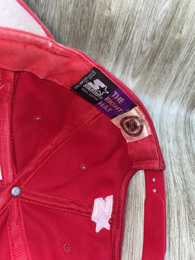 Lite wear and used The product is a vintage 90's Detroit Red Wings Starter SnapBack Hat in red, officially licensed by the National Hockey League (NHL). It is designed for unisex adults and features the iconic Starter brand logo. The hat is one size fits all and is a classic fan apparel piece for supporters of the Detroit Red Wings hockey team. Perfect for adding a touch of nostalgic style to any fan's collection, this preowned hat embodies the spirit of hockey fandom from the 1990s.