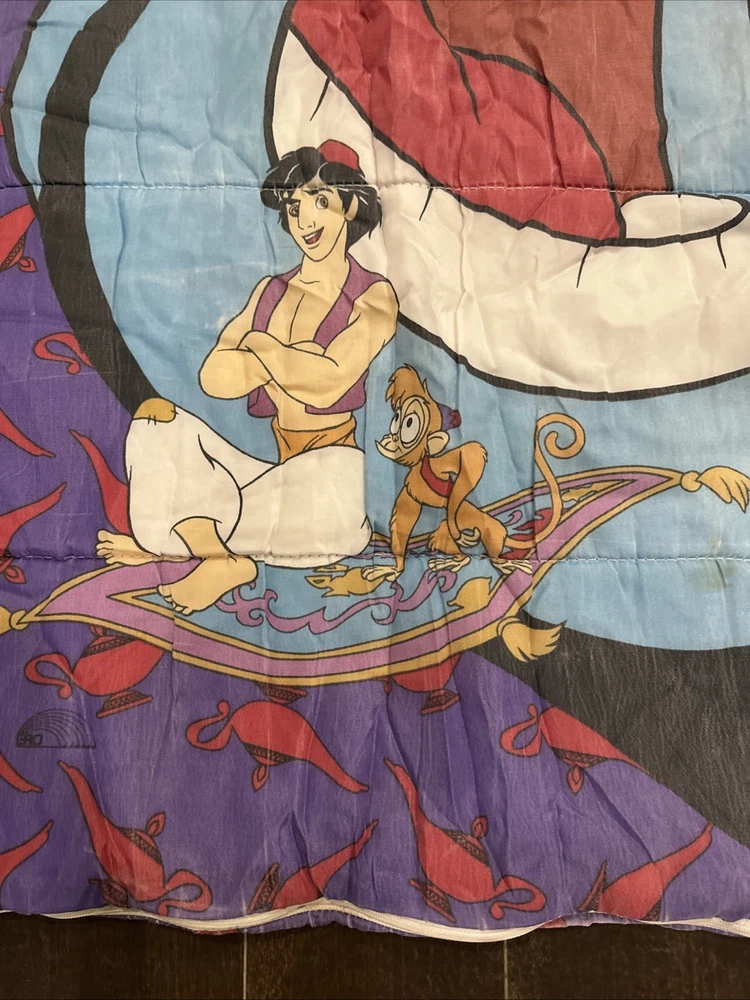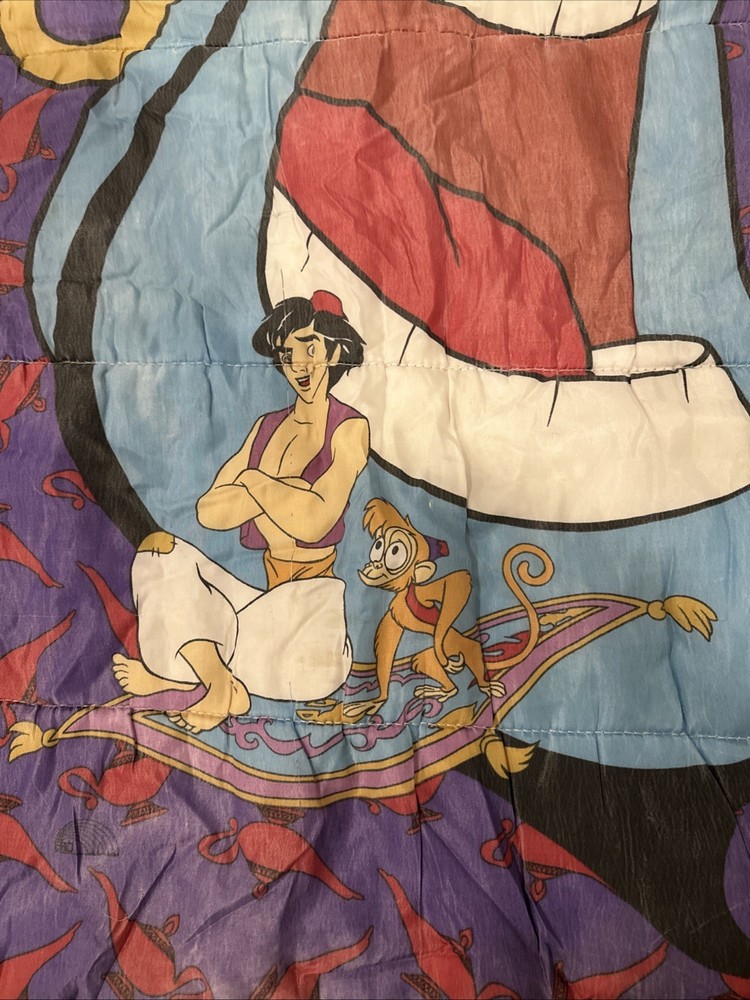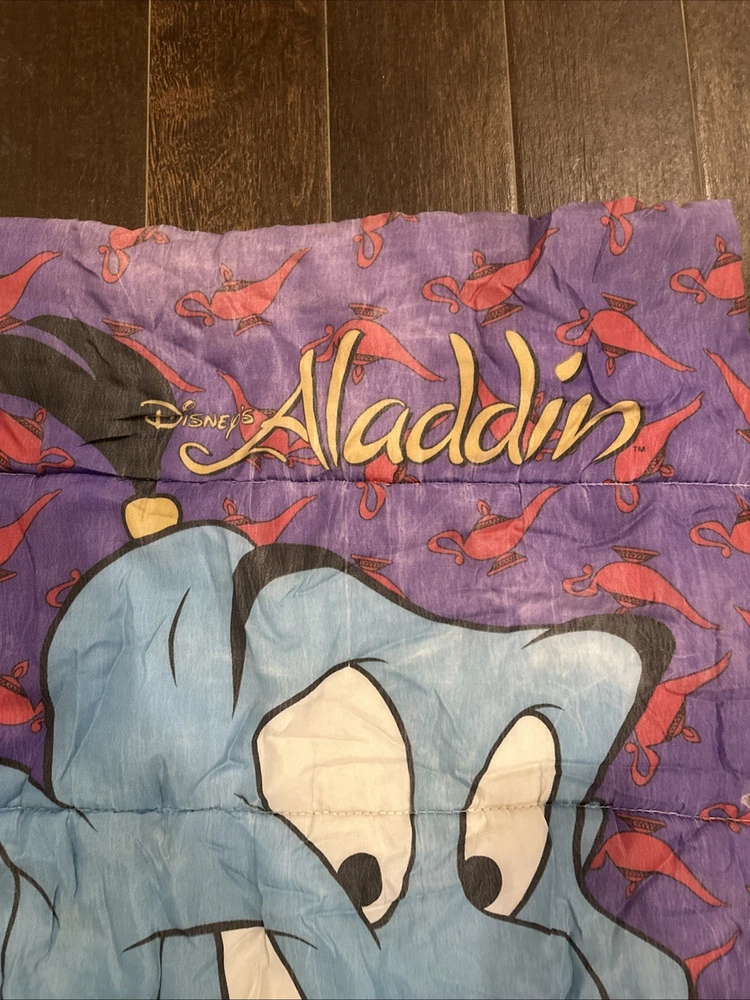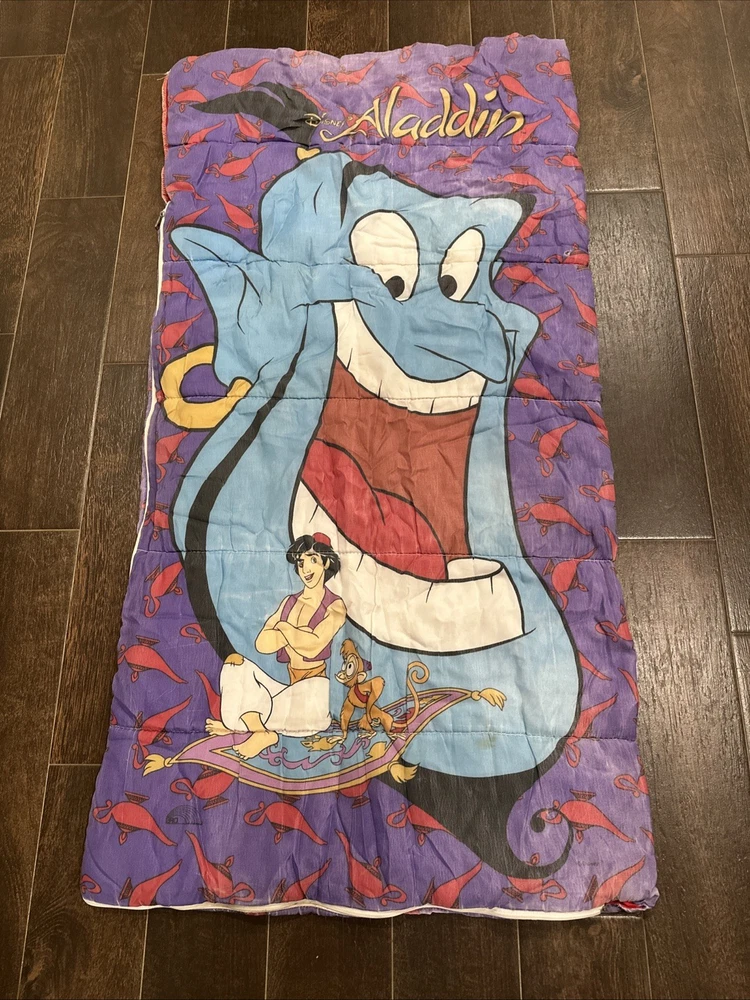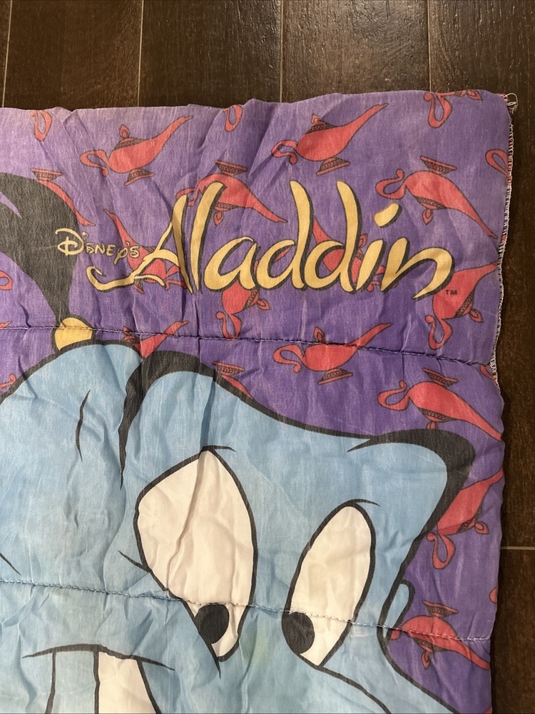 The product is a vintage 90s Disney Aladdin Genie Abu spell out sleeping bag blanket, featuring characters from the Disney movie Aladdin. The multicolor sleeping bag has dimensions of 29"x56" and is a standard size, making it suitable for kids and teens. With its nostalgic design and iconic characters, this sleeping bag is perfect for any Disney or Aladdin fan looking for a fun and cozy addition to their bedding collection.