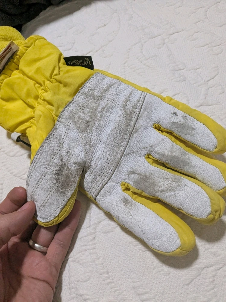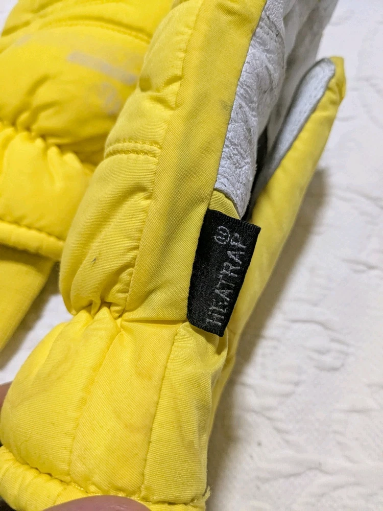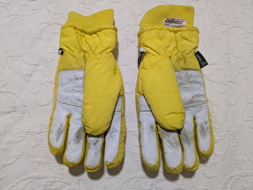 As you can see the grip area is coming undone a little bit. Please ask if you have any questions at all. I'll be happy to answer them. These have plenty of life left in them. Vintage 90's Gordini Winter Gloves in yellow and black color, featuring Gortex material for waterproofing. These large-sized ski gloves are made of 100% Nylon with polyester insulation. The design includes a logo accent, suitable for winter sports like skiing. Made in Korea, Republic of, these neon-themed gloves are a stylish and functional choice for men.