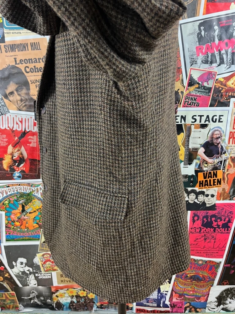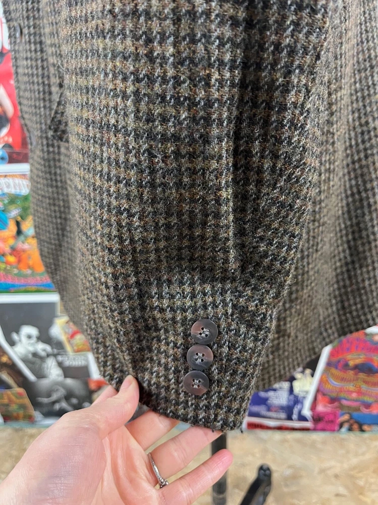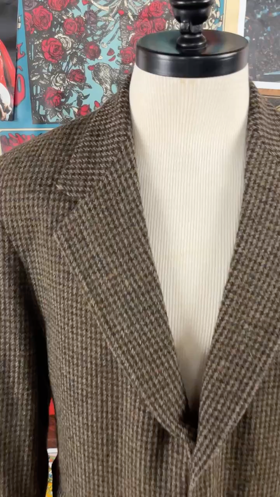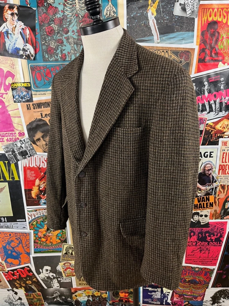Vintage men's 90s brown tweed houndstooth single breasted sport coat by Haggar. Tagged size 44L. In good, pre-owned condition. Features built in shoulder pads. shoulders -- 20" chest -- 44" waist -- 43" sleeve length from shoulder seam -- 26" bottom of collar to sleeve cuff -- 33" total length -- 33.5" *please note any shipping overages will be refunded