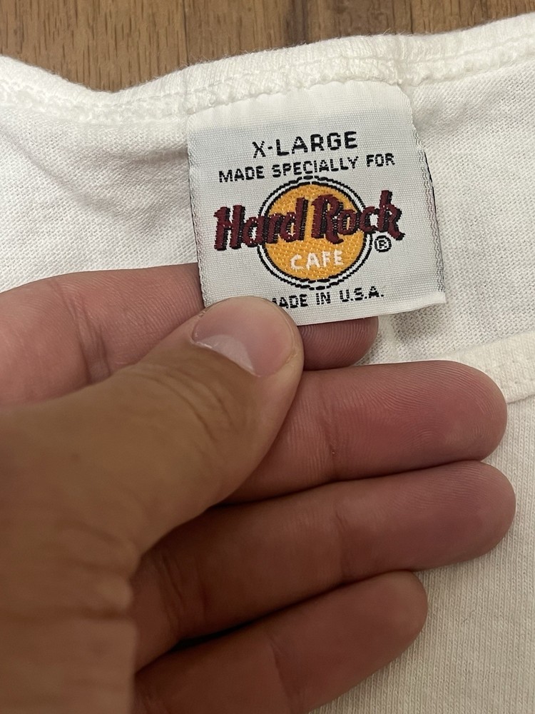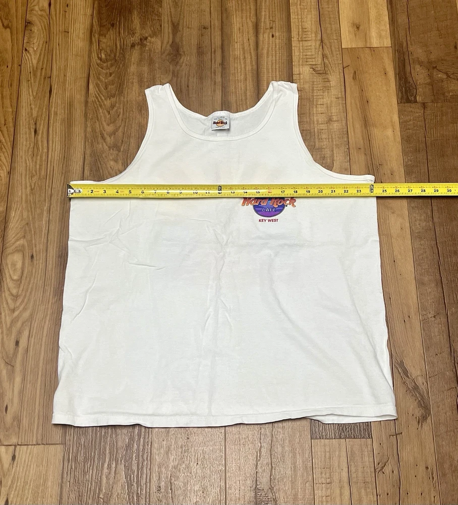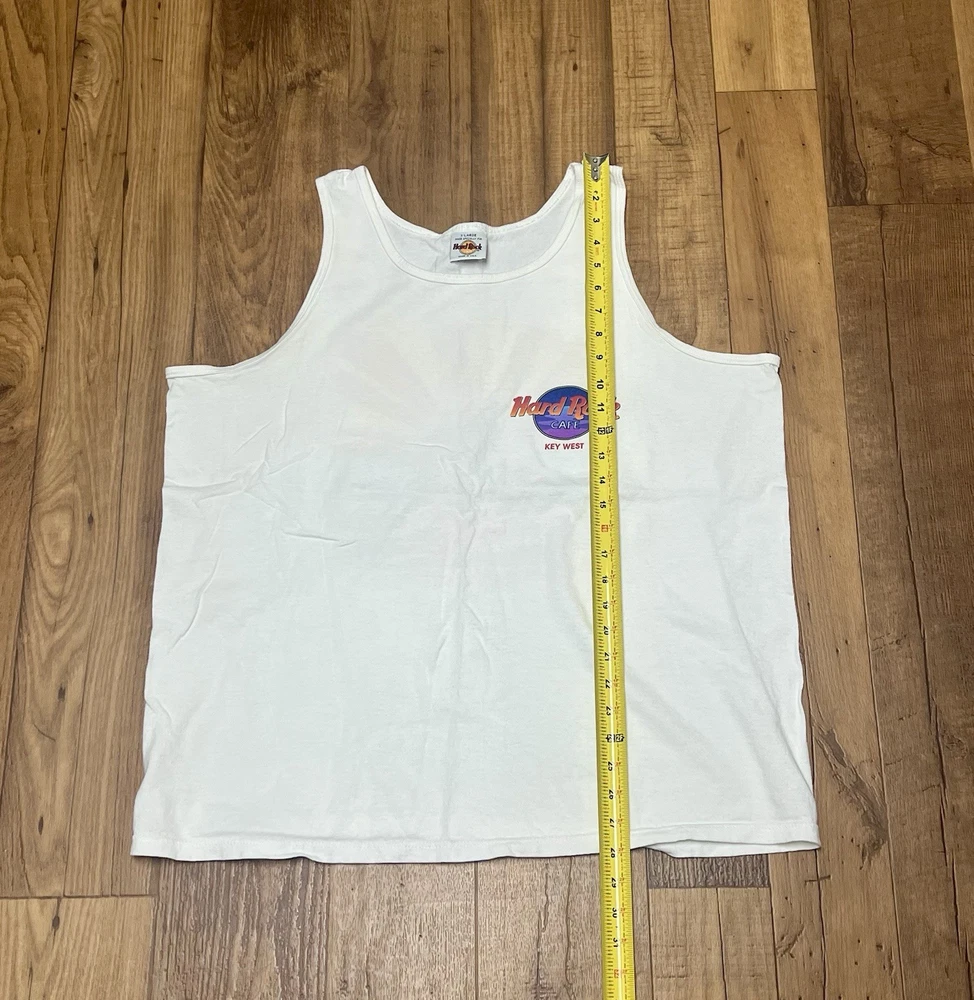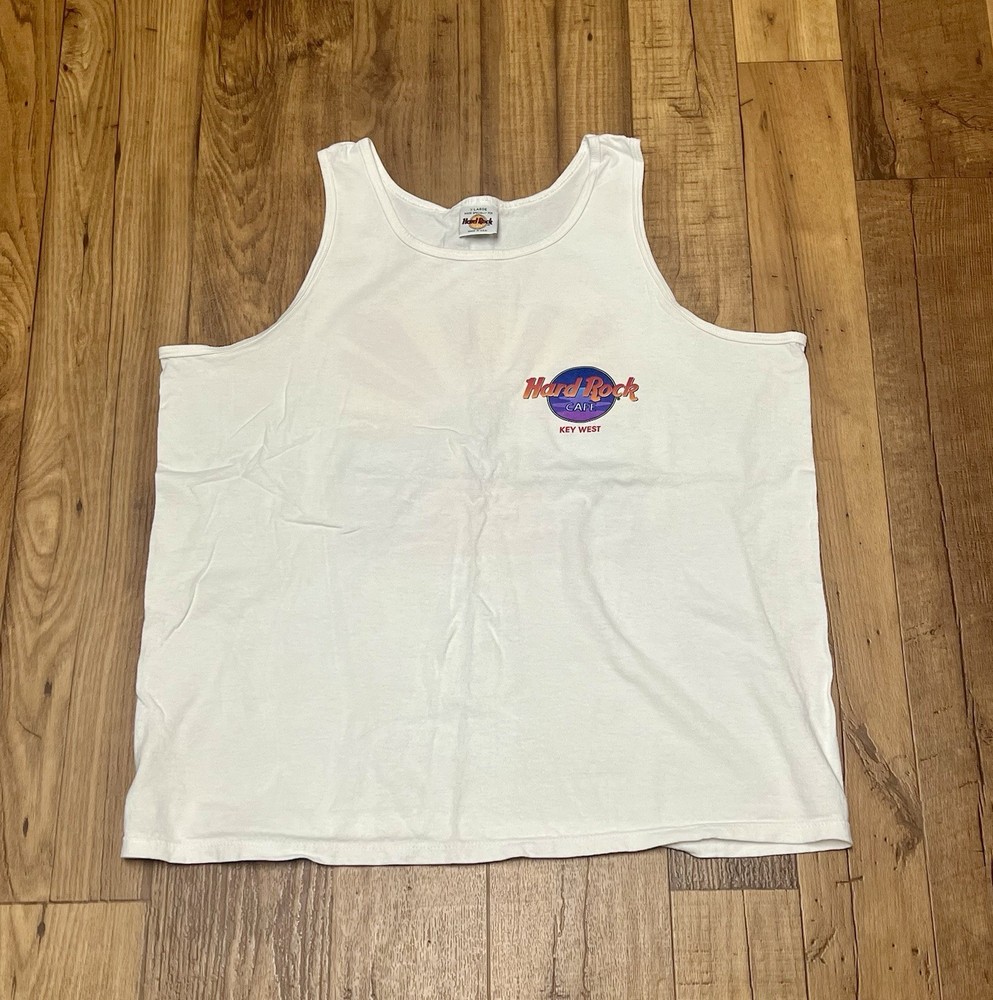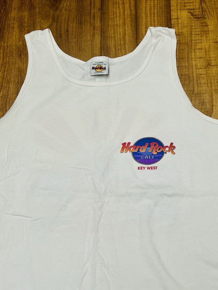 The product is a vintage 90s Hard Rock Cafe Key West tank top shirt in size XL. Made of cotton with a graphic print on both sides, this white shirt features the iconic Hard Rock Cafe brand and is machine washable for easy care. Perfect for men who enjoy a 90s theme, this regular fit shirt is ideal for summer and spring seasons. Made in the United States, this double-sided t-shirt offers a unique and nostalgic addition to any wardrobe.