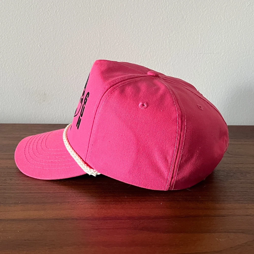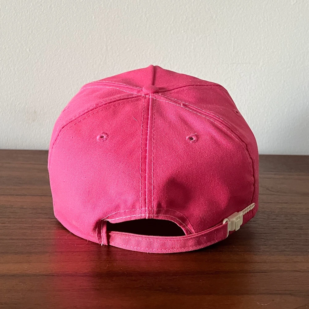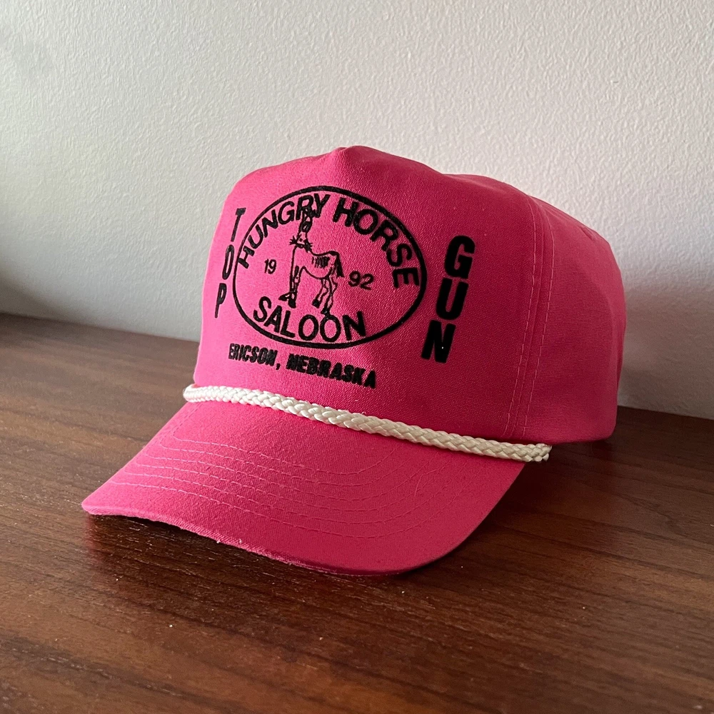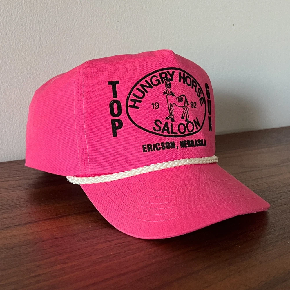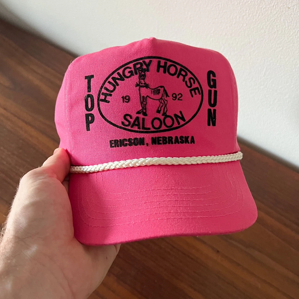 This vintage 90s hat is a unique addition to any collection. With a solid pink color and a pattern featuring a Hungry Horse Saloon in Nebraska, this baseball cap is perfect for casual occasions and adds a touch of Western style. The hat is made of a lightweight and breathable canvas material, making it suitable for all seasons. It is adjustable and one size fits all, making it a great gift option. The hat is not signed and is not personalized. It is perfect for anyone who loves streetwear, animals, horses, and funny city themes. Tag Size: One Size Condition: No Noticeable Flaws All items are second hand, many being vintage and may have small imperfections. Anything major is noted.