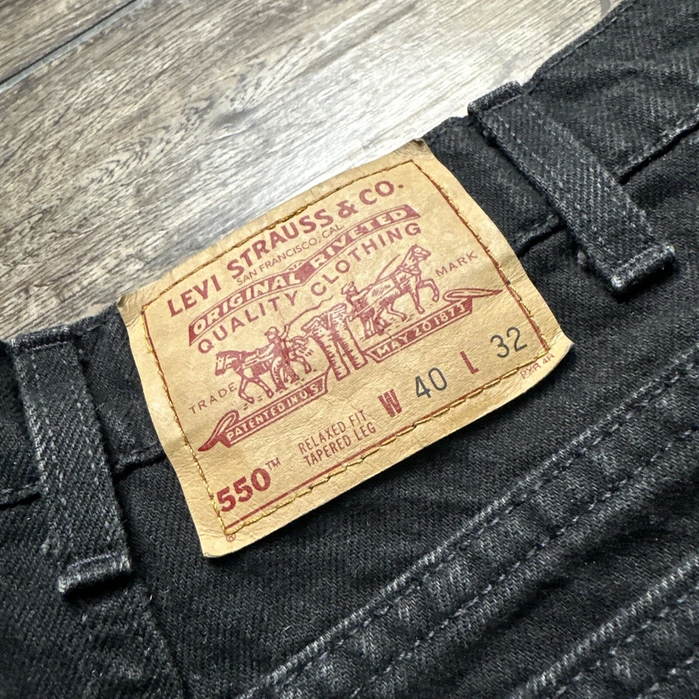 Please see pictures for an accurate description. Same-day business shipping. Pet loving smoke-free shipping home. Thank you so much for your interest. If you have any questions, please feel free to ask. Vintage 90s Levi's 550 Black Denim Jeans for men, featuring a true size 38 waist and 30-inch inseam. Made in the USA from 100% cotton with a charcoal wash. These relaxed fit, high-rise jeans have a tapered leg style and a classic 5-pocket design. They boast a red Batwing care tag, red tab, and embody a classic American theme from 1996.