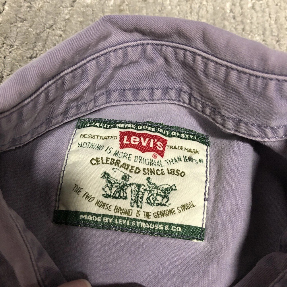 Vintage 90s Levi’s Denim Button Up Shirt Men’s Size L Purple Western Cowboy Preowned Good condition No major flaws that stand out. May have some minor spot that I missed. Size part of tag is missing, measurements are in pictures Please see pics and ask questions before purchasing Thanks!