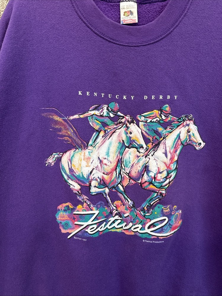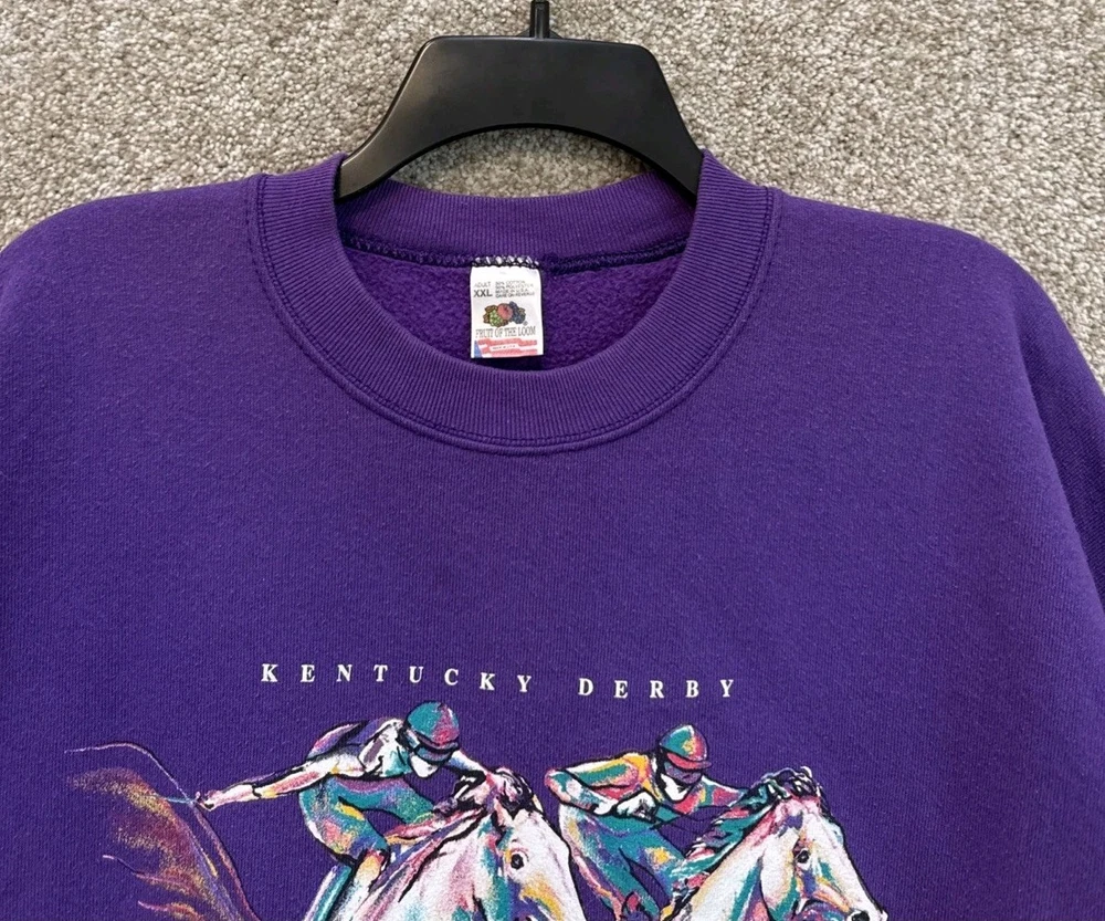 Very good, no holes or stains. Pre-Owned, Ships USPS Ground Advantage. Vintage 90s Mens 2XL Purple Kentucky Derby Horse Racing Crewneck Sweatshirt USA