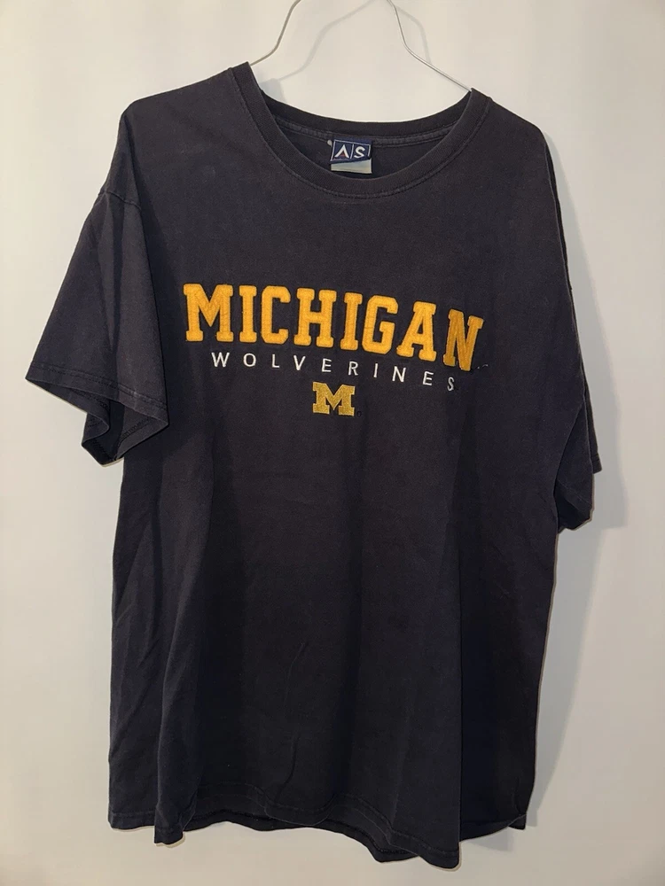 Show your love for the Michigan Wolverines with this vintage 90s NCAA college T-shirt from AS Sports. The shirt features an embroidered pattern with the team's name and a navy blue color that represents the team's spirit. It has short sleeves and is made of cotton, making it comfortable to wear during the summer, fall, and spring seasons. This regular fit T-shirt is perfect for men who want to represent their favorite college football team. Its size is L, and it is suitable for casual occasions. The Wolverine character and the 90s theme add an extra touch of nostalgia. Get your hands on this AS Sports product line and wear it with pride!